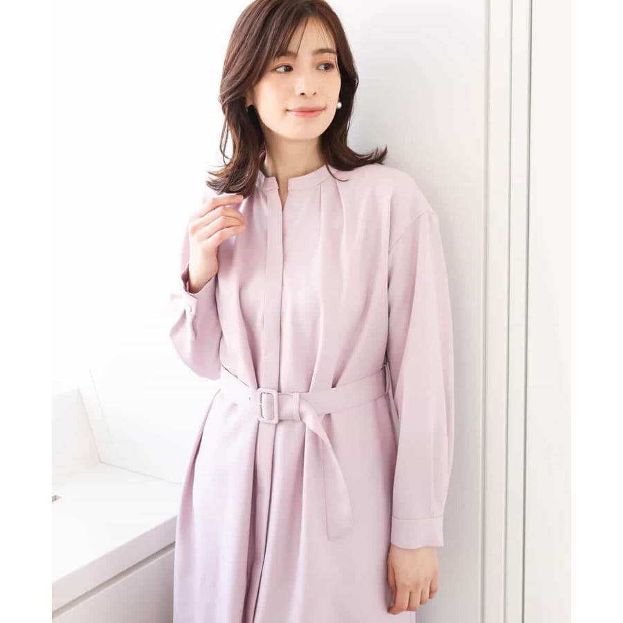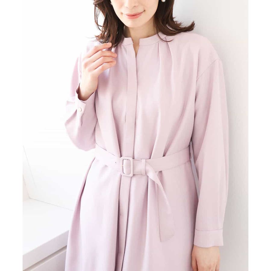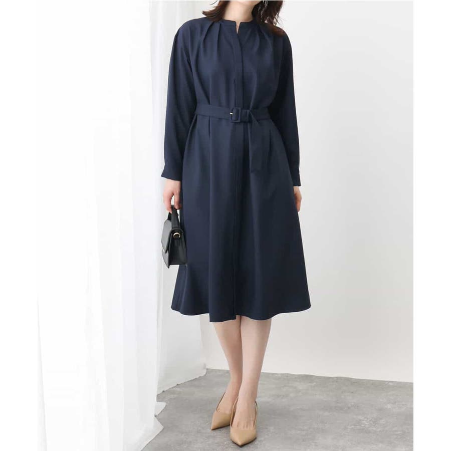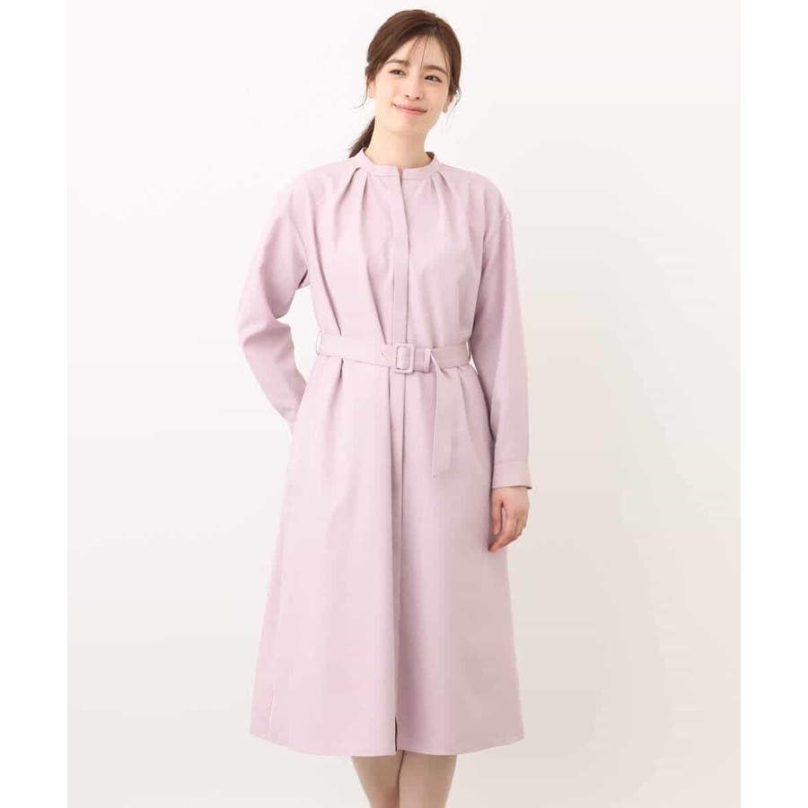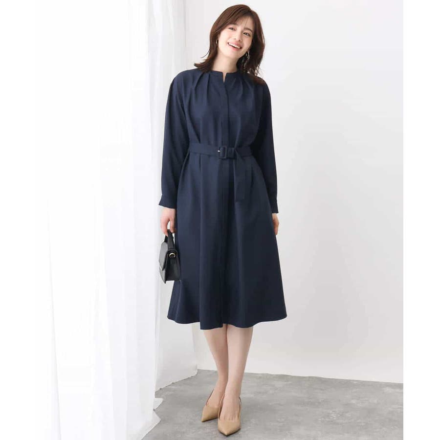 比翼仕立てですっきりときれいな印象の前開きタイプのワンピース。ウエストをベルトでマークすると上品な印象で着こなせます。