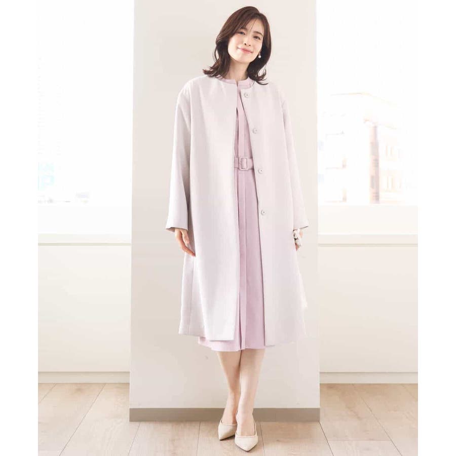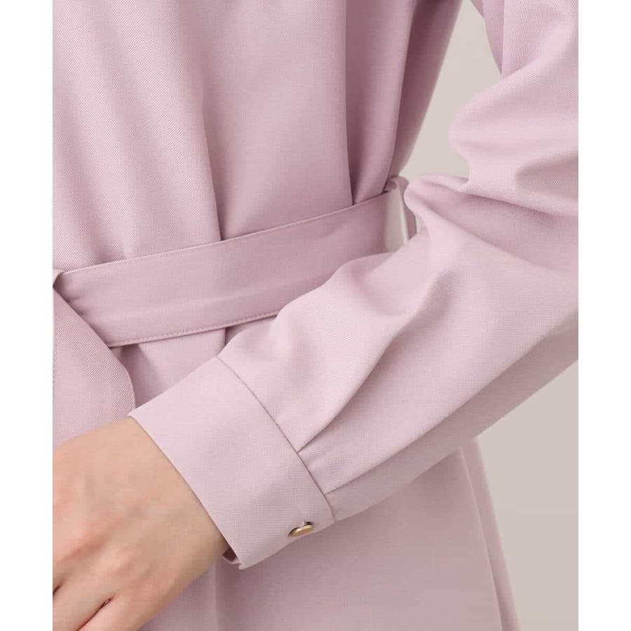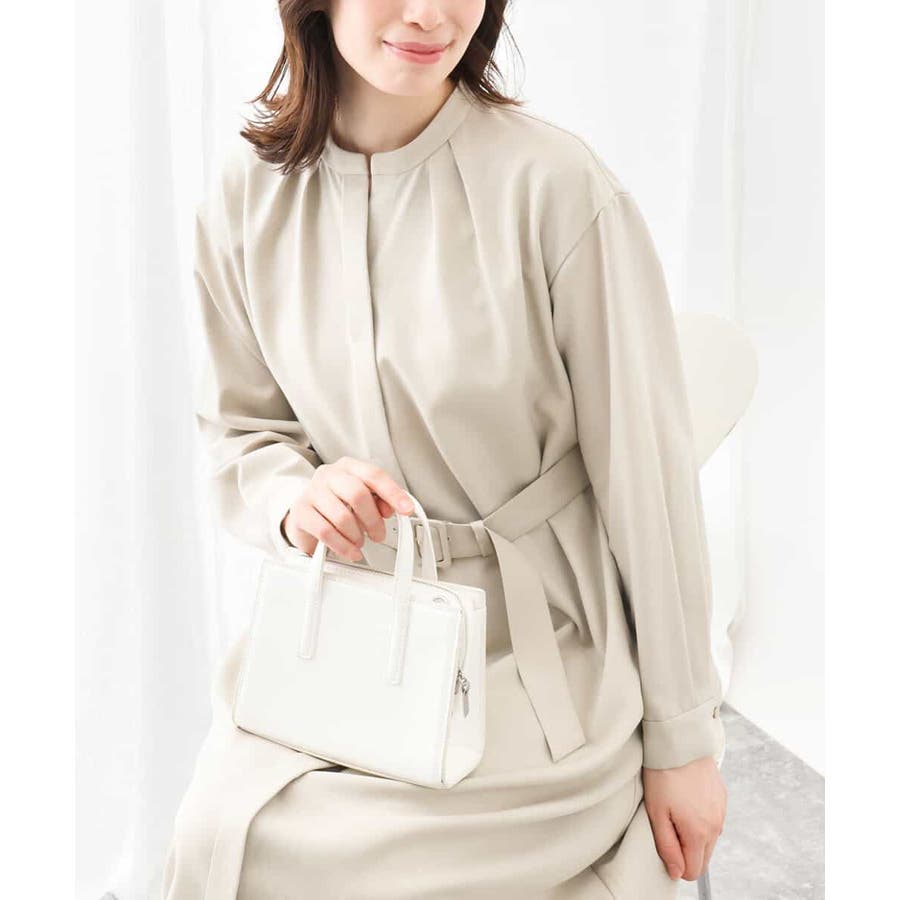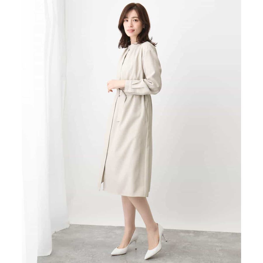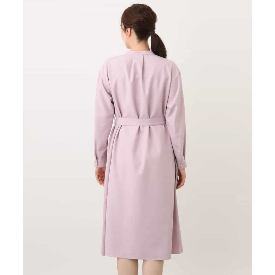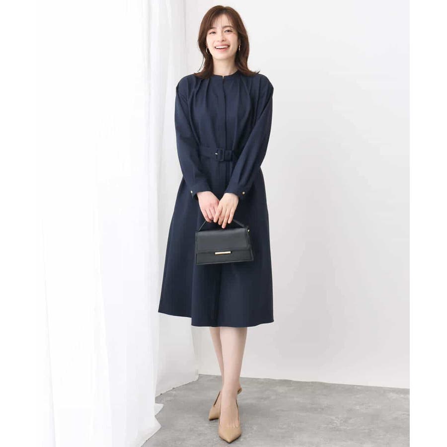 比翼仕立てですっきりときれいな印象の前開きタイプのワンピース。ウエストをベルトでマークすると上品な印象で着こなせます。