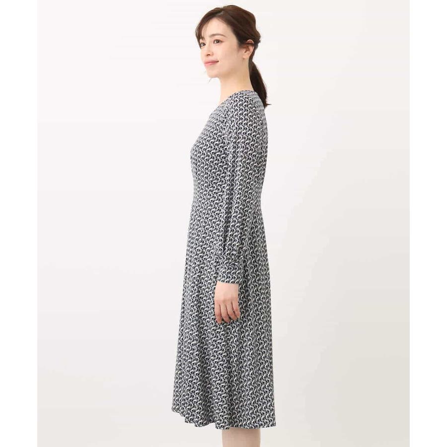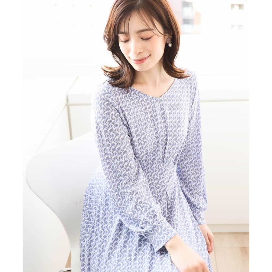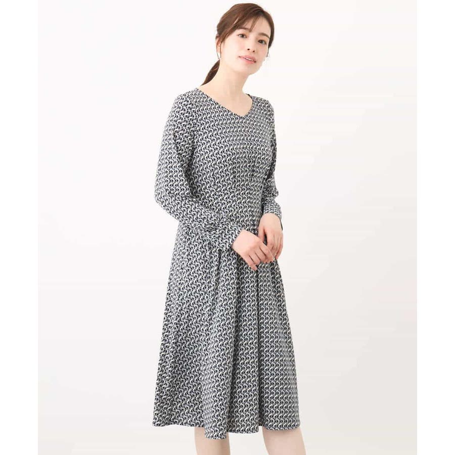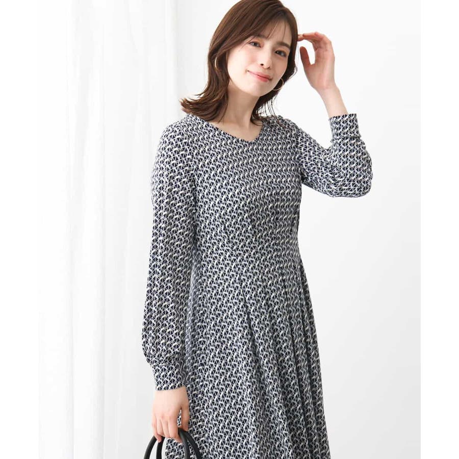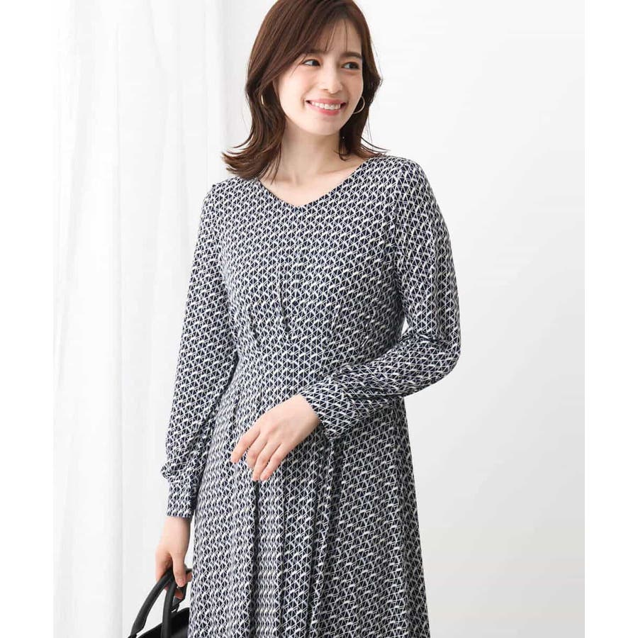 きれいめな雰囲気にぴったりな着る人を選ばないジオメトリック柄のジャージー素材のワンピース。ウエストに向かって入ったタックがきれいなシルエットに。使い勝手の良いカラーが大人な印象で着こなせます。