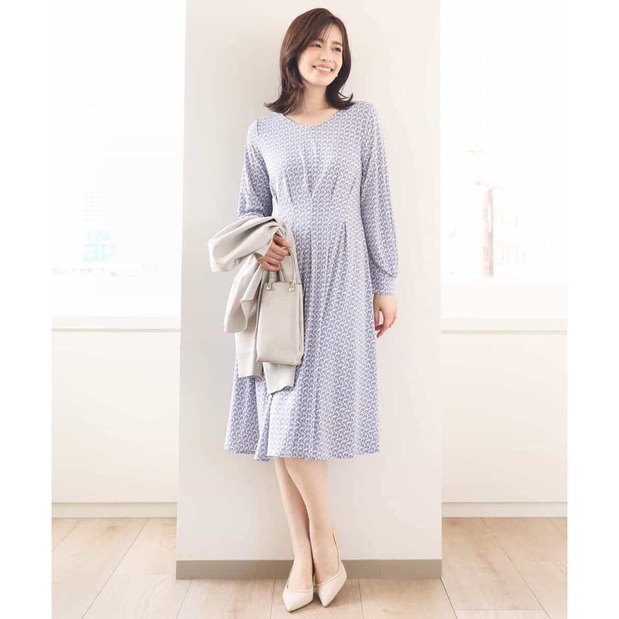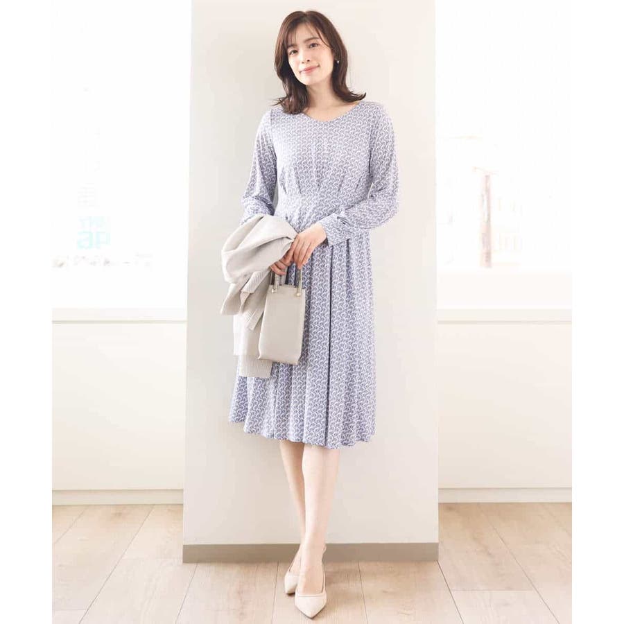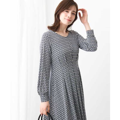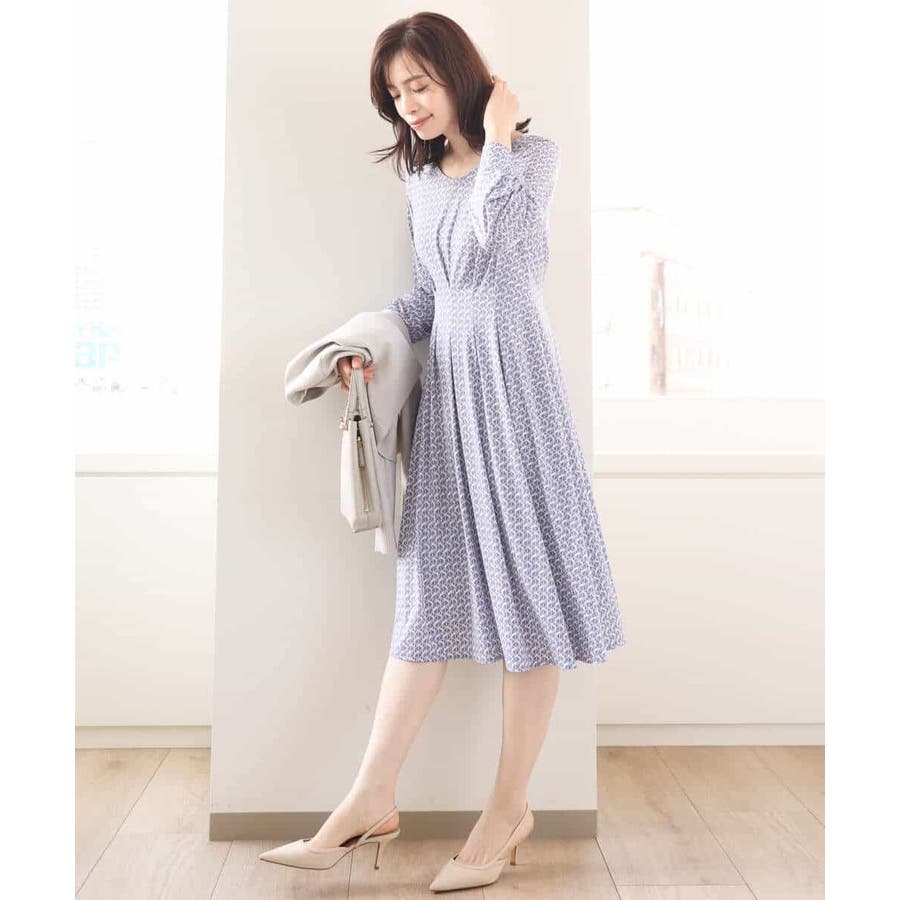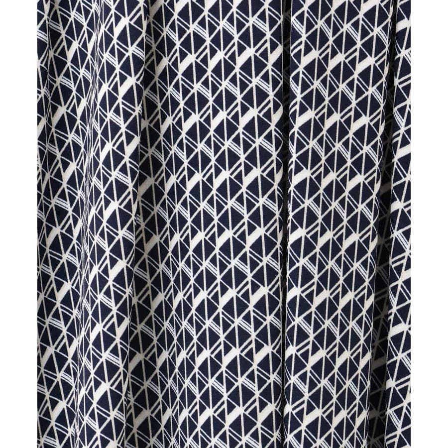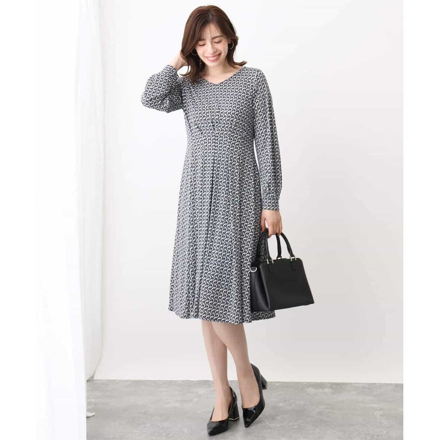 きれいめな雰囲気にぴったりな着る人を選ばないジオメトリック柄のジャージー素材のワンピース。ウエストに向かって入ったタックがきれいなシルエットに。使い勝手の良いカラーが大人な印象で着こなせます。