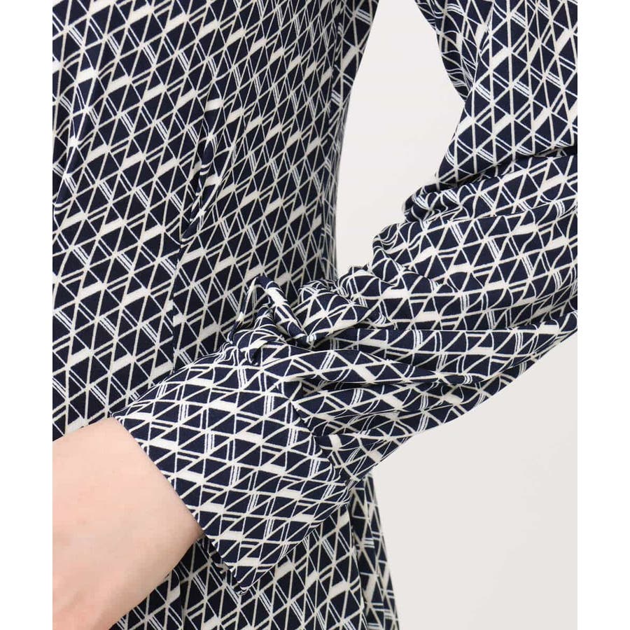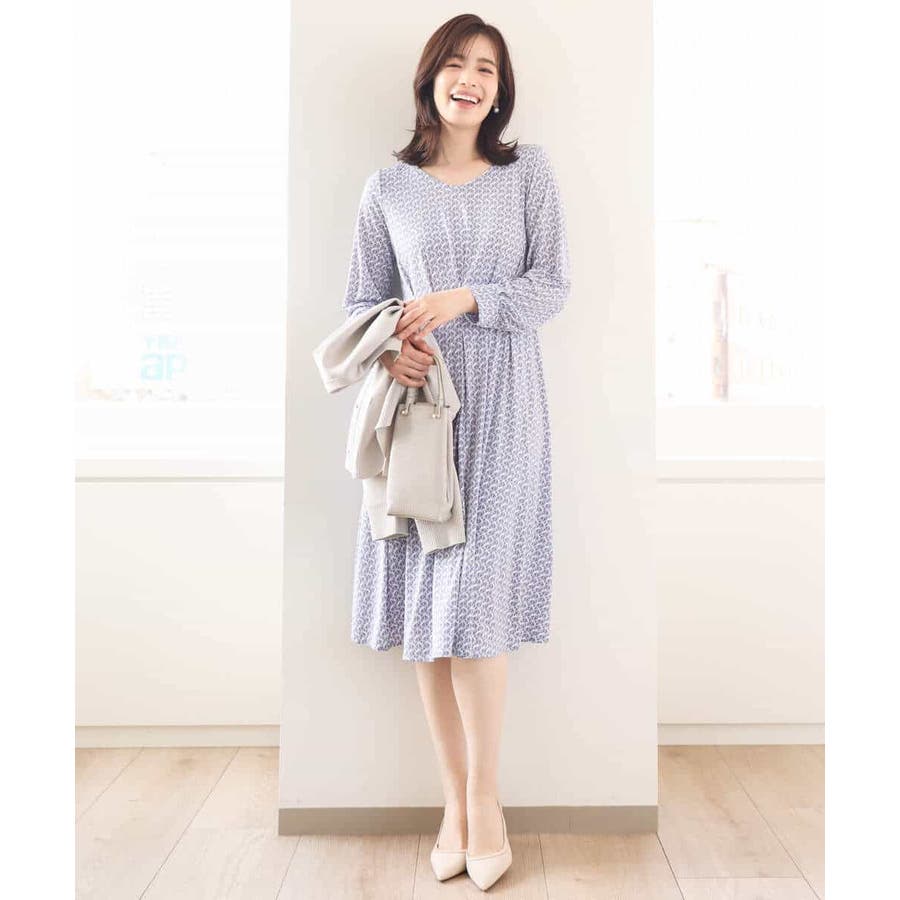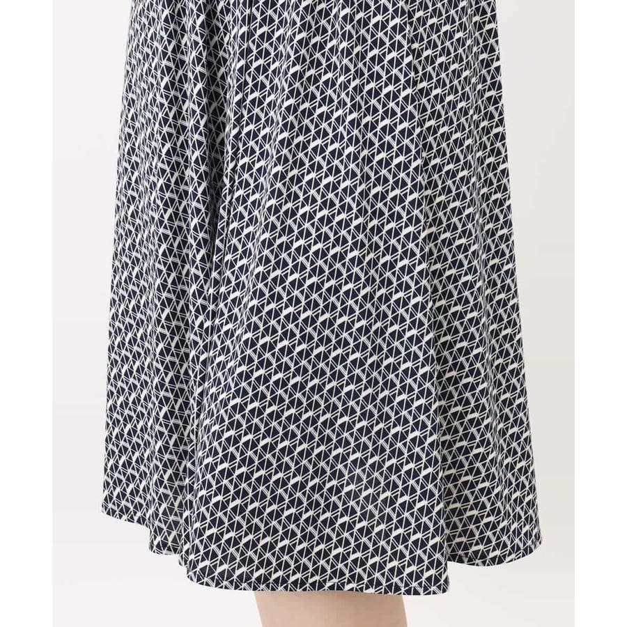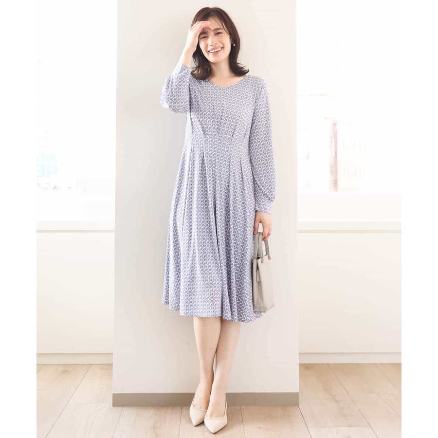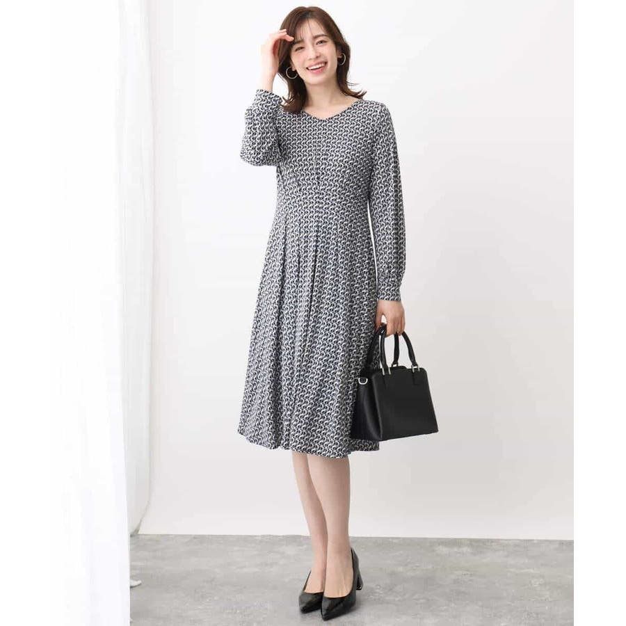 きれいめな雰囲気にぴったりな着る人を選ばないジオメトリック柄のジャージー素材のワンピース。ウエストに向かって入ったタックがきれいなシルエットに。使い勝手の良いカラーが大人な印象で着こなせます。