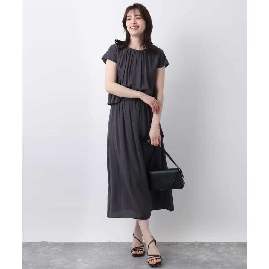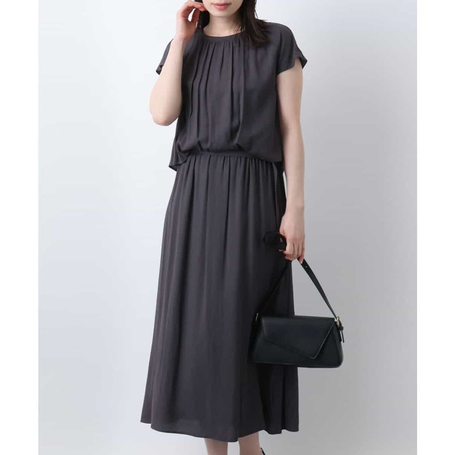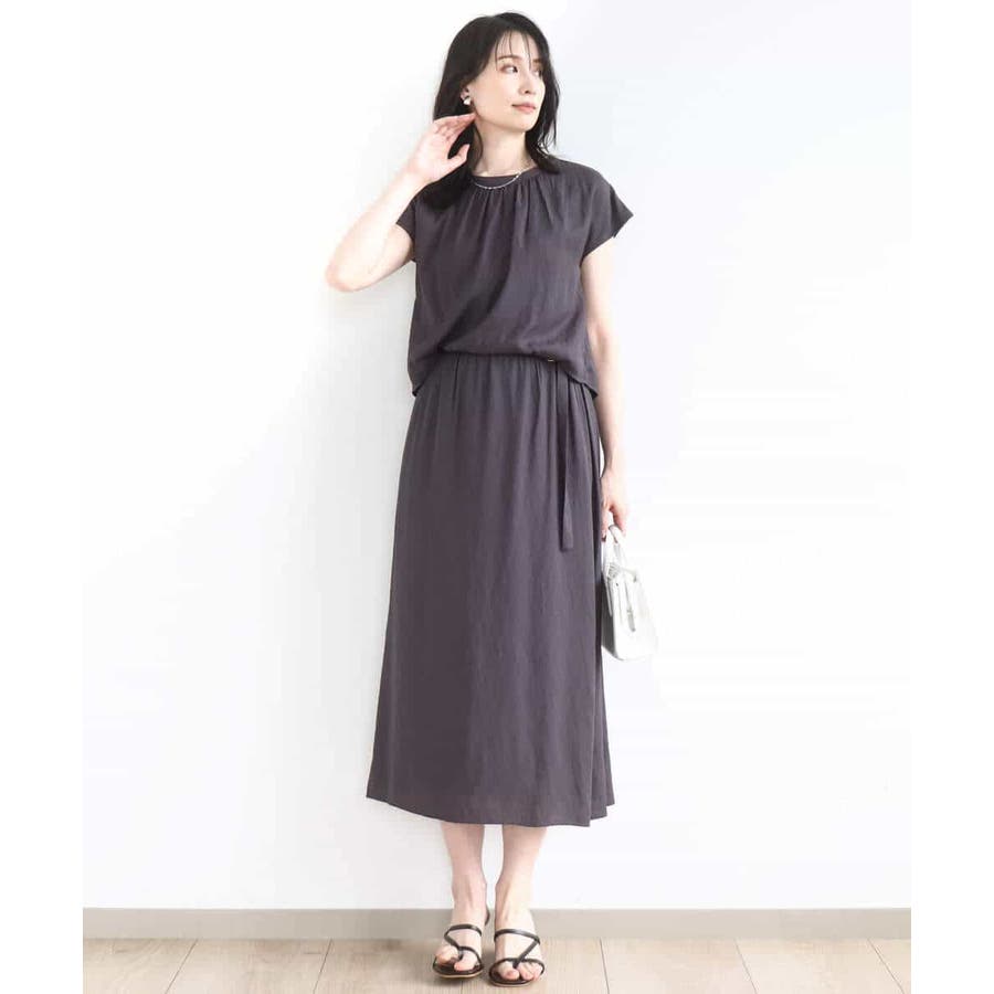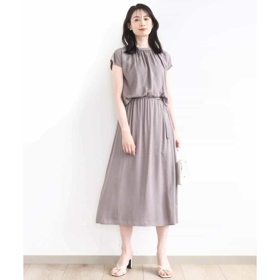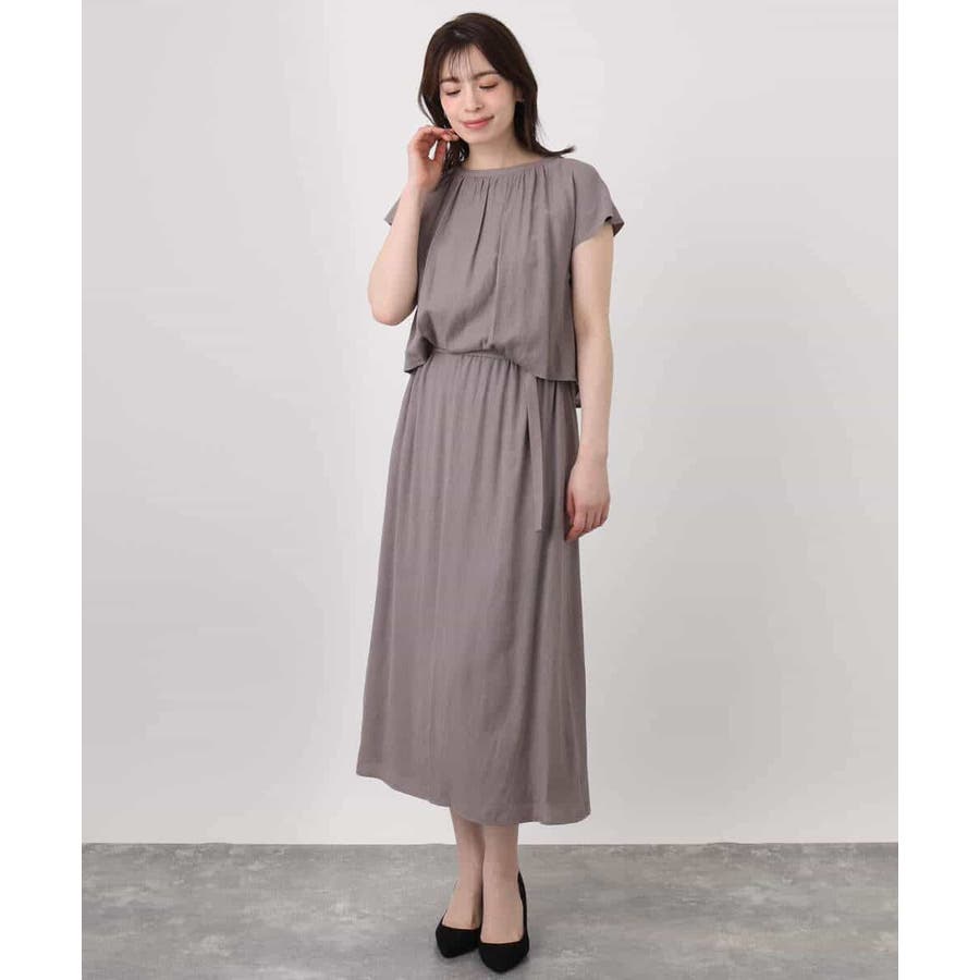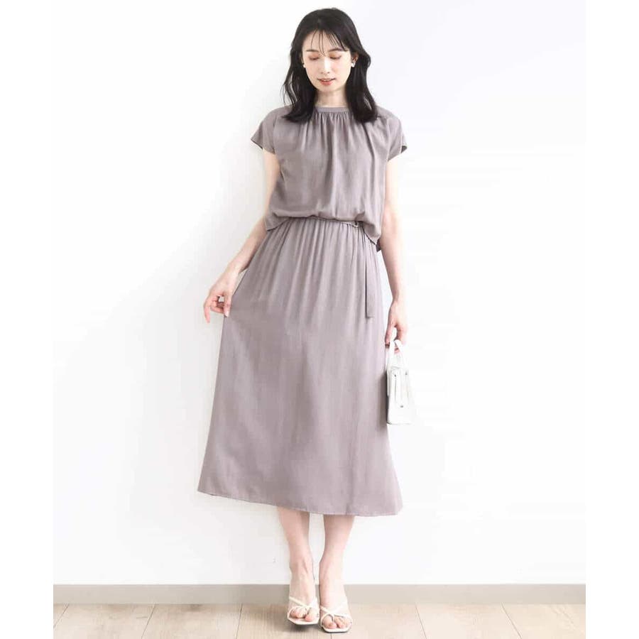 一見セパレートのような見え感のワンピース。ウエスト部分のベルトがメリハリのあるシルエットを叶えてくれます。ネックやスカート部分にギャザーやタックを施し、ふんわりと女性らしいシルエットが魅力。