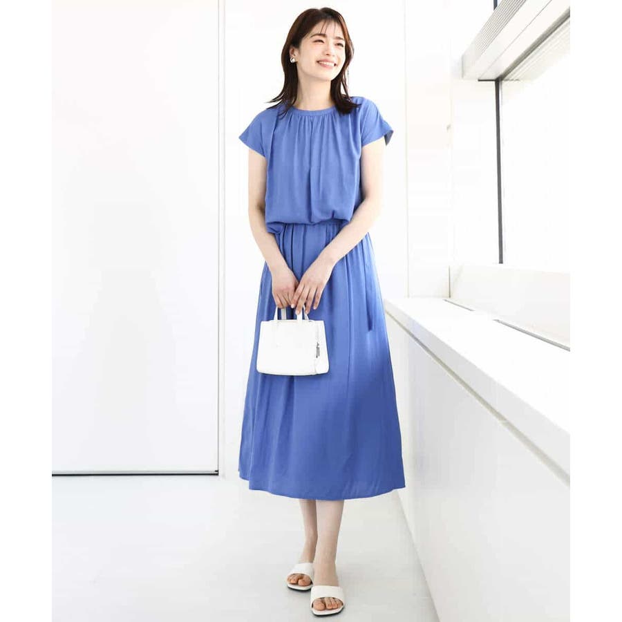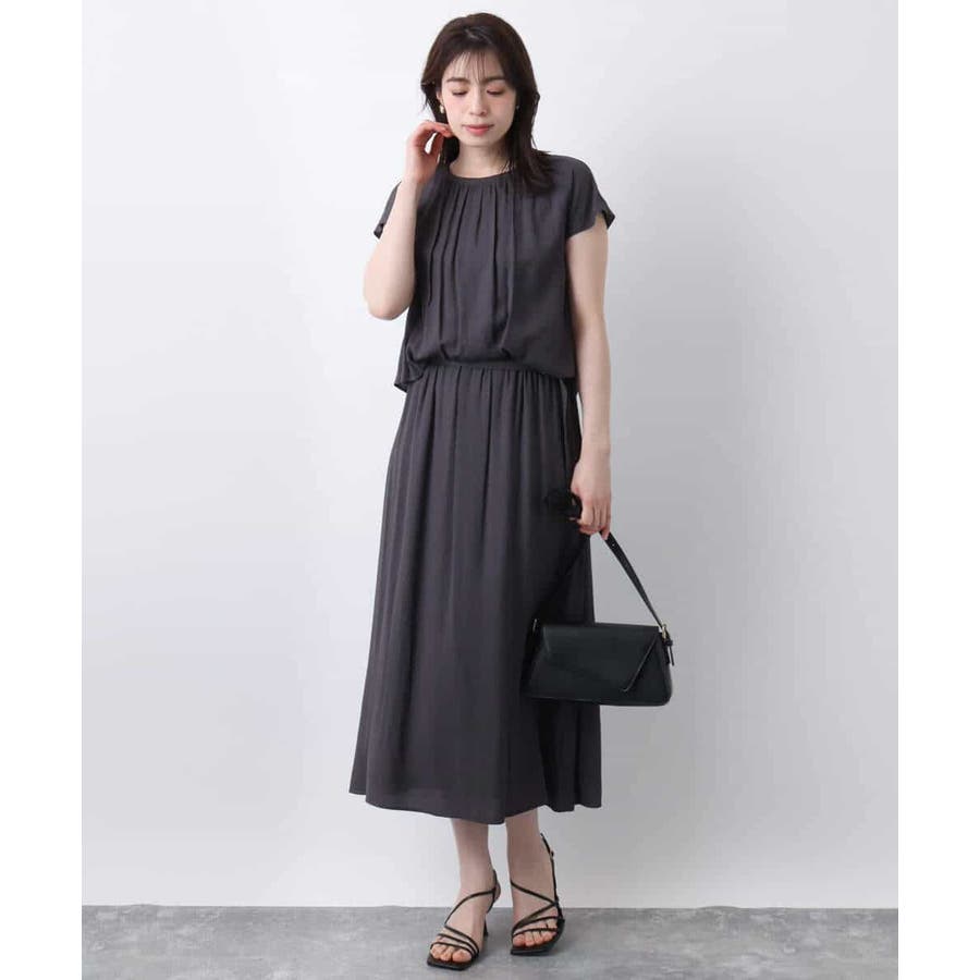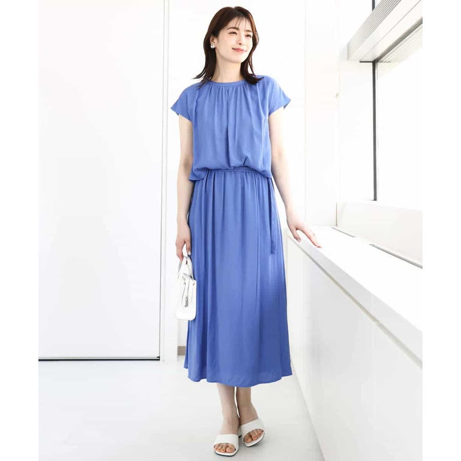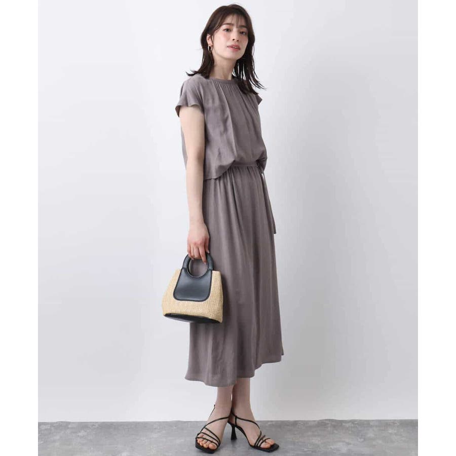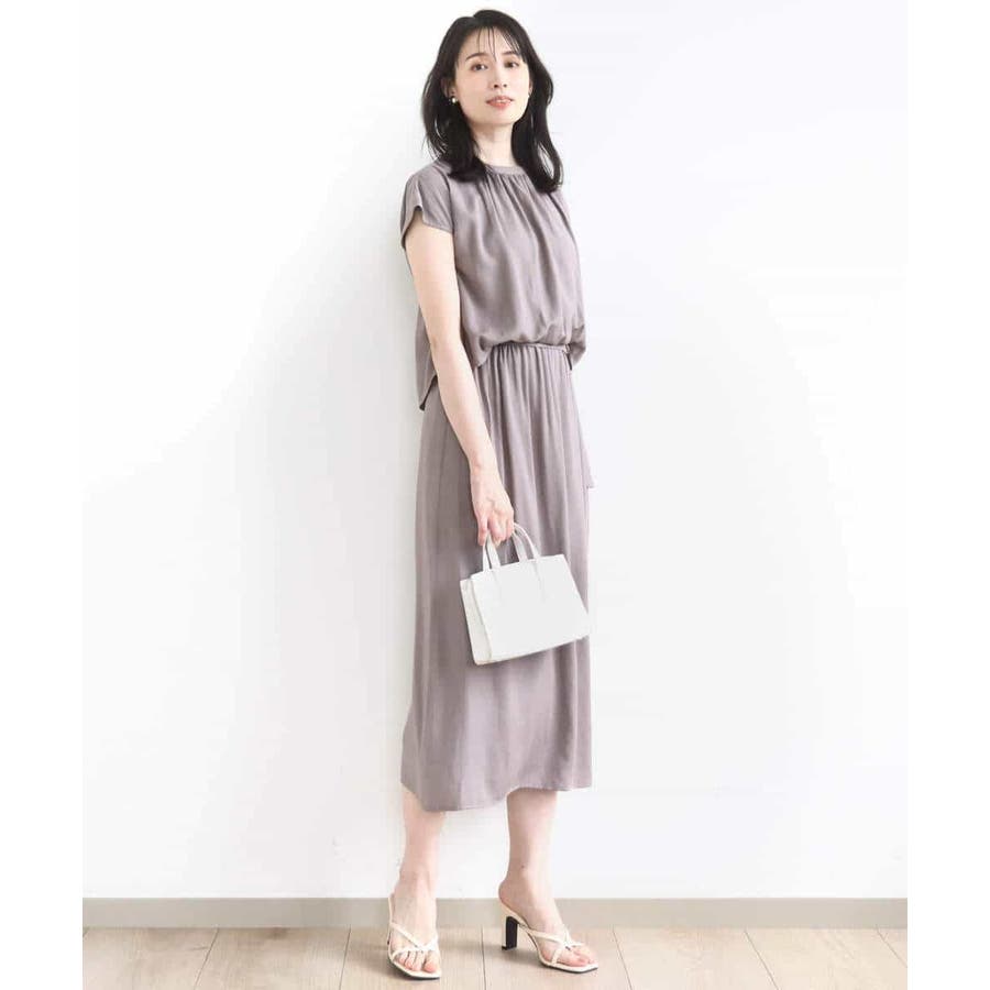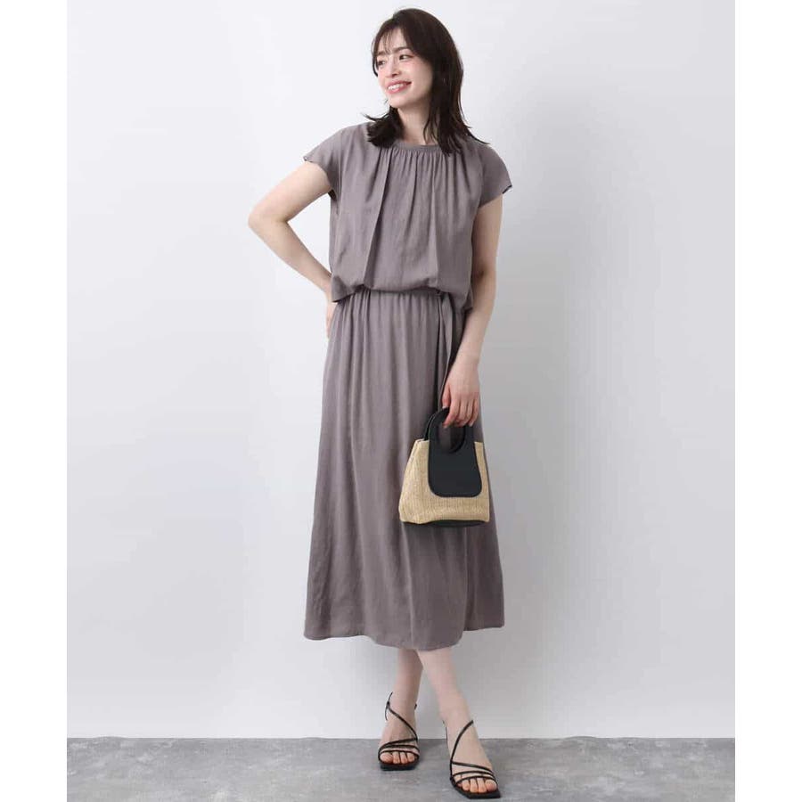 一見セパレートのような見え感のワンピース。ウエスト部分のベルトがメリハリのあるシルエットを叶えてくれます。ネックやスカート部分にギャザーやタックを施し、ふんわりと女性らしいシルエットが魅力。