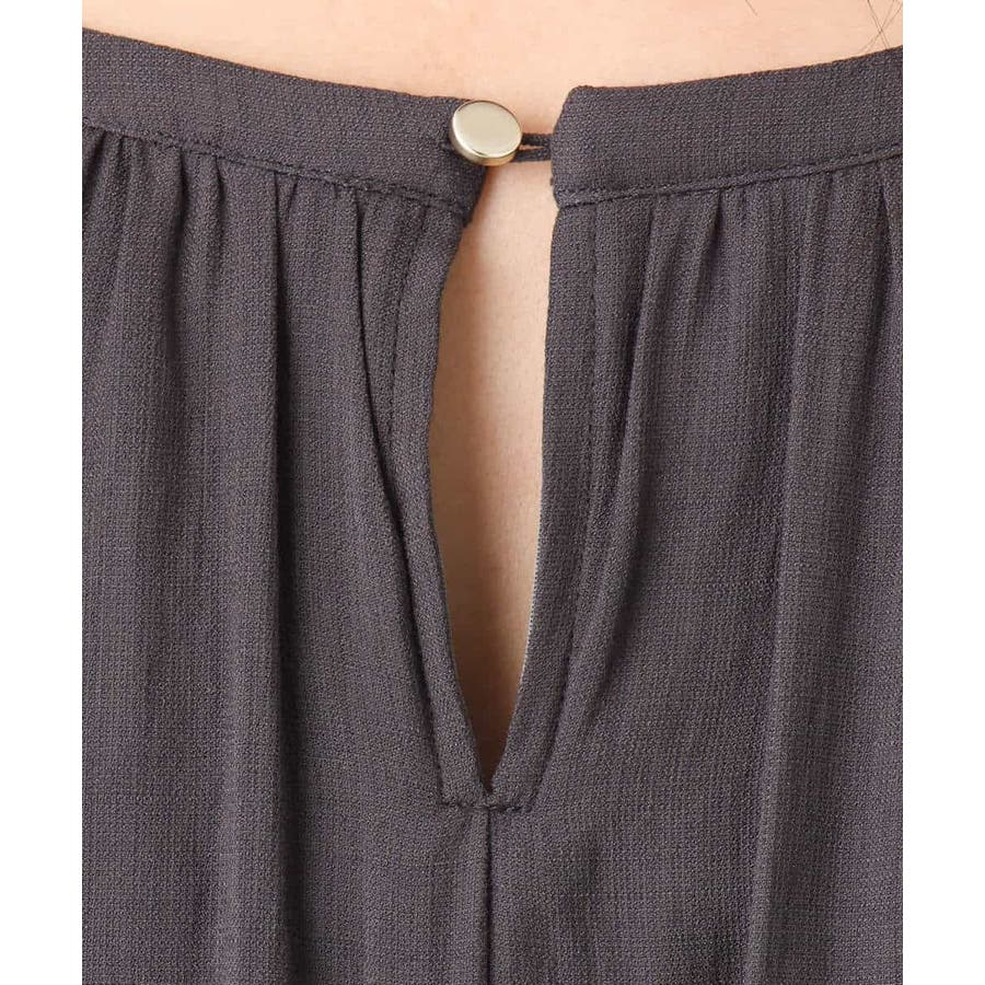 リネンのような表面感と清涼感のある素材はポリエステル100なのでシワにもなりにくく扱いやすいのが嬉しい。後ろの身頃とボトム部分がつながる箇所はゴムになっているので着心地の良さも◎
