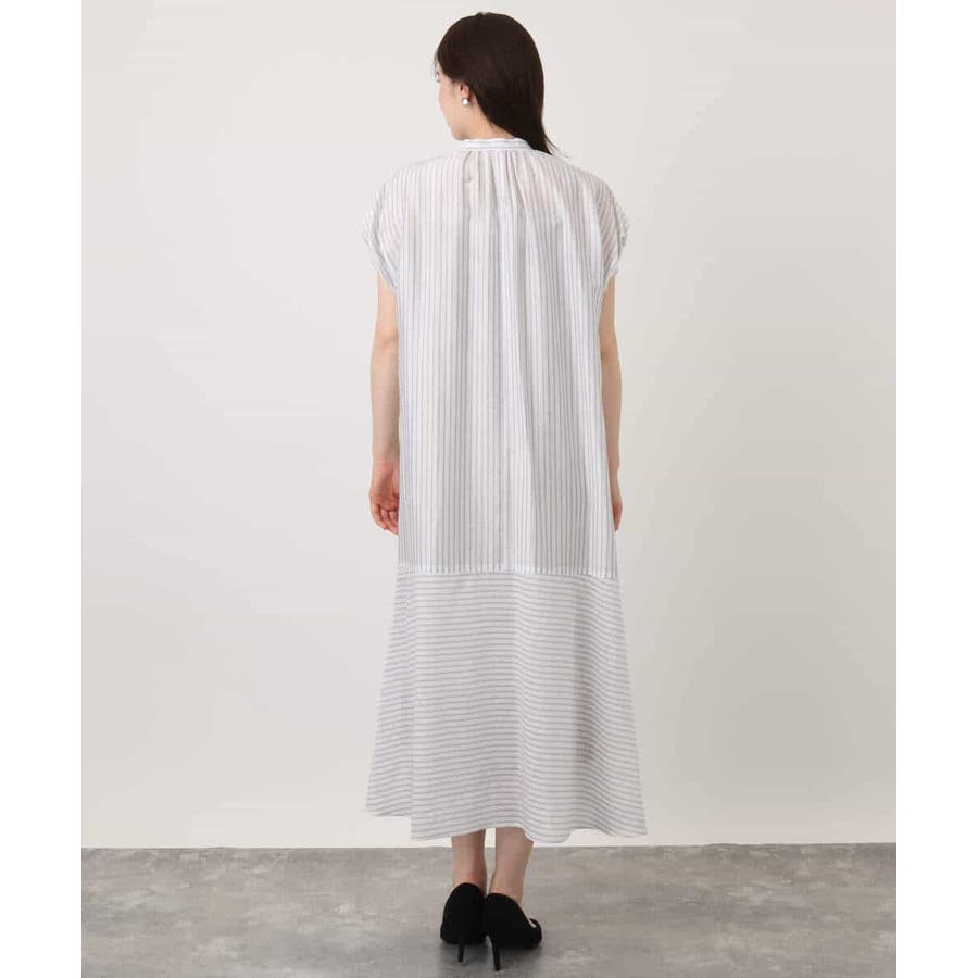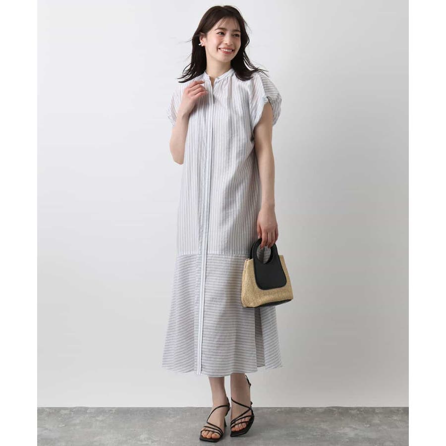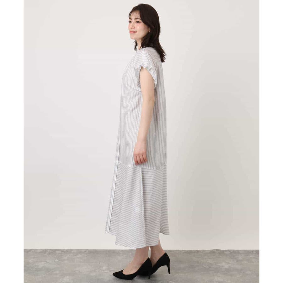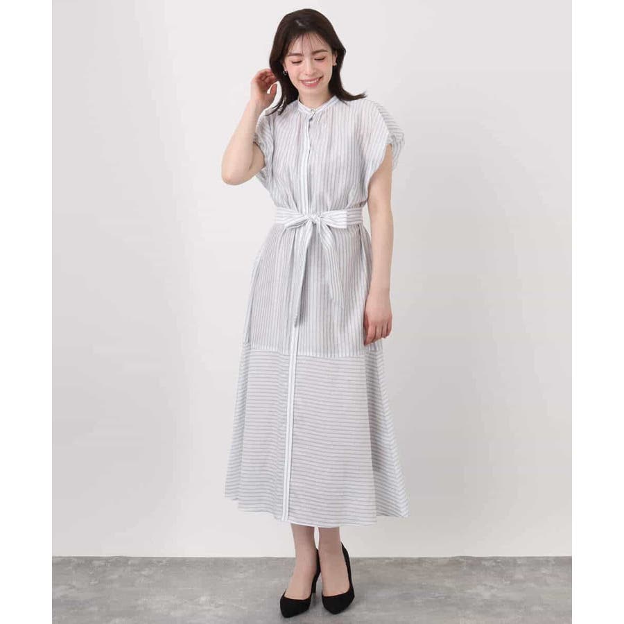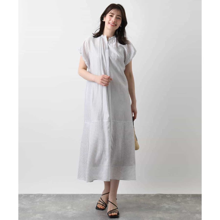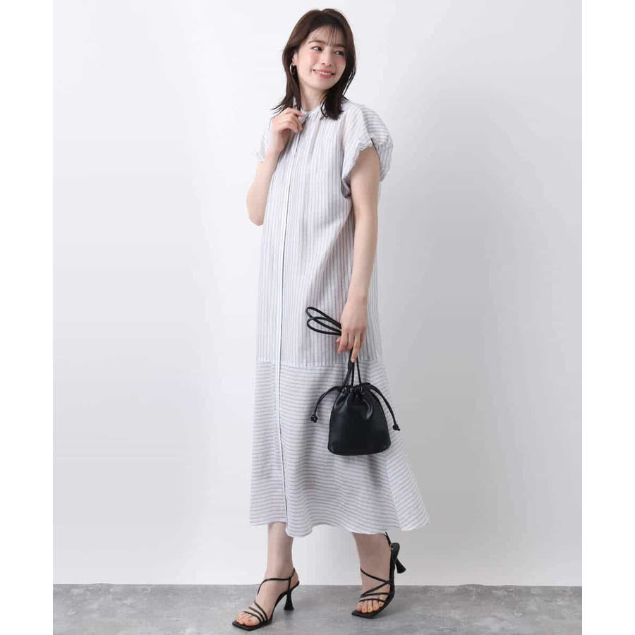 ストライプを切り替えたデザインが新鮮なワンピース。ボリュームのある袖デザインですが、短めの袖丈ですっきりと着こなせます。ウエストのリボンを外せばまた雰囲気を変えた着こなしに。前開きタイプのようなデザインですが、釦は上部のみとなり、スカート部分の隙間からインナーが覗く心配もありません。
