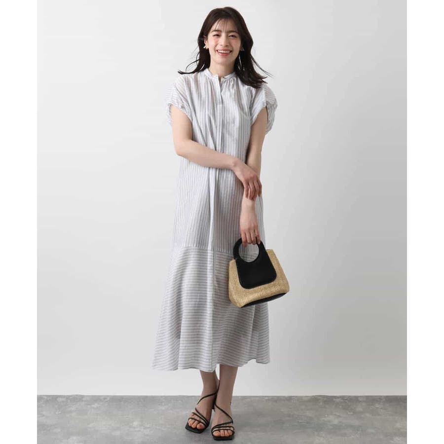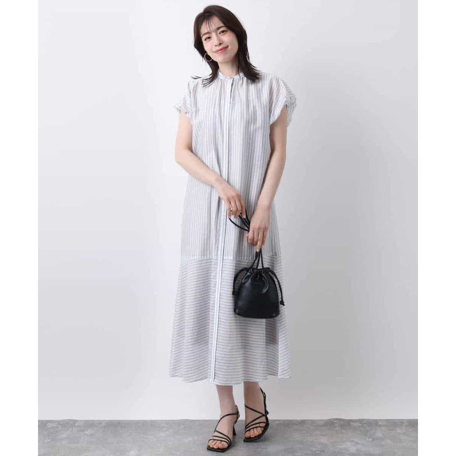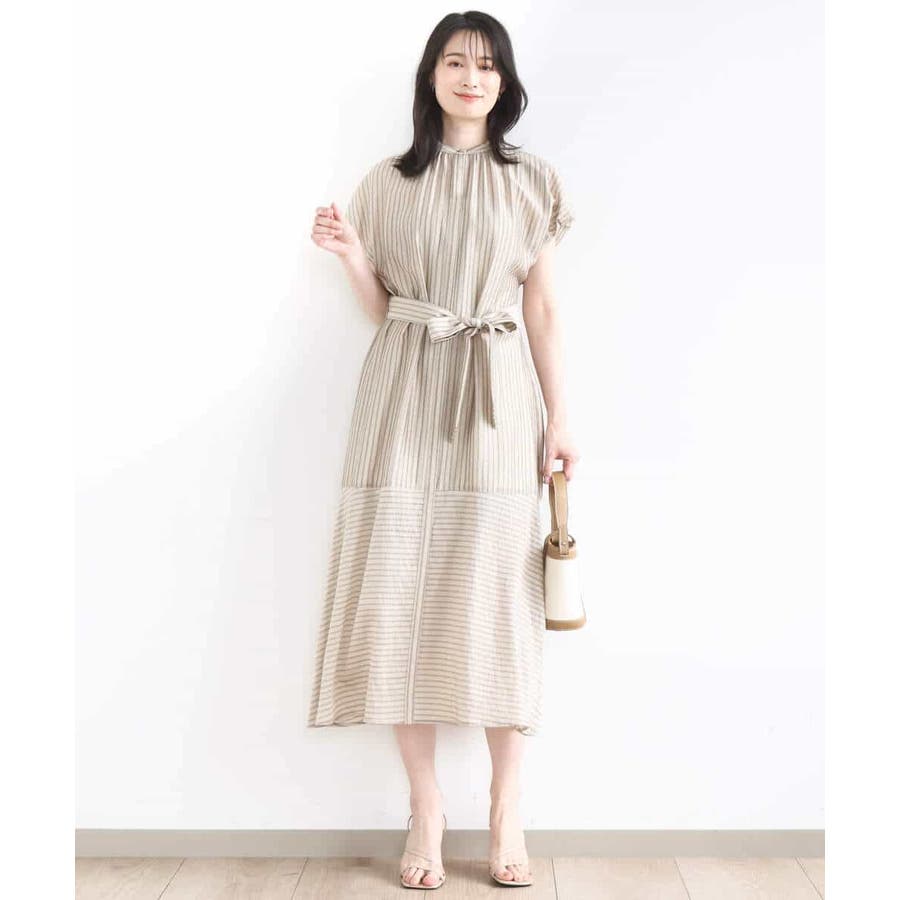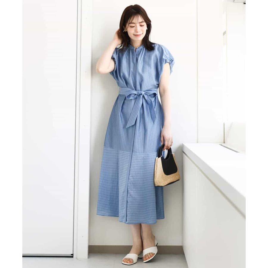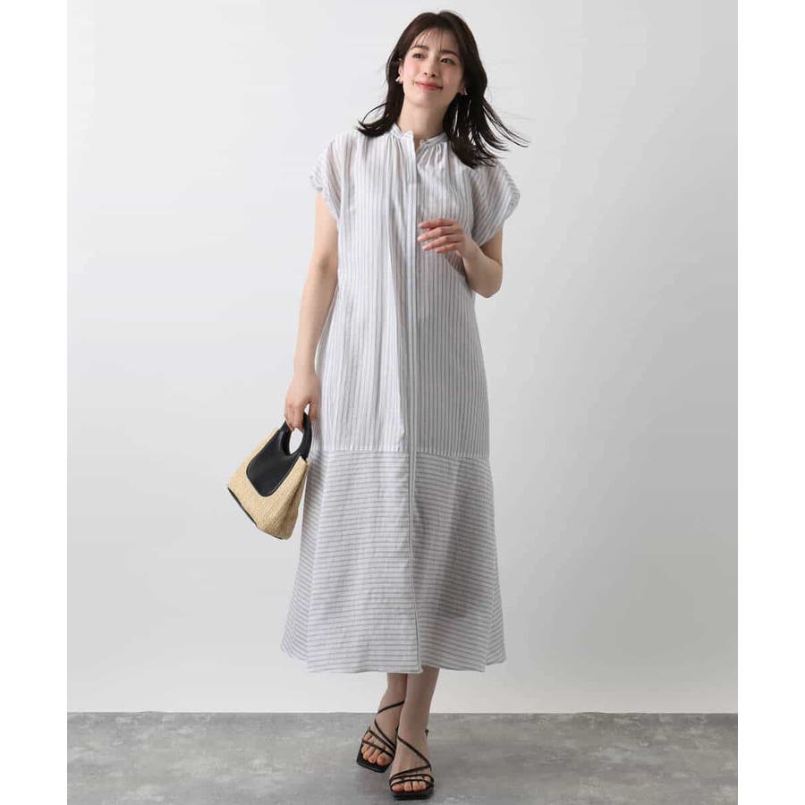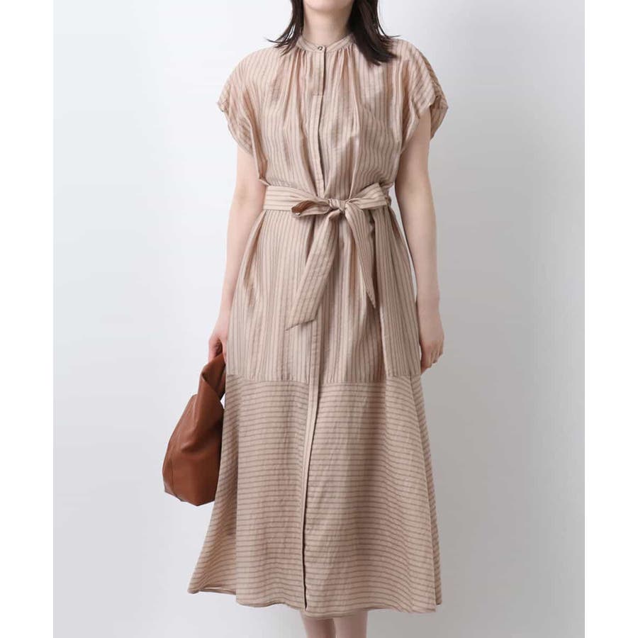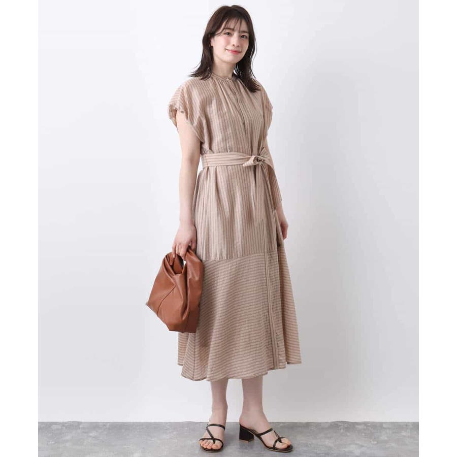 ストライプを切り替えたデザインが新鮮なワンピース。ボリュームのある袖デザインですが、短めの袖丈ですっきりと着こなせます。ウエストのリボンを外せばまた雰囲気を変えた着こなしに。前開きタイプのようなデザインですが、釦は上部のみとなり、スカート部分の隙間からインナーが覗く心配もありません。