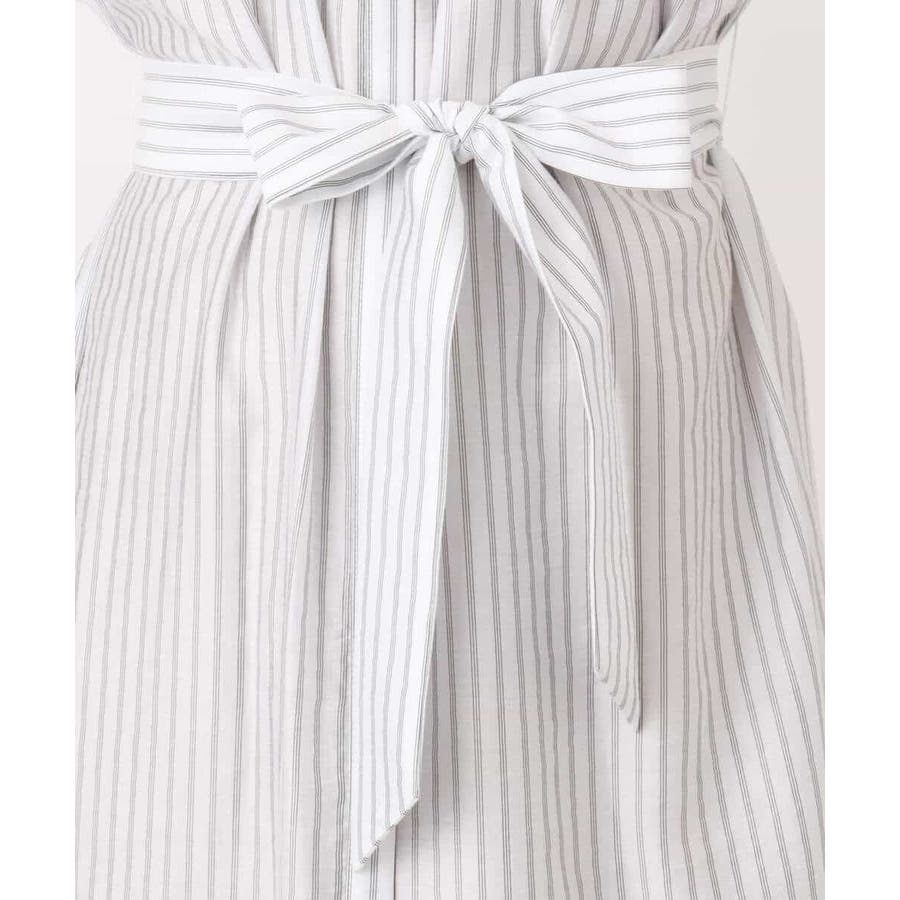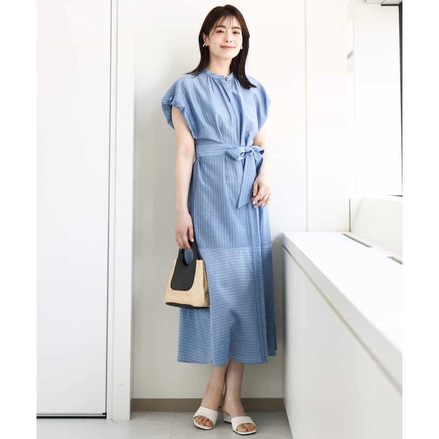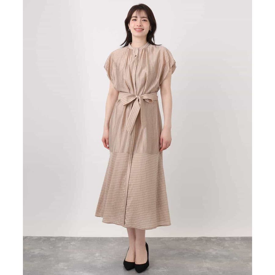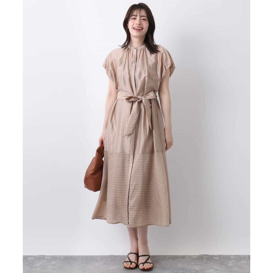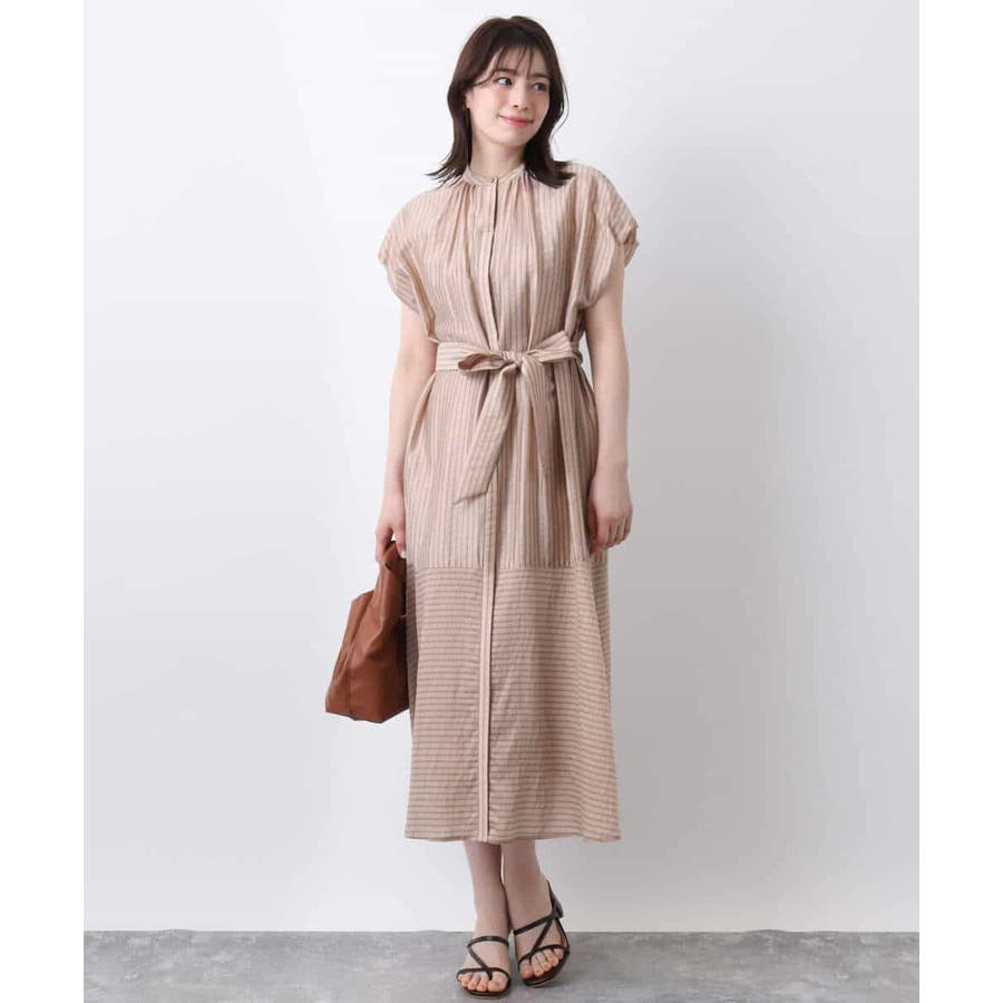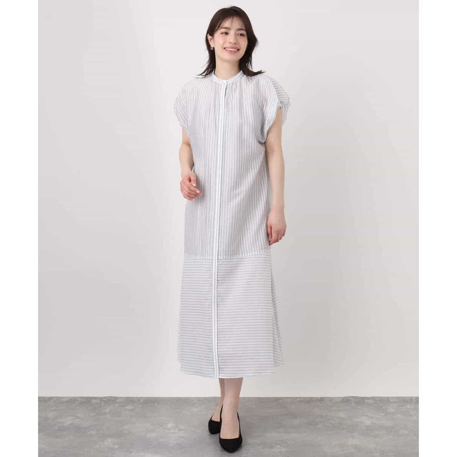 ストライプを切り替えたデザインが新鮮なワンピース。ボリュームのある袖デザインですが、短めの袖丈ですっきりと着こなせます。ウエストのリボンを外せばまた雰囲気を変えた着こなしに。前開きタイプのようなデザインですが、釦は上部のみとなり、スカート部分の隙間からインナーが覗く心配もありません。
