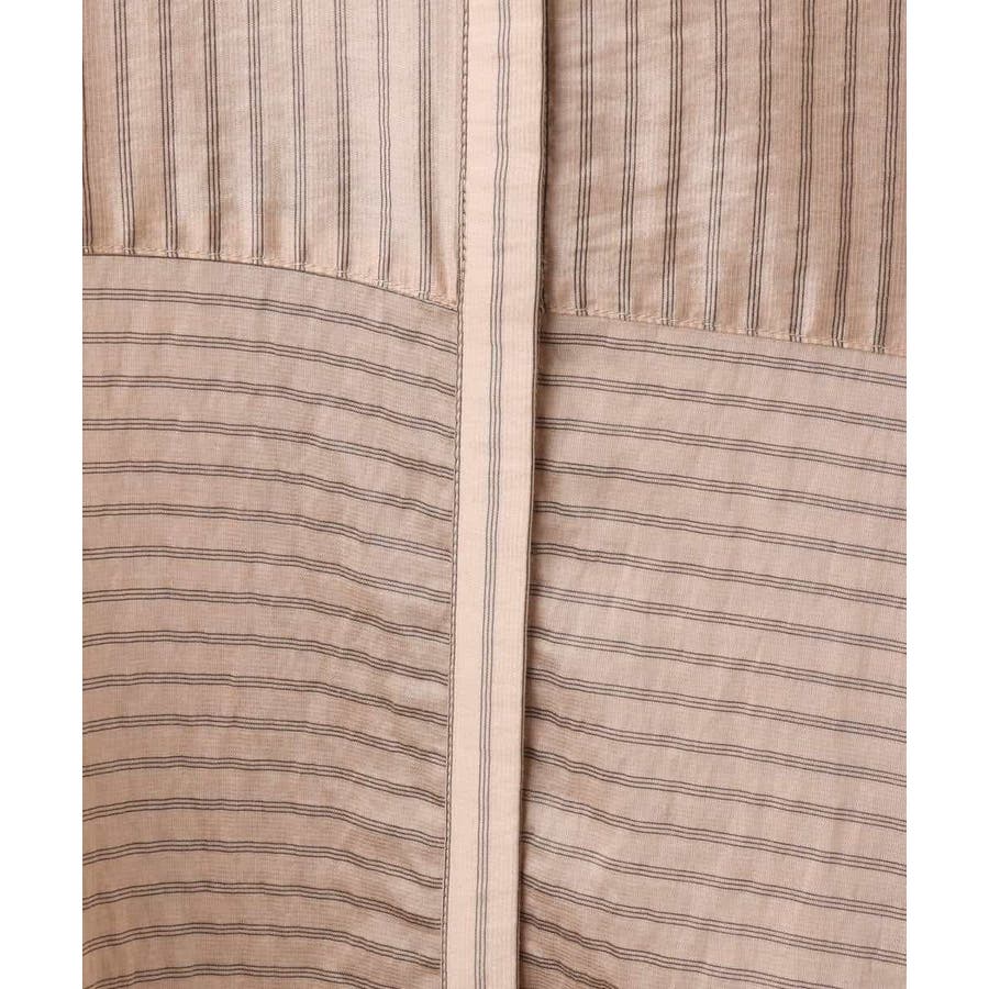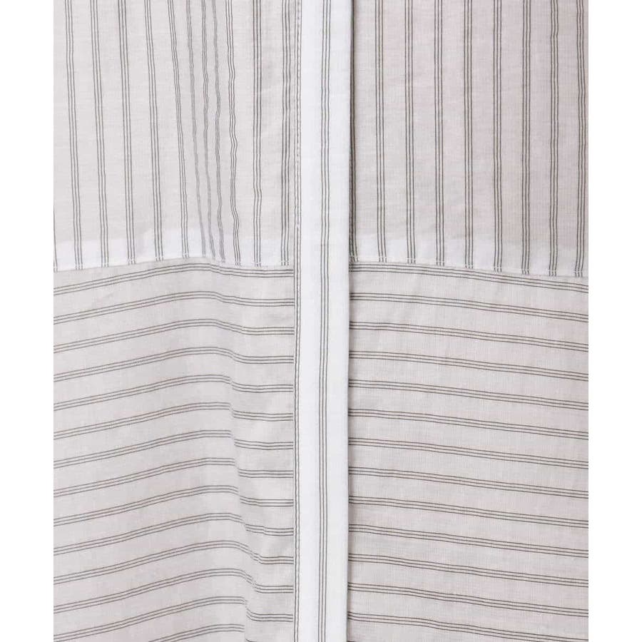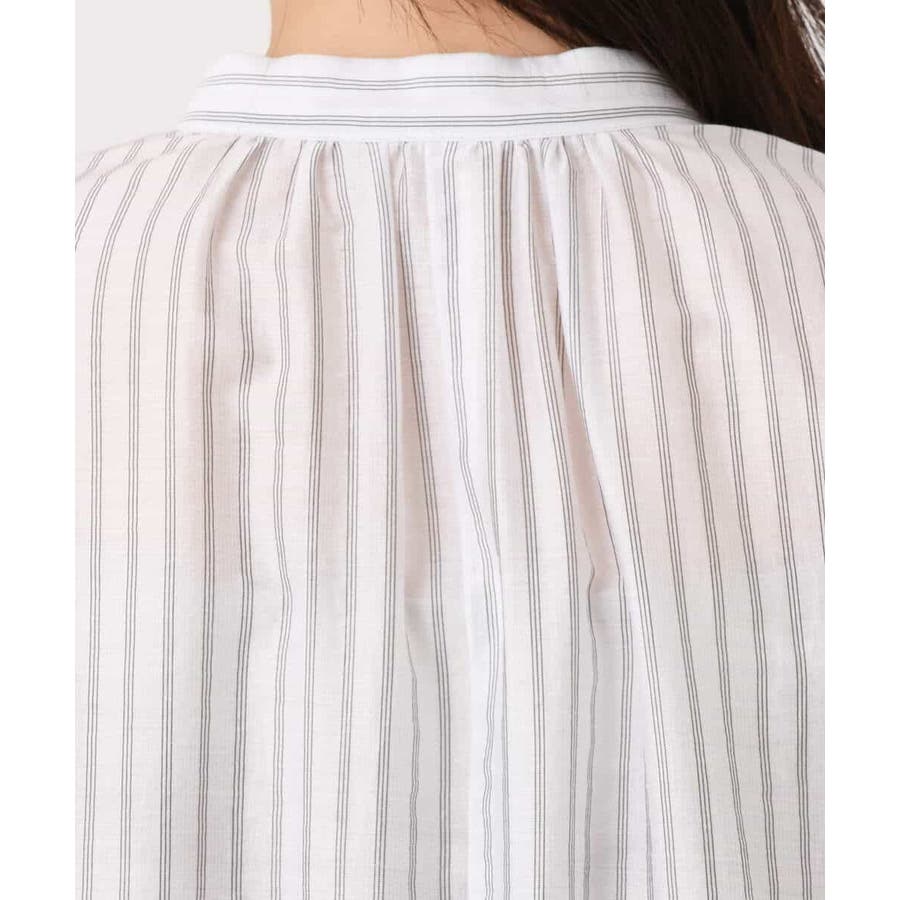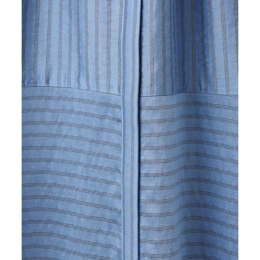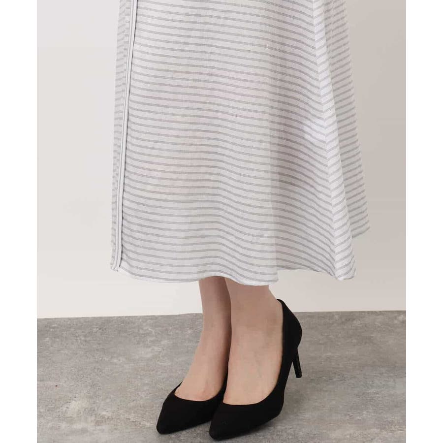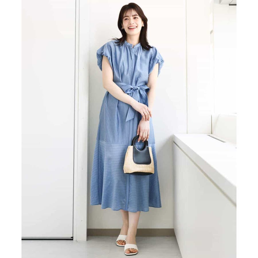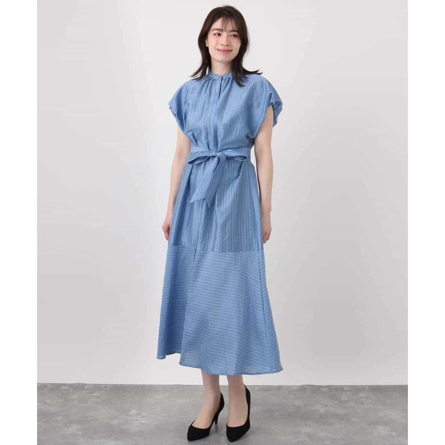 ストライプを切り替えたデザインが新鮮なワンピース。ボリュームのある袖デザインですが、短めの袖丈ですっきりと着こなせます。ウエストのリボンを外せばまた雰囲気を変えた着こなしに。前開きタイプのようなデザインですが、釦は上部のみとなり、スカート部分の隙間からインナーが覗く心配もありません。