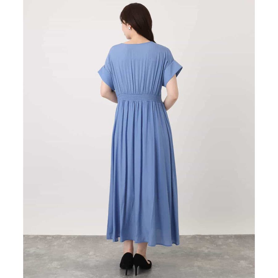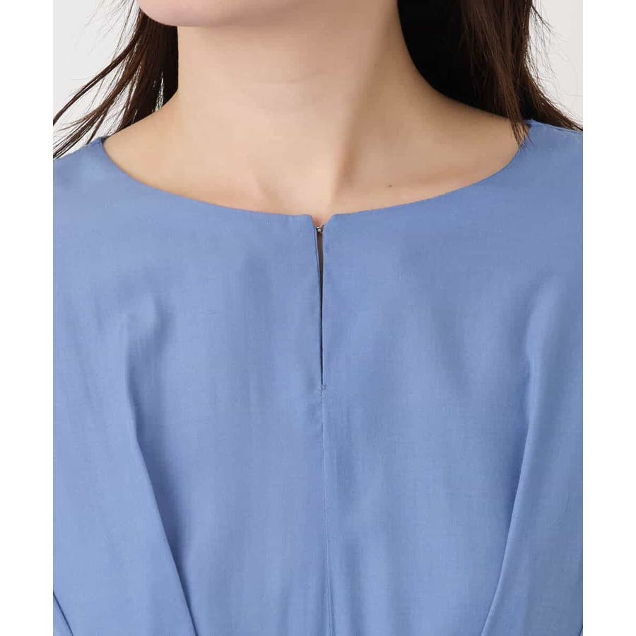 高めの位置のウエスト切り替えできれいなシルエットが特徴のワンピース。後ろウエスト部分はゴム仕様なので着心地もラクチン。衿部分はホックデザインになっており、留めても、開けてキーネックとしても雰囲気を変えて着こなしを楽しめます。