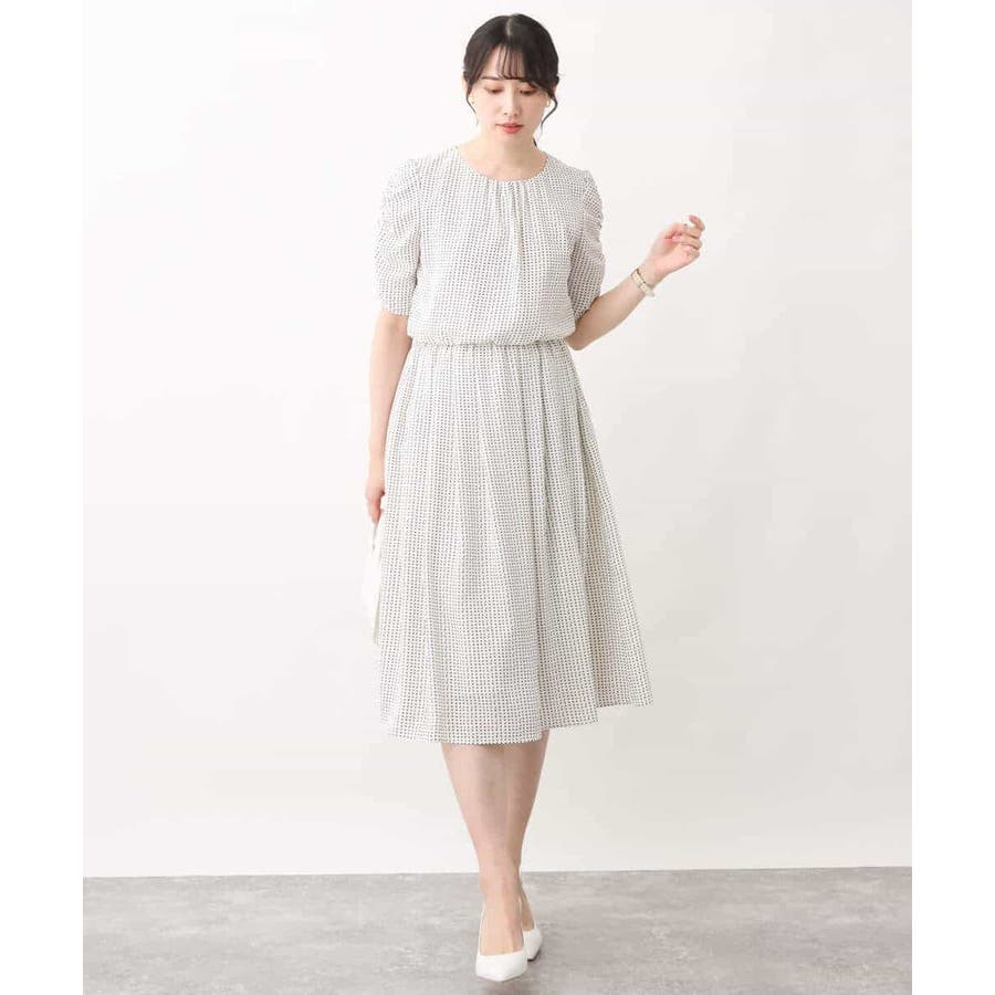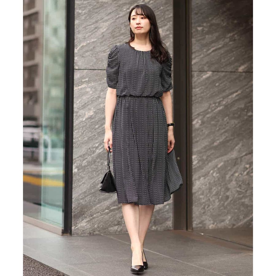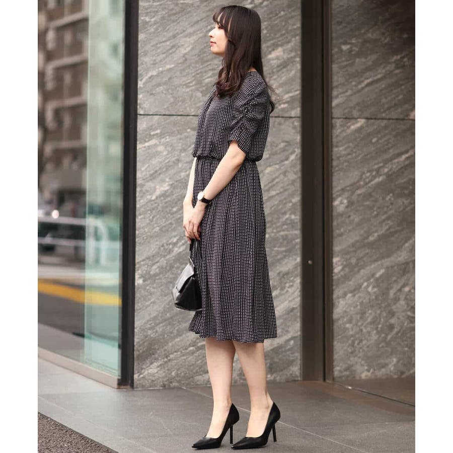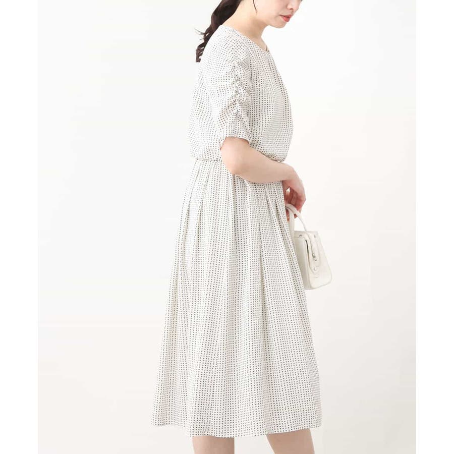 袖のギャザーデザインが特徴の五分袖ワンピース。変形ドットのプリントが甘すぎず上品に着こなせます。ウエスト部分はゴム仕様なので、着心地の良さも魅力です。