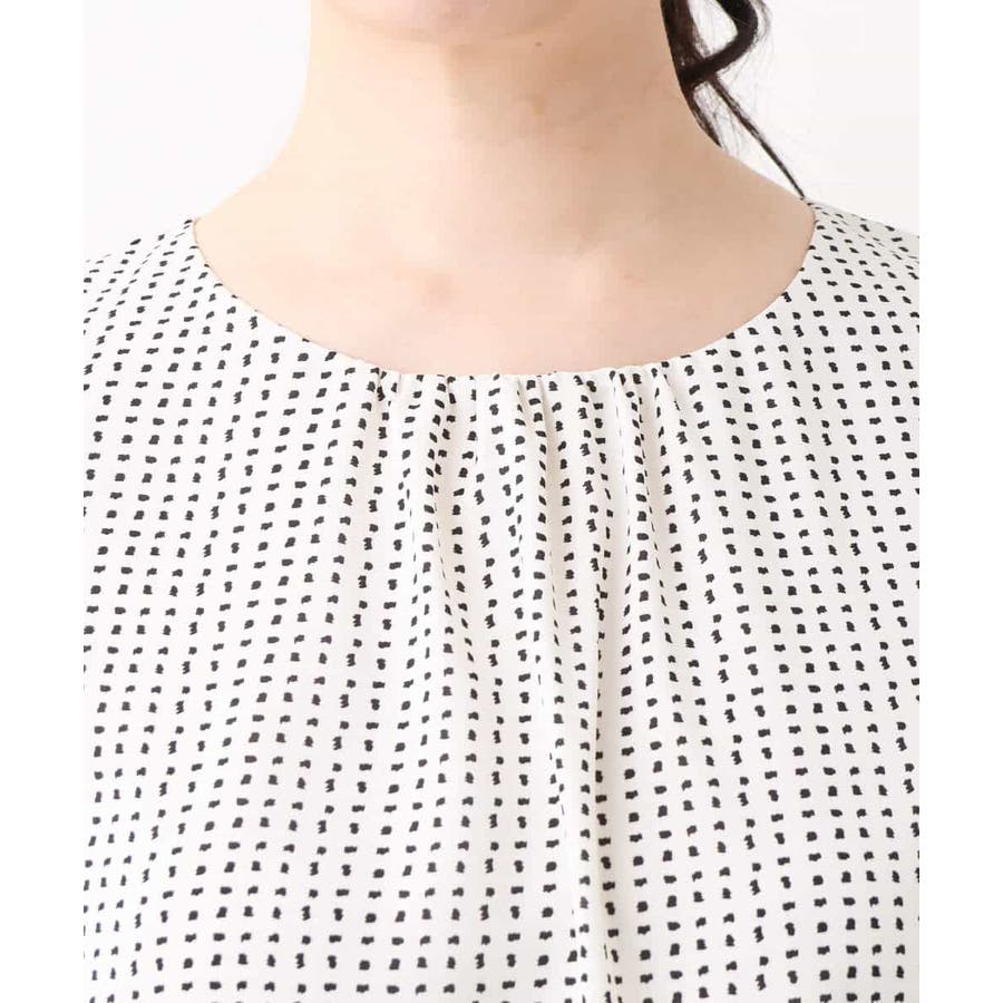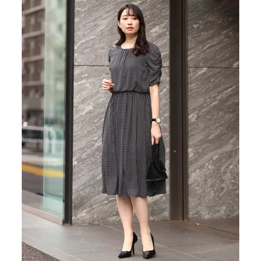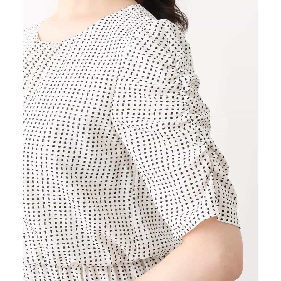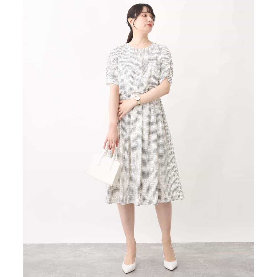 袖のギャザーデザインが特徴の五分袖ワンピース。変形ドットのプリントが甘すぎず上品に着こなせます。ウエスト部分はゴム仕様なので、着心地の良さも魅力です。