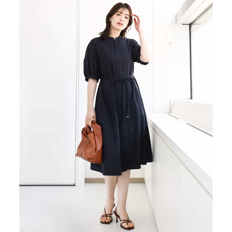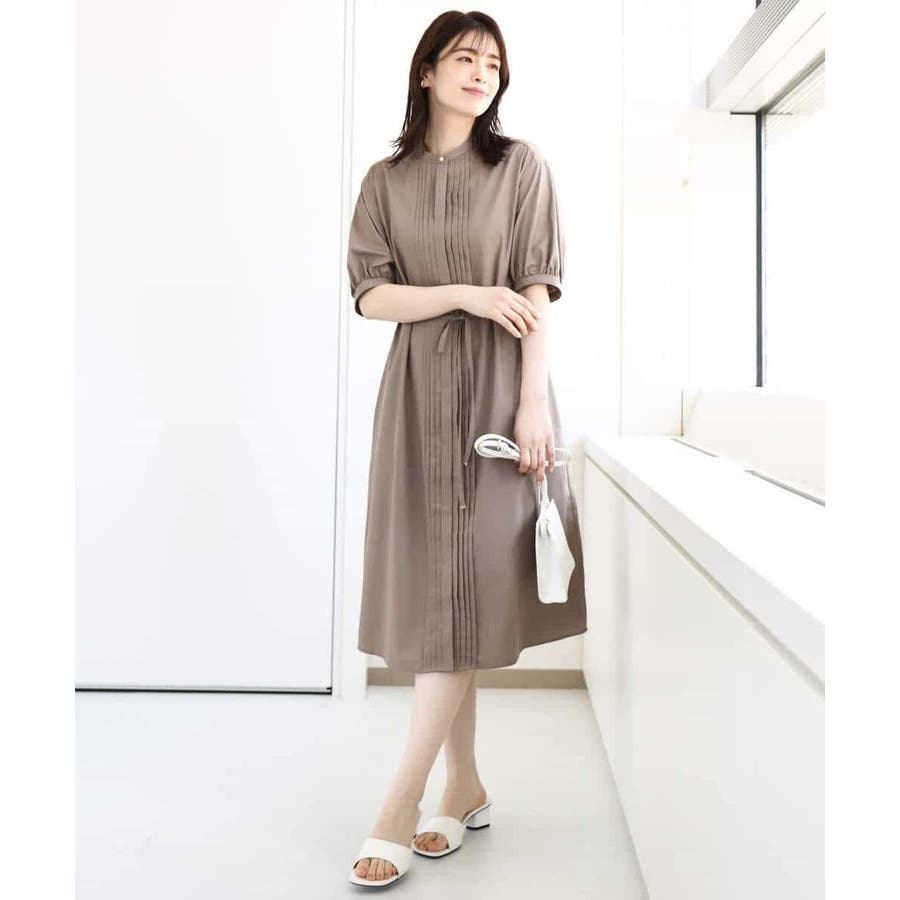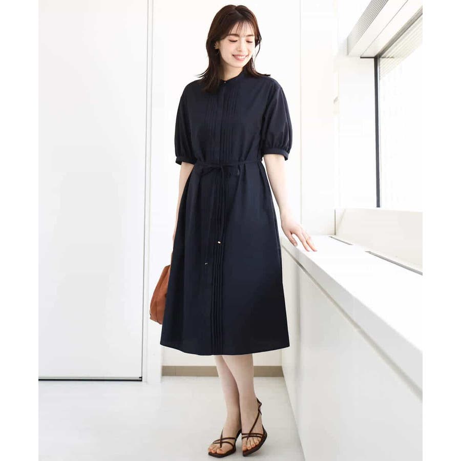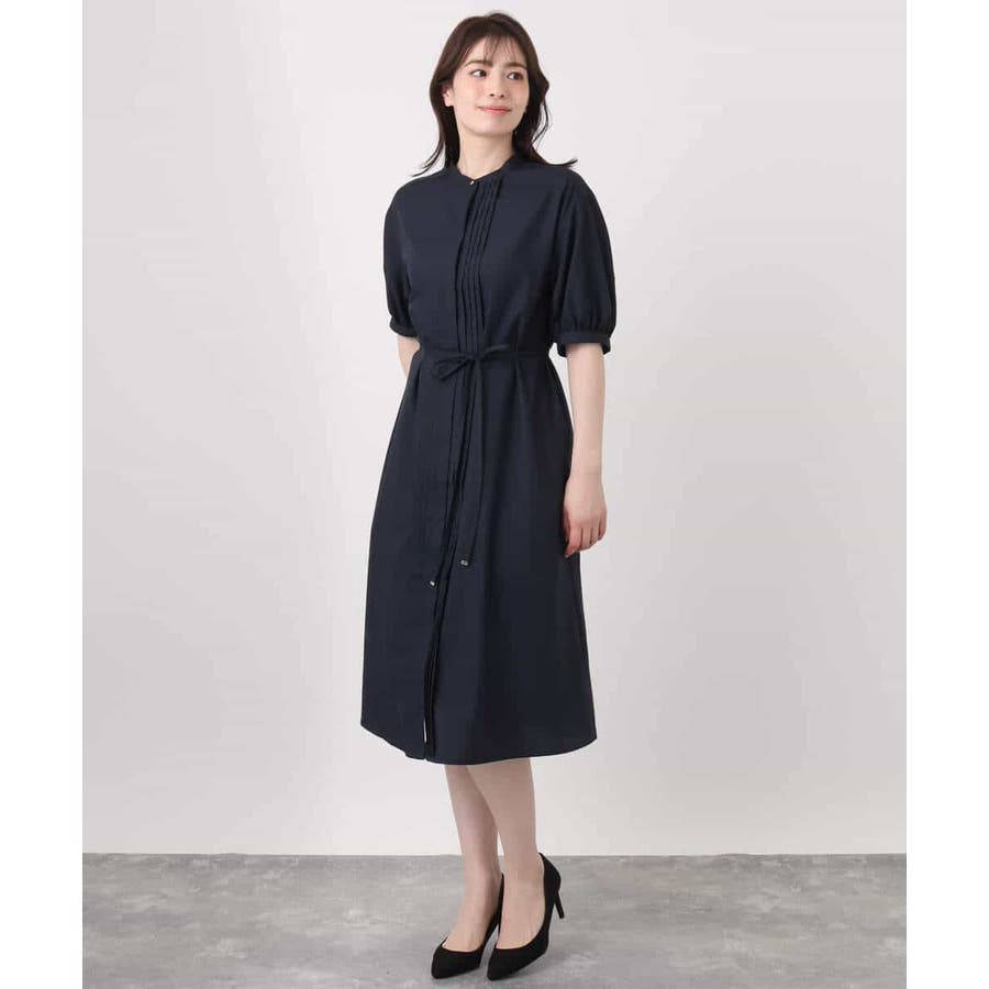 フロントのピンタックがアクセントの前開きタイプのワンピース。比翼仕立てですっきりと仕上げました。