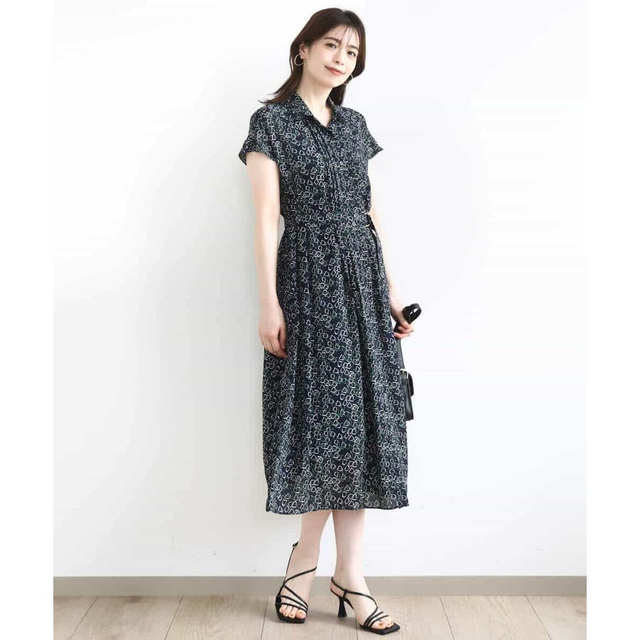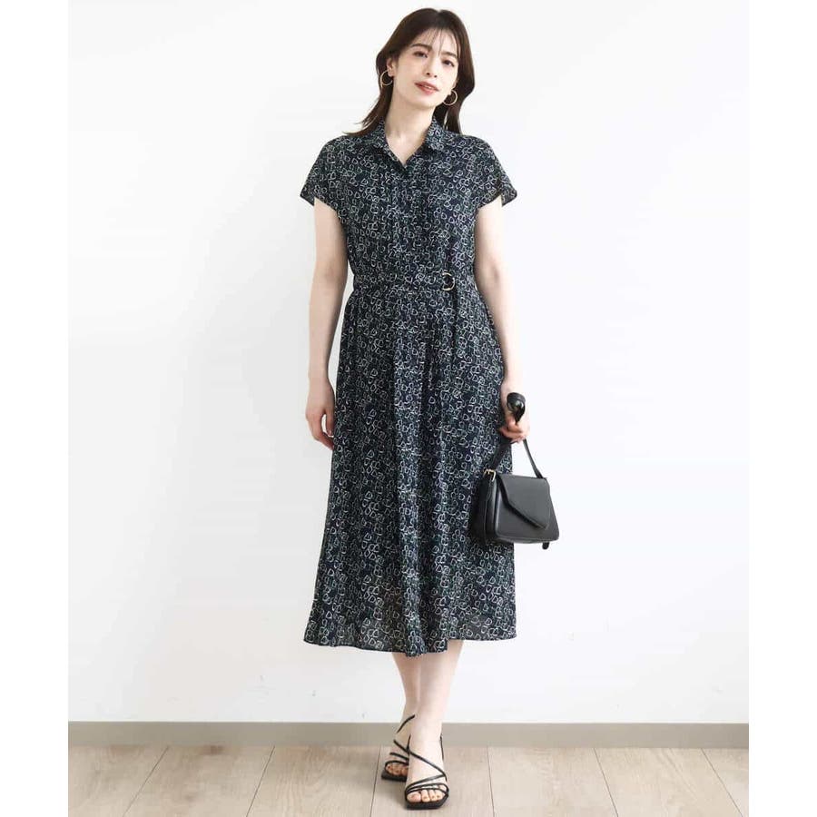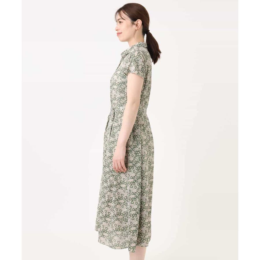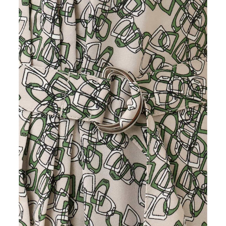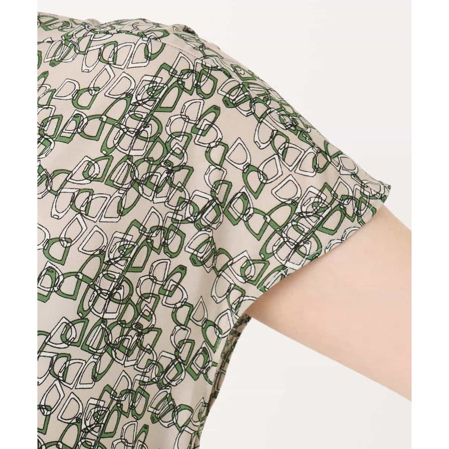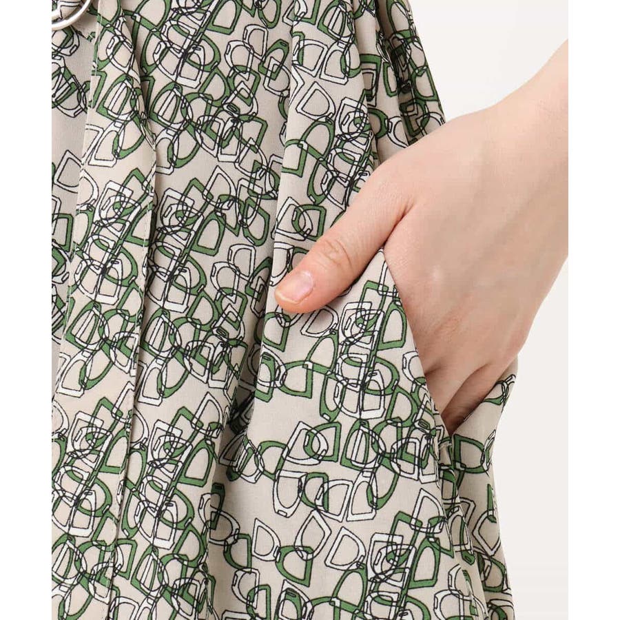 チェーンのようなプリントを落ち着いた色合いで大人っぽく仕上げたワンピース。ネックをきれいに見せる衿と着用したときに開くようにパターンで調整したスキッパーデザインがポイントです。