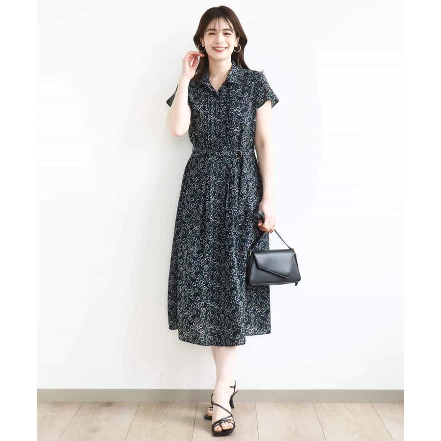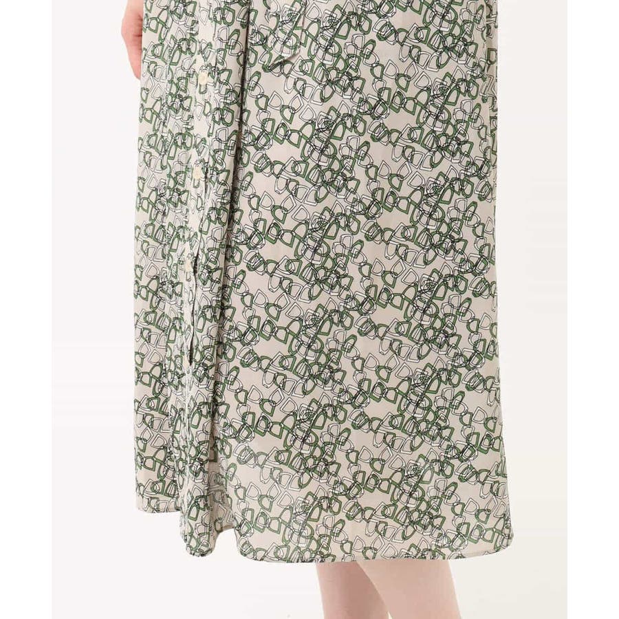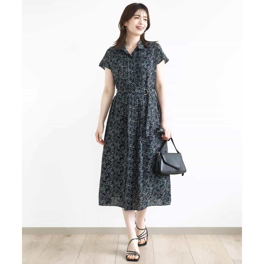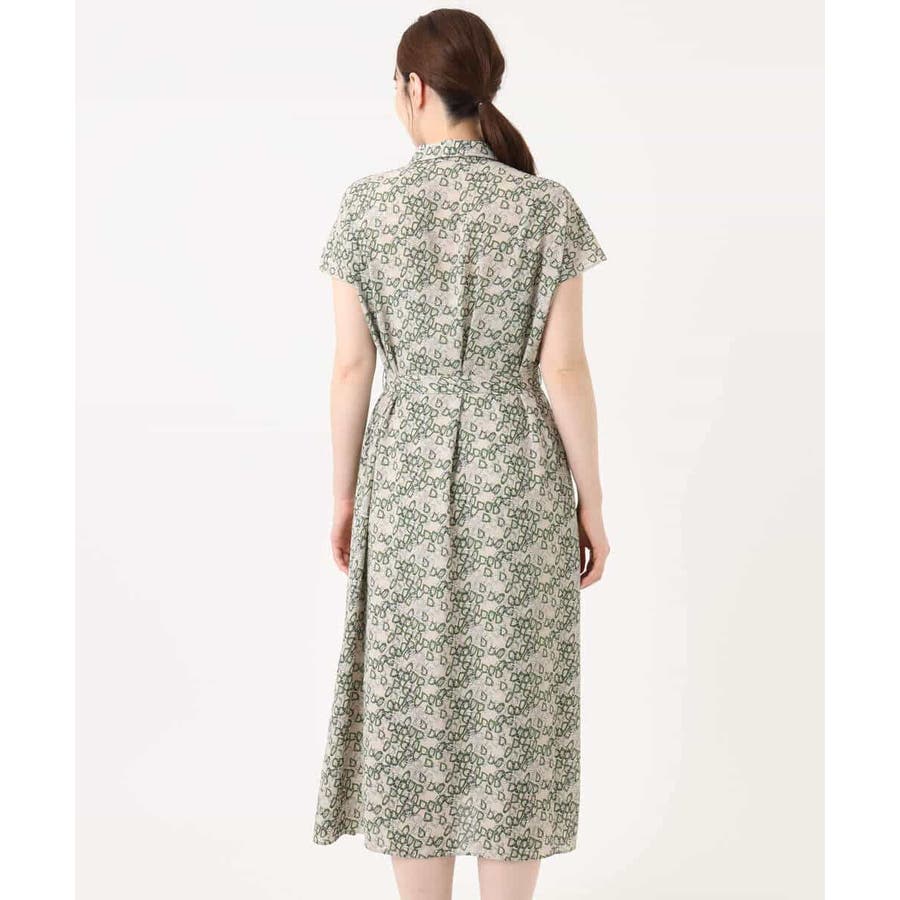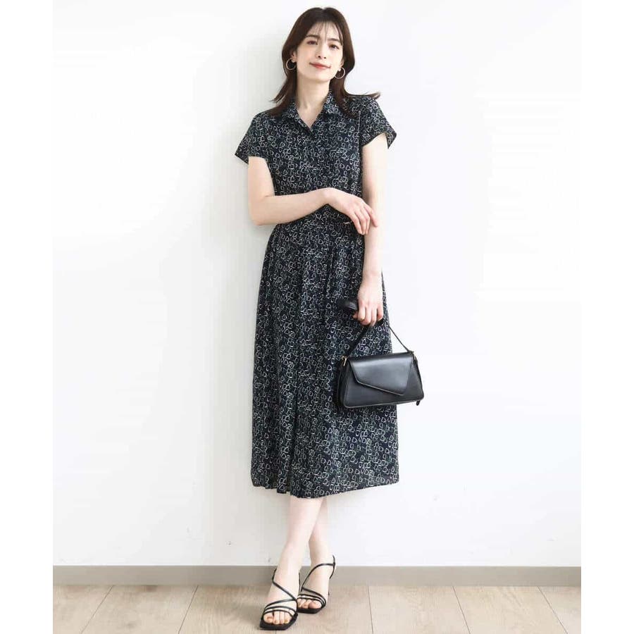 チェーンのようなプリントを落ち着いた色合いで大人っぽく仕上げたワンピース。ネックをきれいに見せる衿と着用したときに開くようにパターンで調整したスキッパーデザインがポイントです。