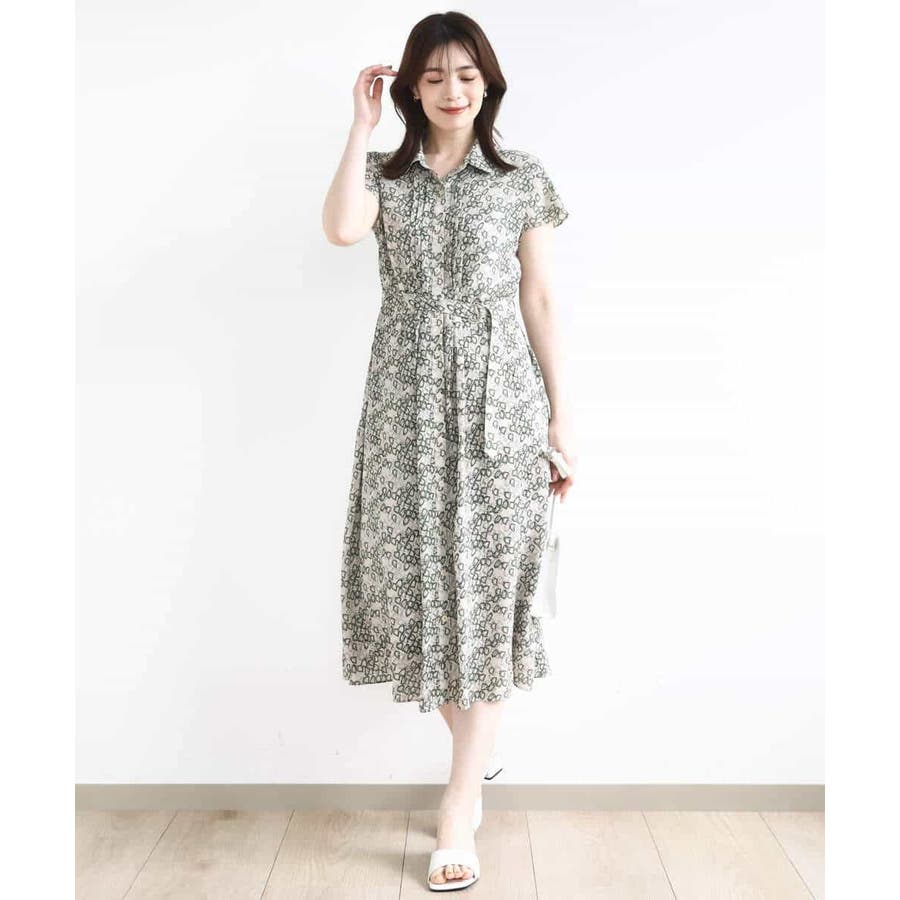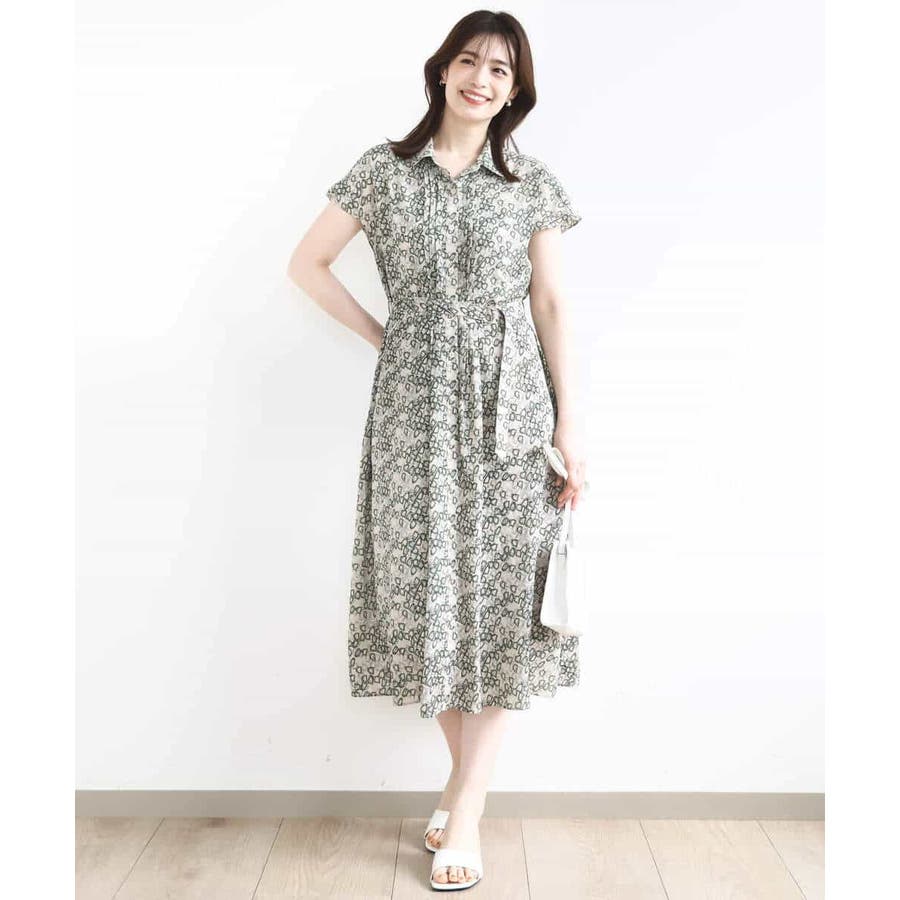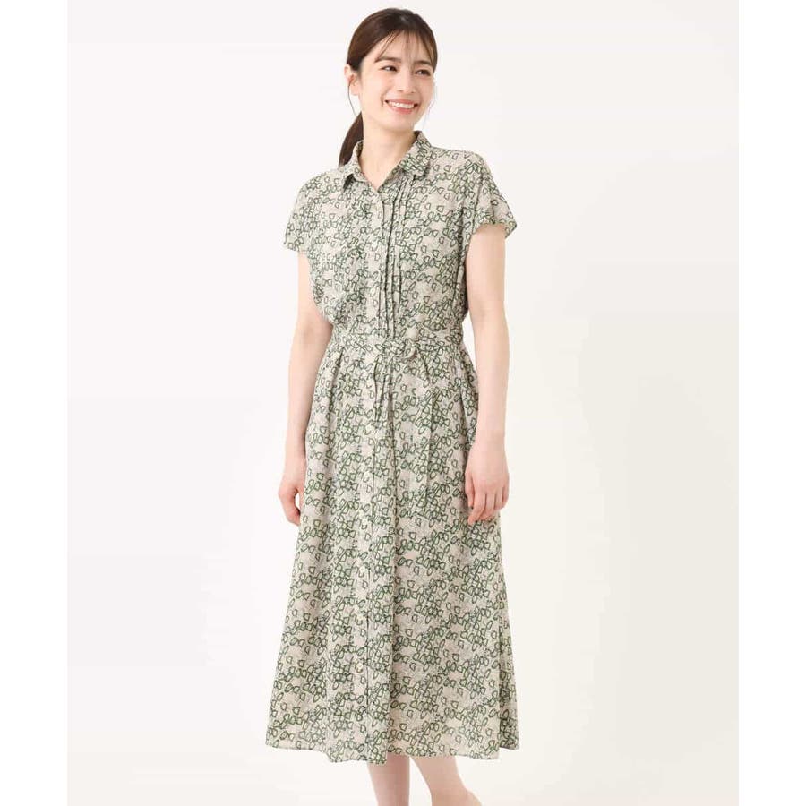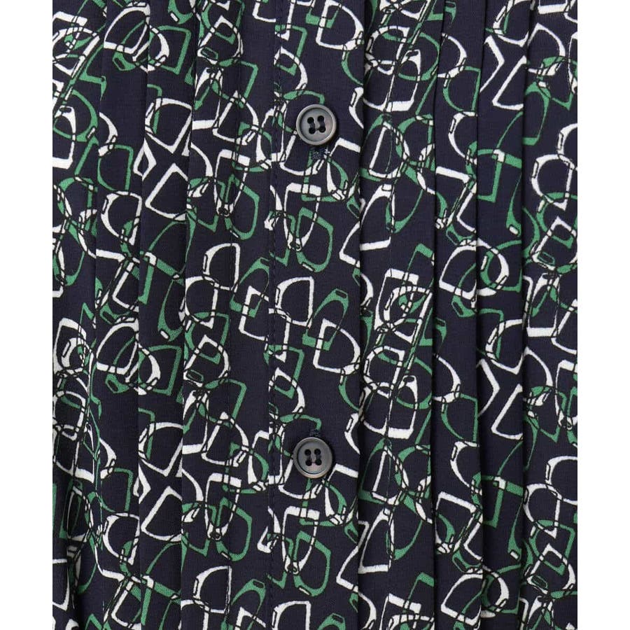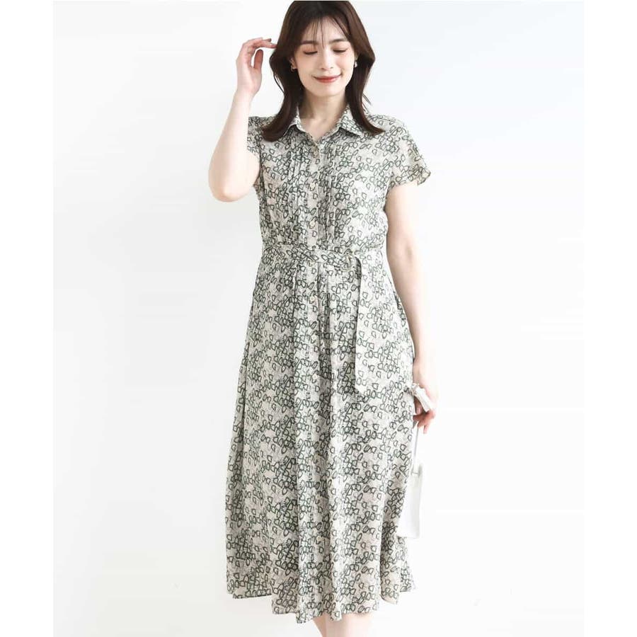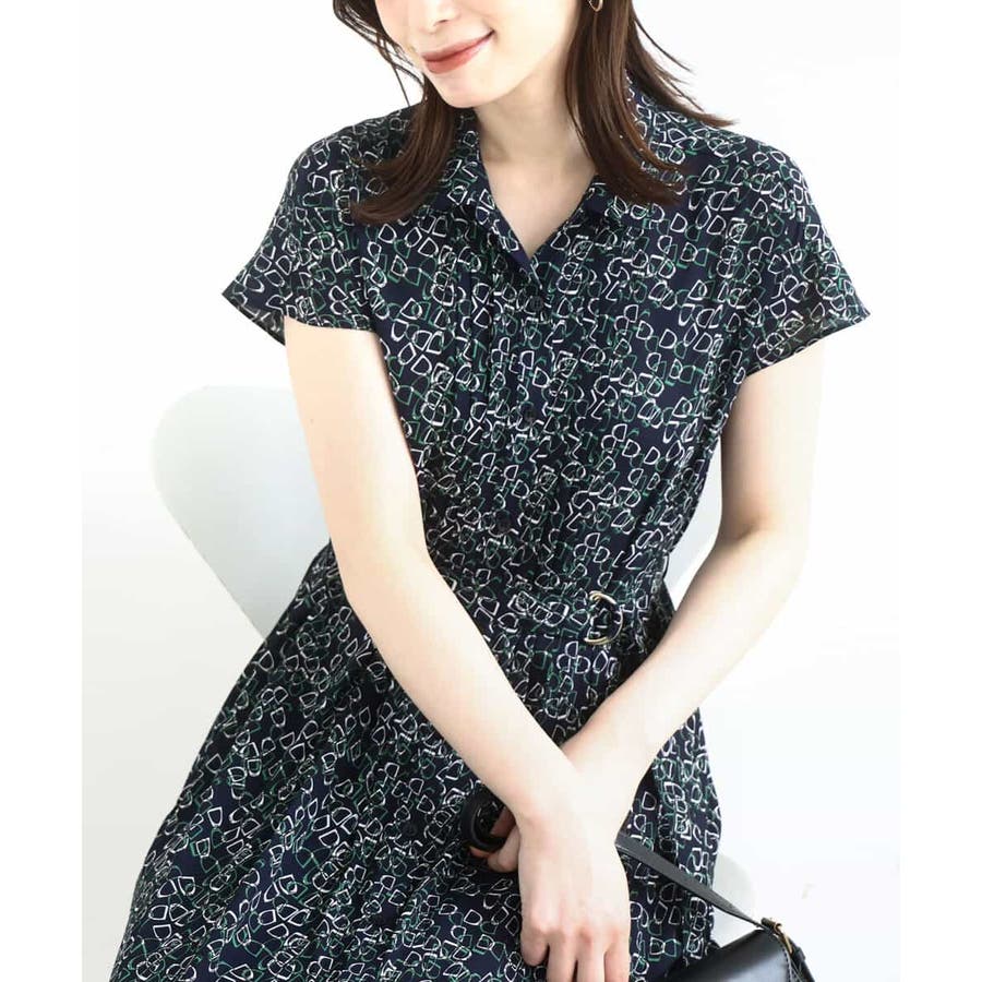 チェーンのようなプリントを落ち着いた色合いで大人っぽく仕上げたワンピース。ネックをきれいに見せる衿と着用したときに開くようにパターンで調整したスキッパーデザインがポイントです。