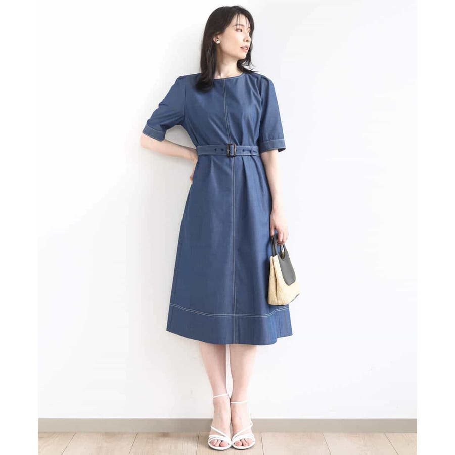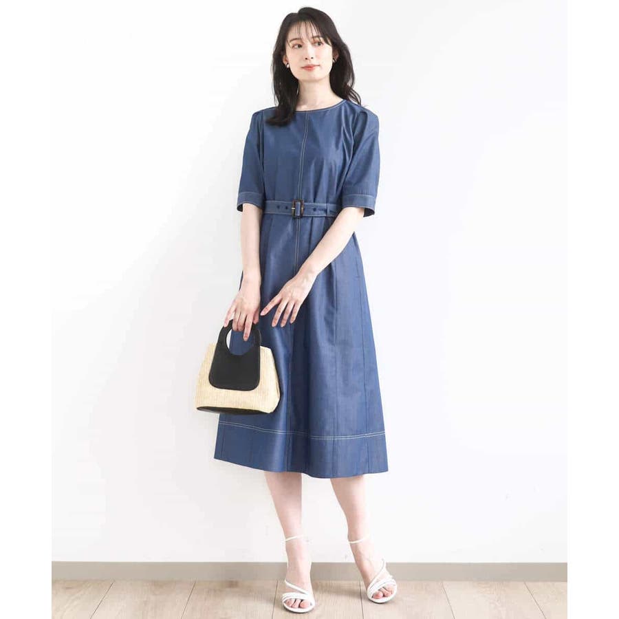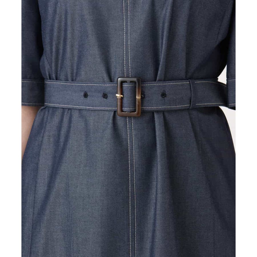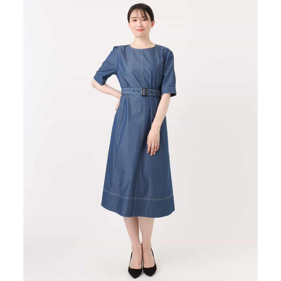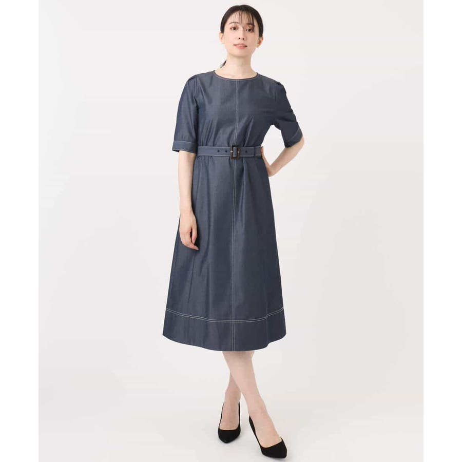 配色ステッチがポイントのデニムライク素材のワンピース。肩に取ったタックと長めの袖丈上品に着こなせます。共地のベルト付きでシルエット変化も楽しめます。