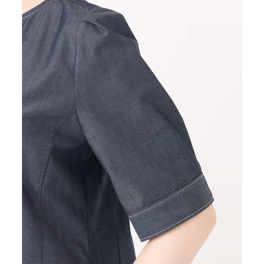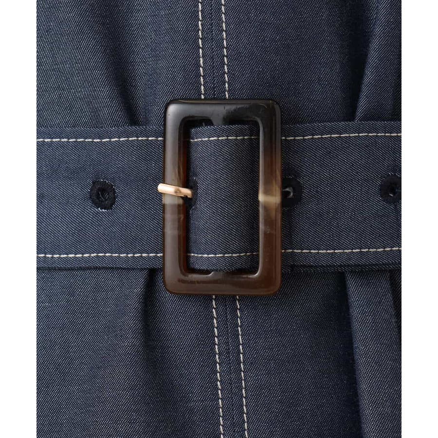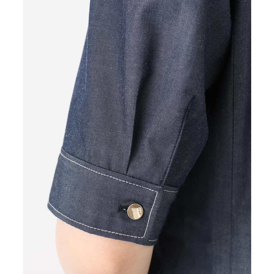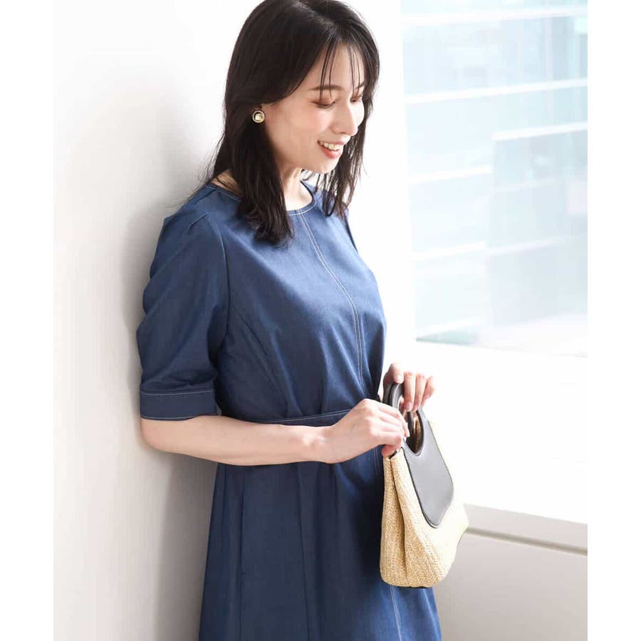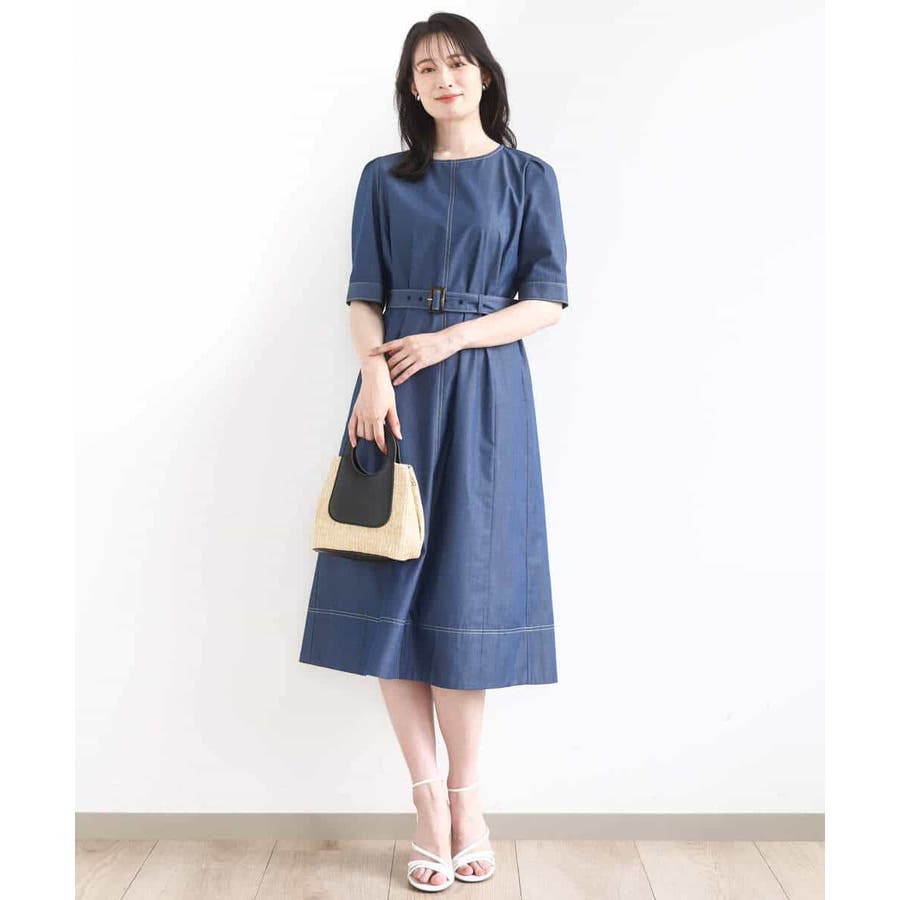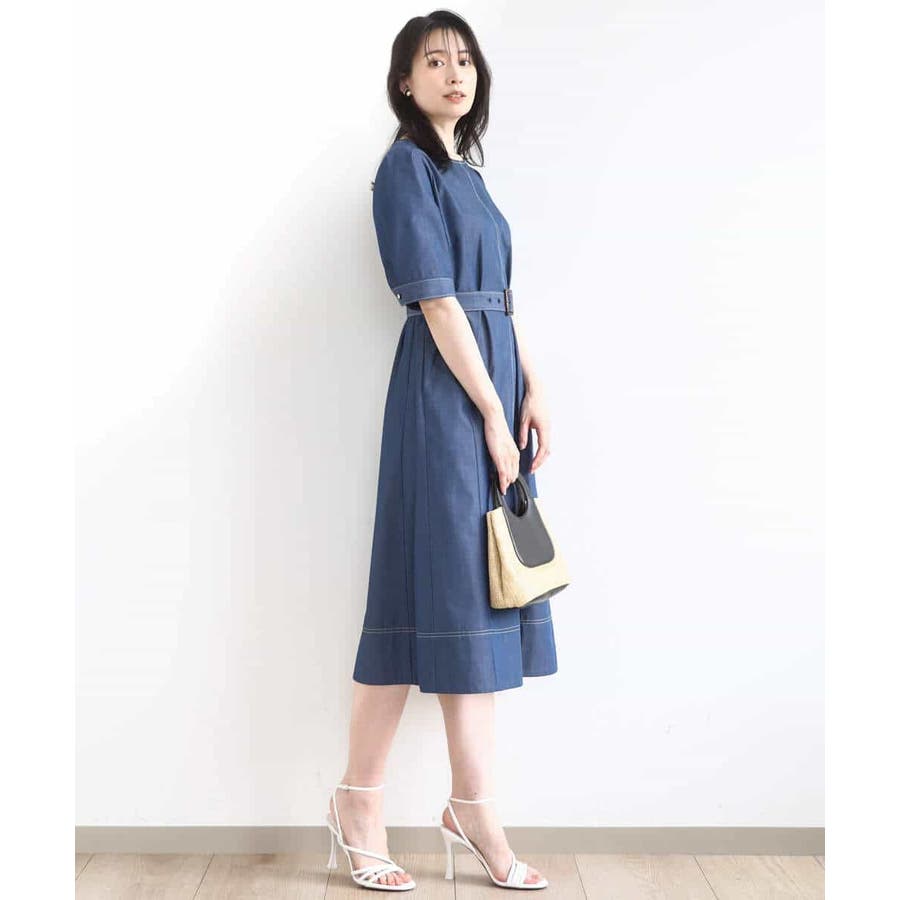 配色ステッチがポイントのデニムライク素材のワンピース。肩に取ったタックと長めの袖丈上品に着こなせます。共地のベルト付きでシルエット変化も楽しめます。