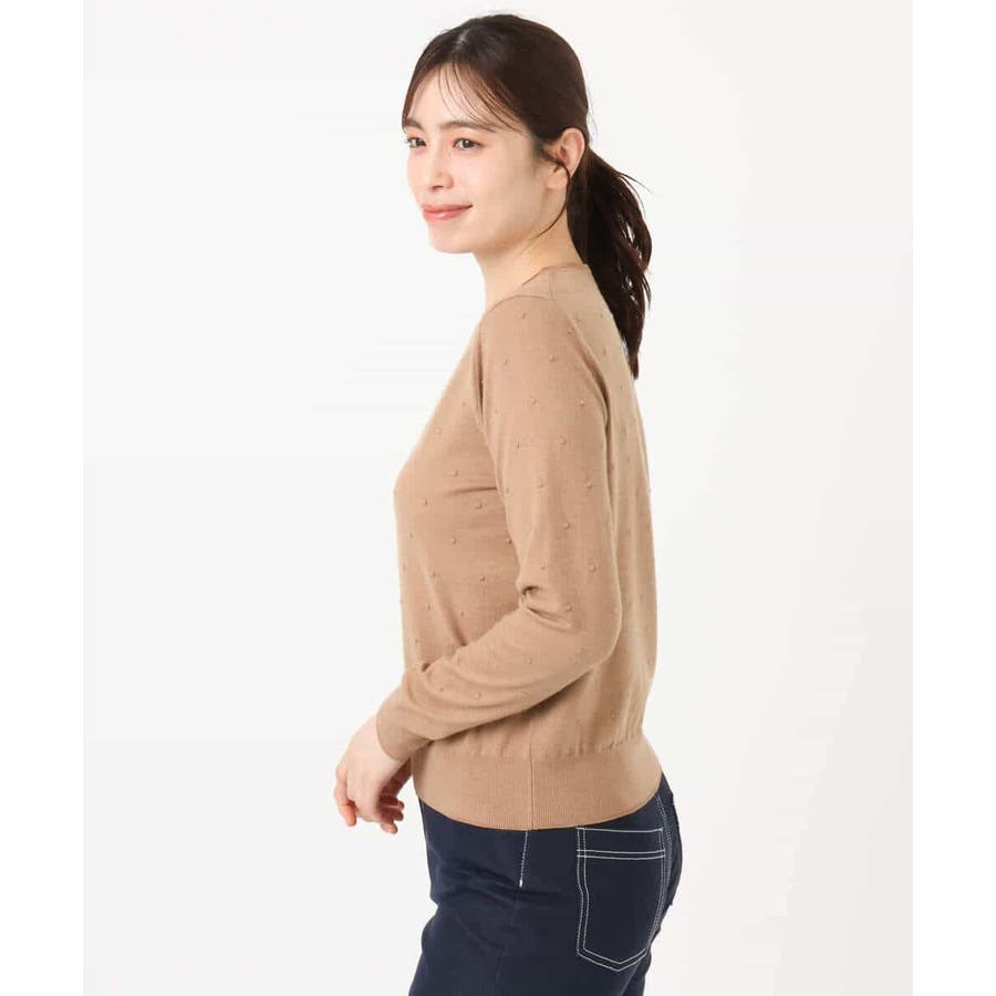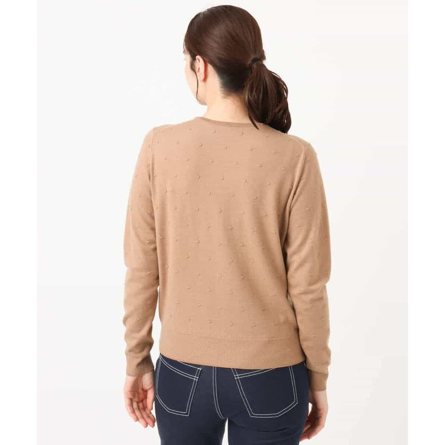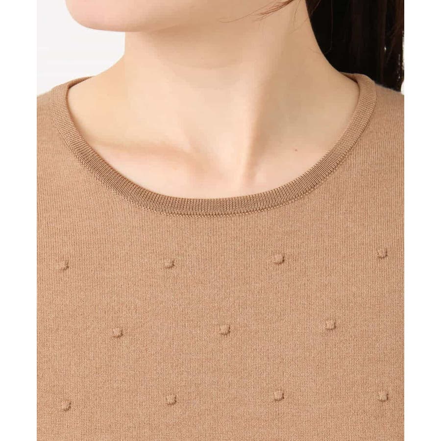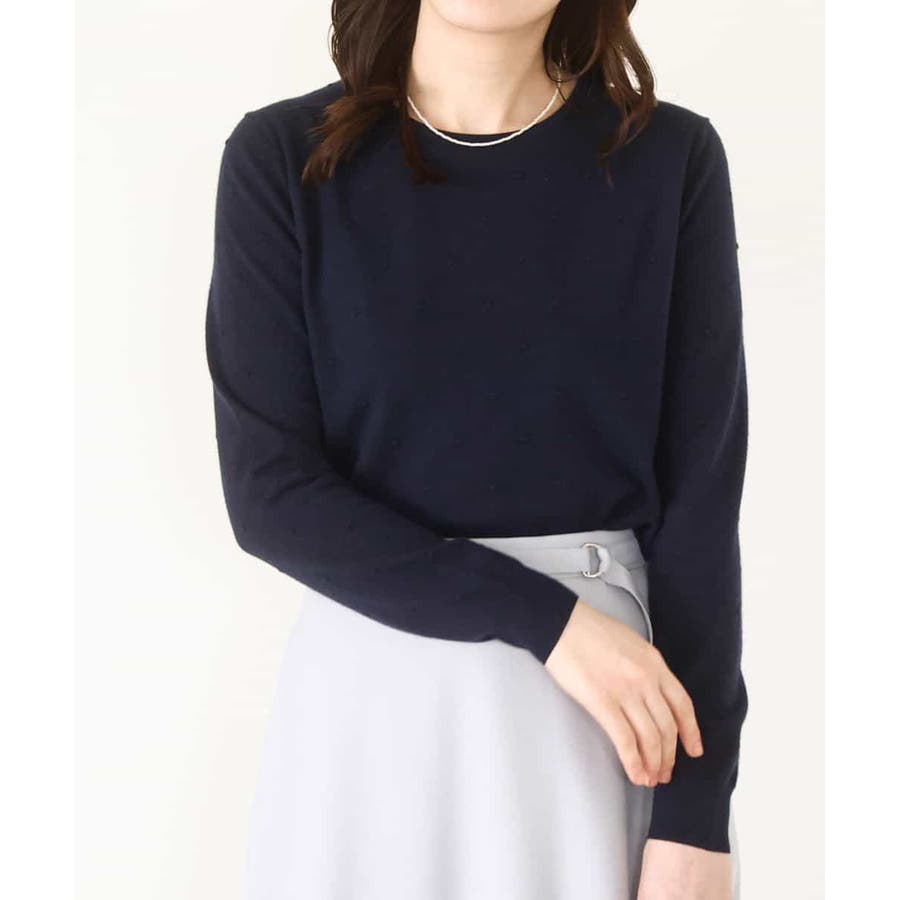編地で立体的なドット柄を表現し、無地ライクに着こなせるニットプルオーバー。衿とリブ端に同色のブライトレーヨン糸を使い、きれいめに仕上げました。