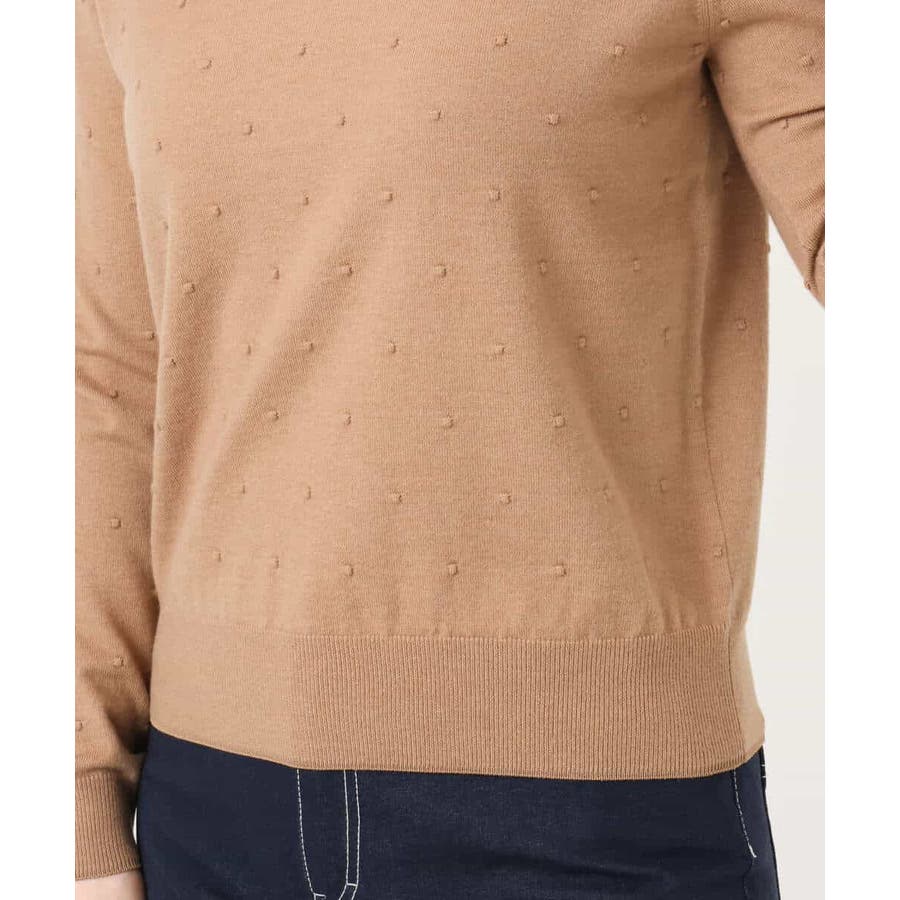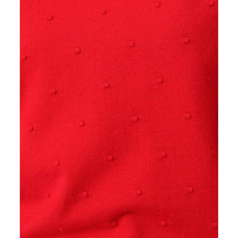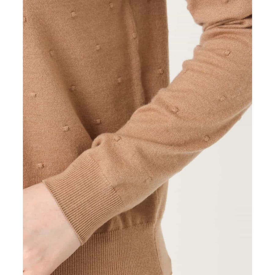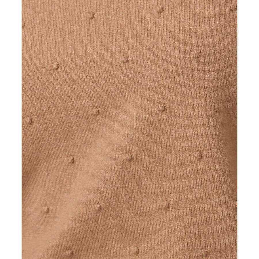 編地で立体的なドット柄を表現し、無地ライクに着こなせるニットプルオーバー。衿とリブ端に同色のブライトレーヨン糸を使い、きれいめに仕上げました。