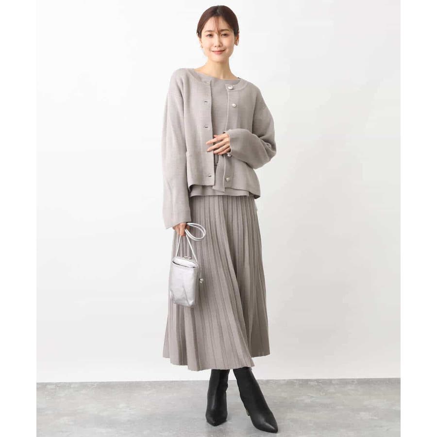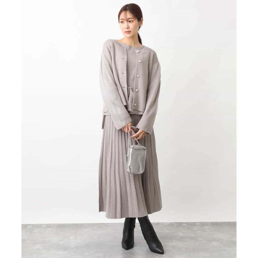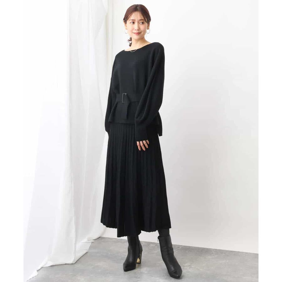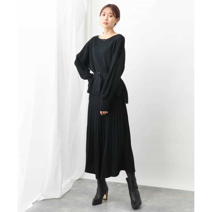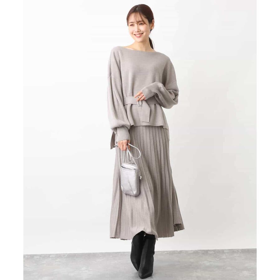 付属のベルトでウエストマークして、同素材のスカートとセットアップでの着こなしもおすすめです。ベルトなしで着こなせばベーシックなニットとしても着回し力◎