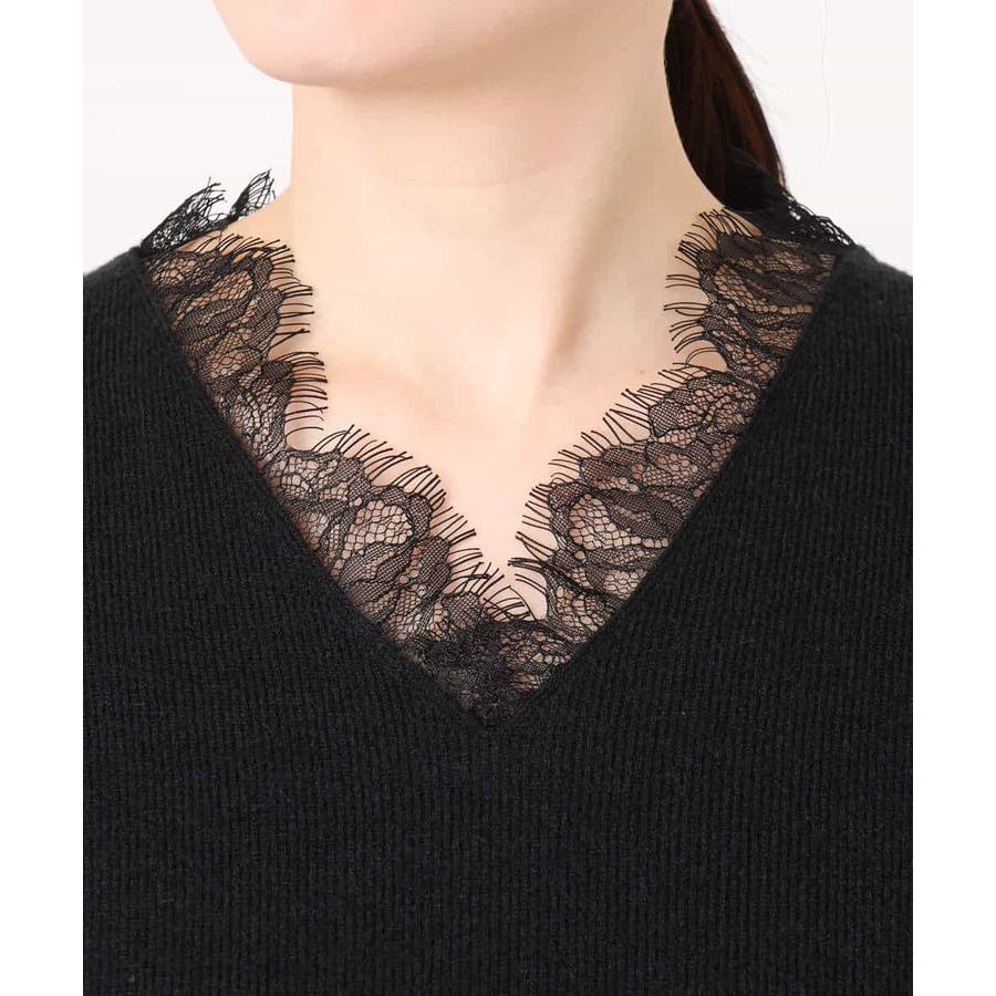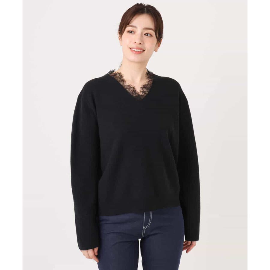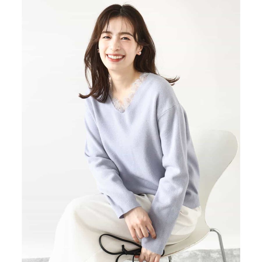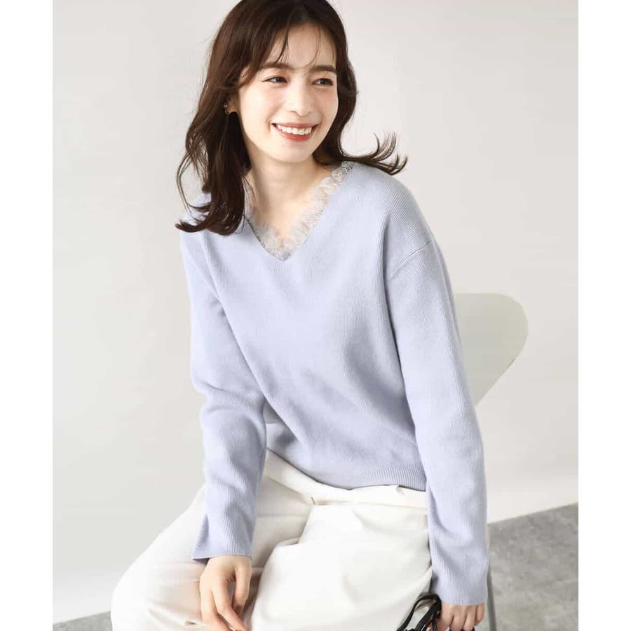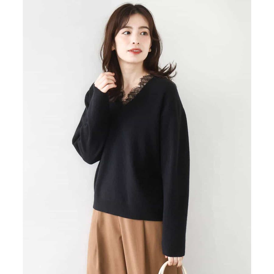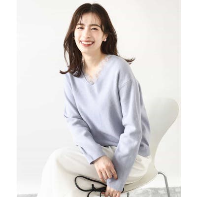 一枚で着映える女性らしいVネックラインと、お顔まわりを華やかにするレース使いがポイントのニットプルオーバー。オーバー過ぎないながらも大人のこなれ感を感じるサイズ感のドロップショルダーデザイン。