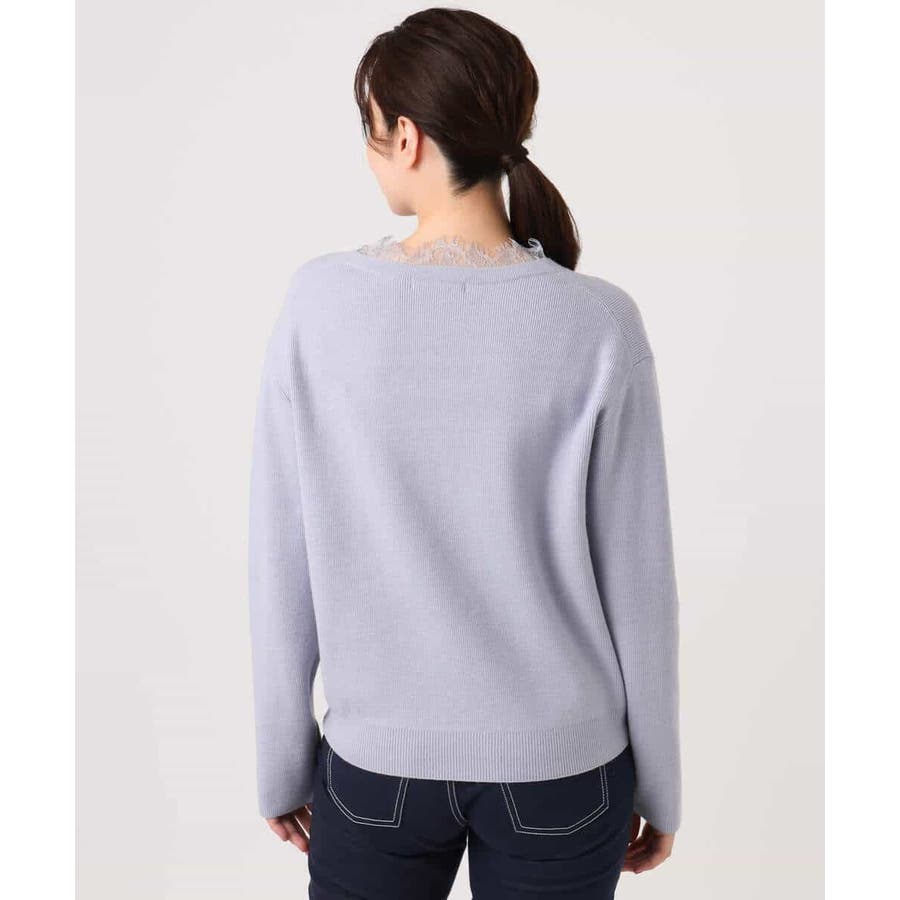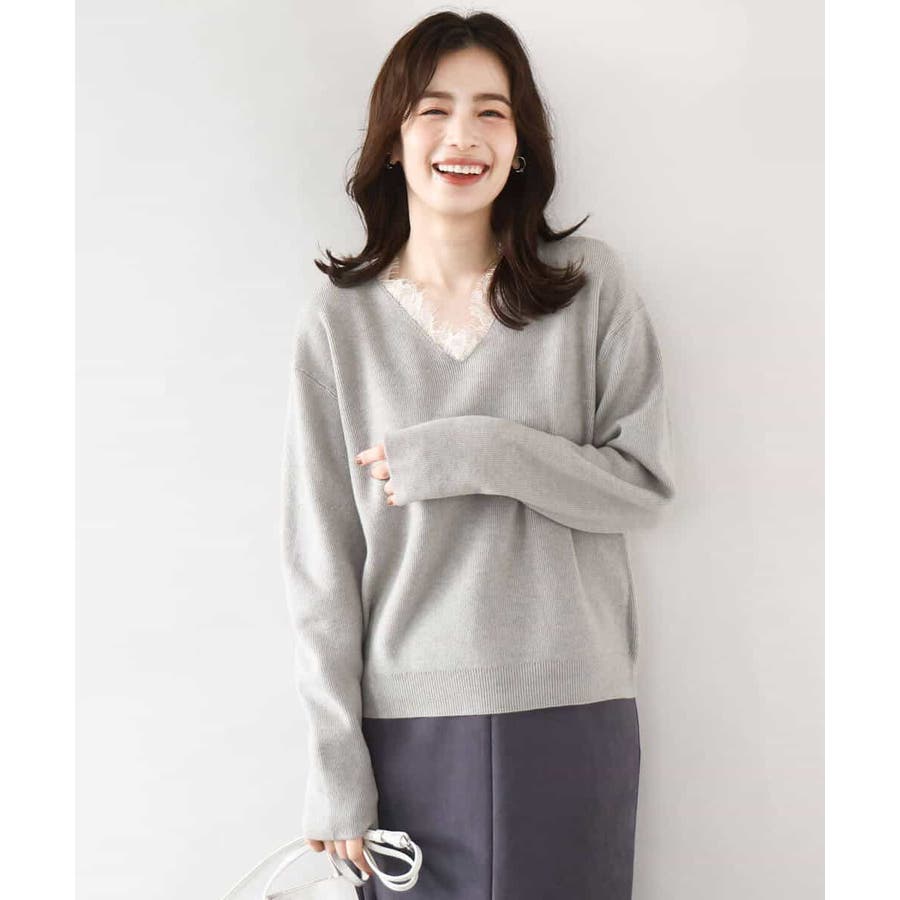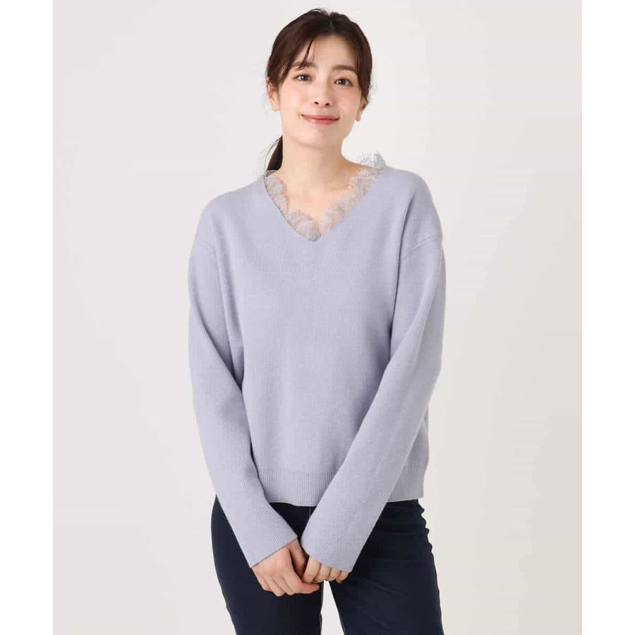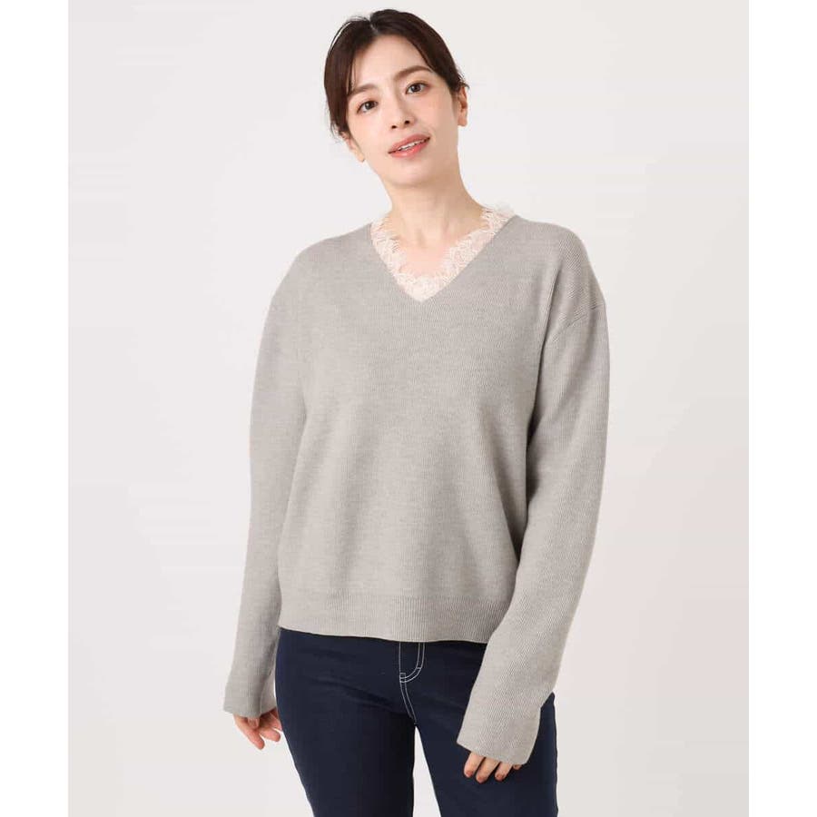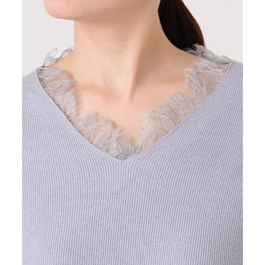 一枚で着映える女性らしいVネックラインと、お顔まわりを華やかにするレース使いがポイントのニットプルオーバー。オーバー過ぎないながらも大人のこなれ感を感じるサイズ感のドロップショルダーデザイン。