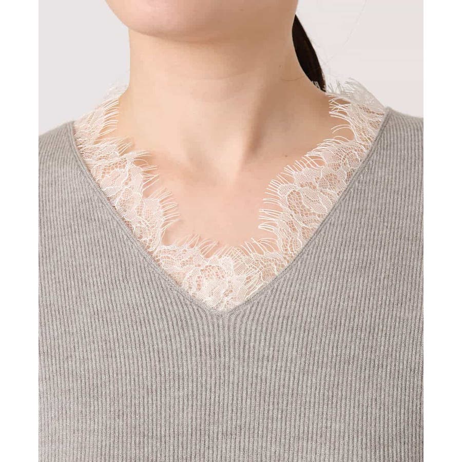 Vネックレース片畦編みニット/洗える/WEB限定サイズあり