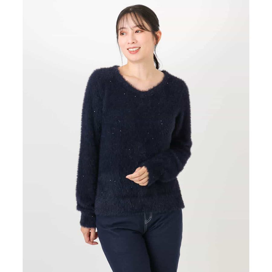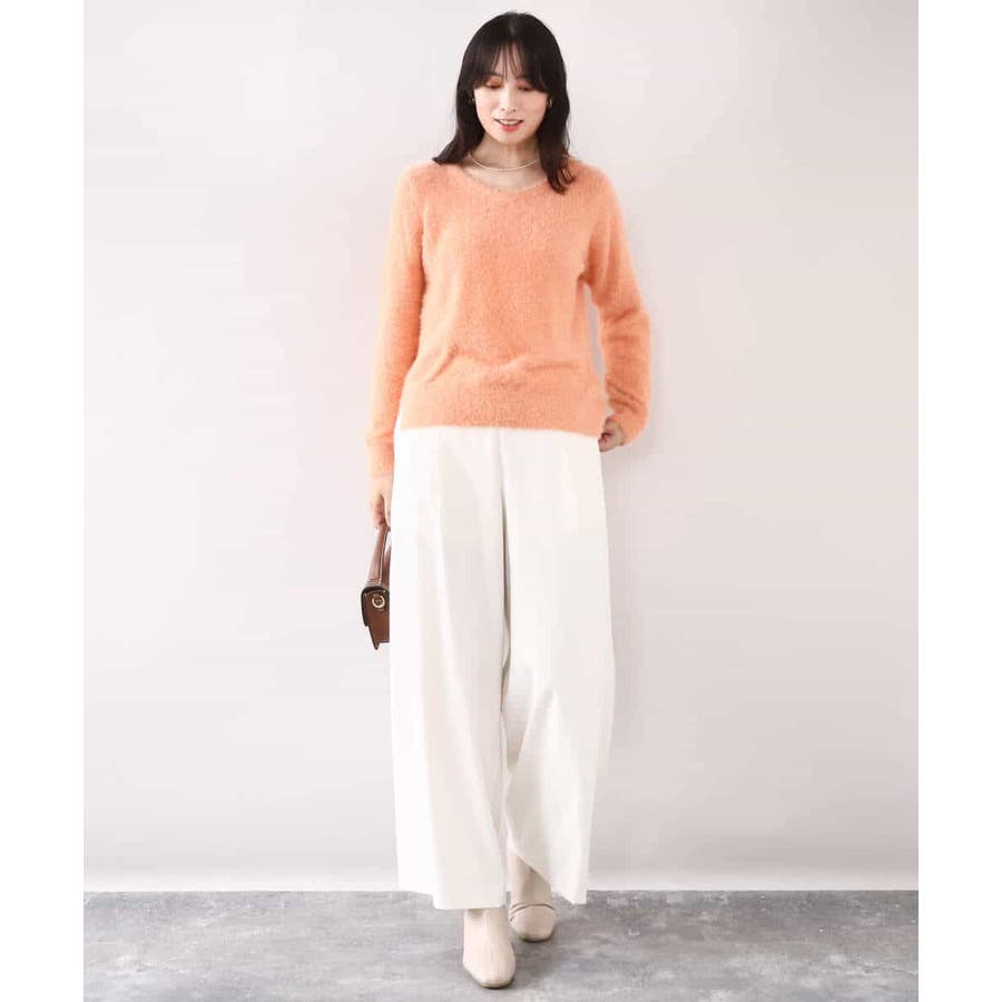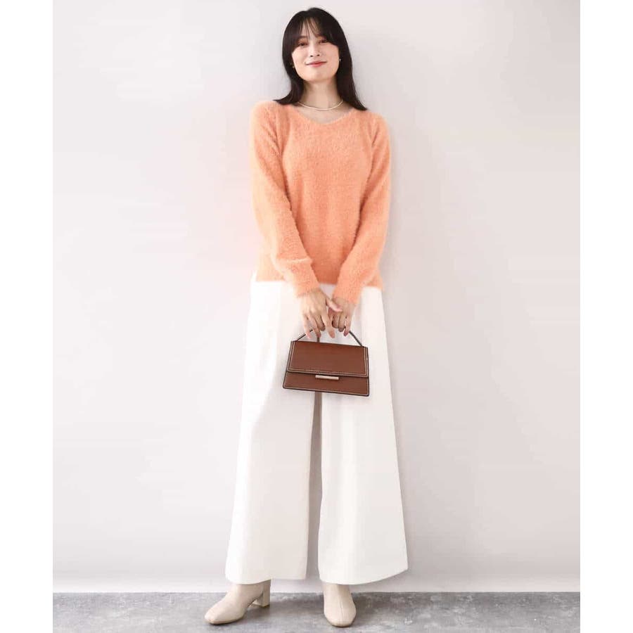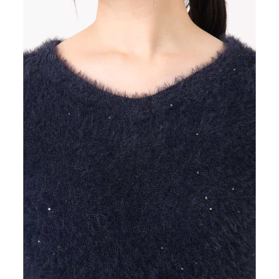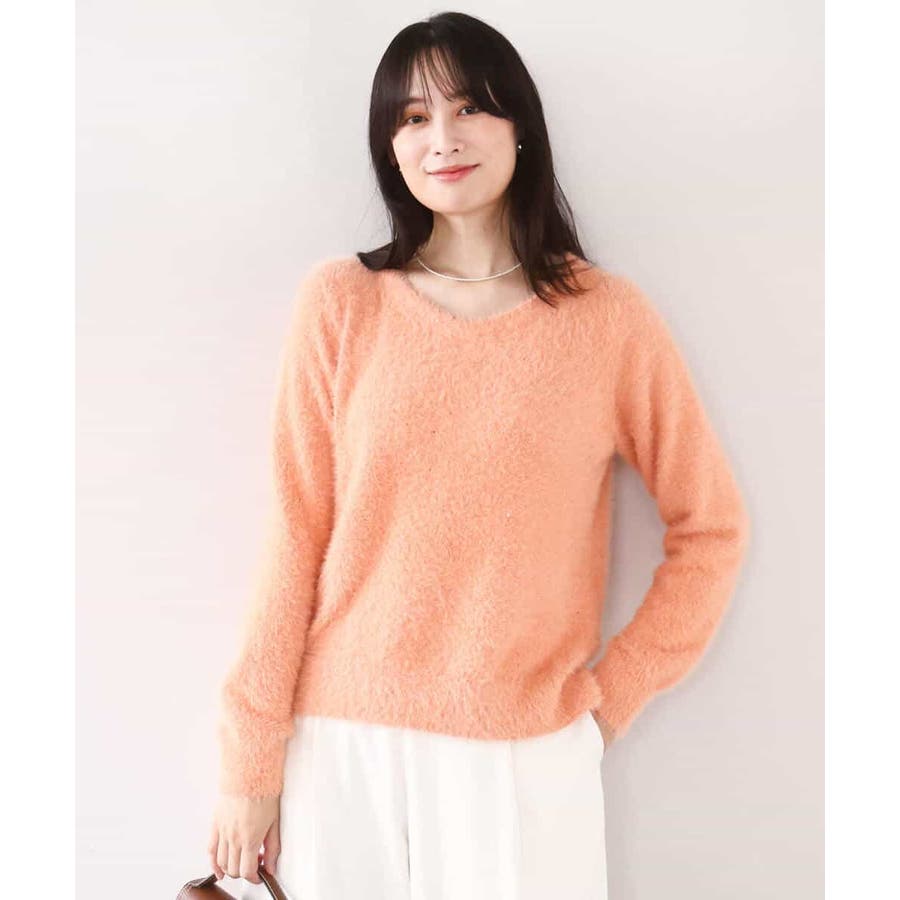 極小のスパンコールがきらめくふわふわシャギーニット。浅めのVネックで首元はすっきり見て、着ぶくれしにくいデザインに。オレンジのみスパンコールの色味がマルチカラーになります。