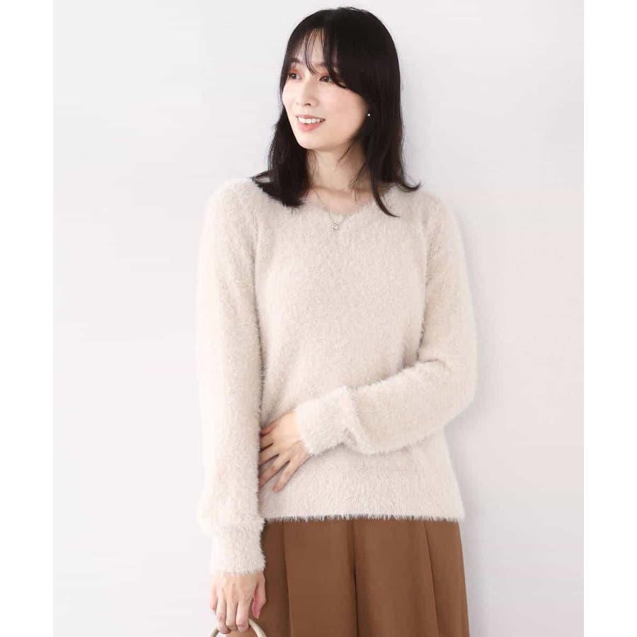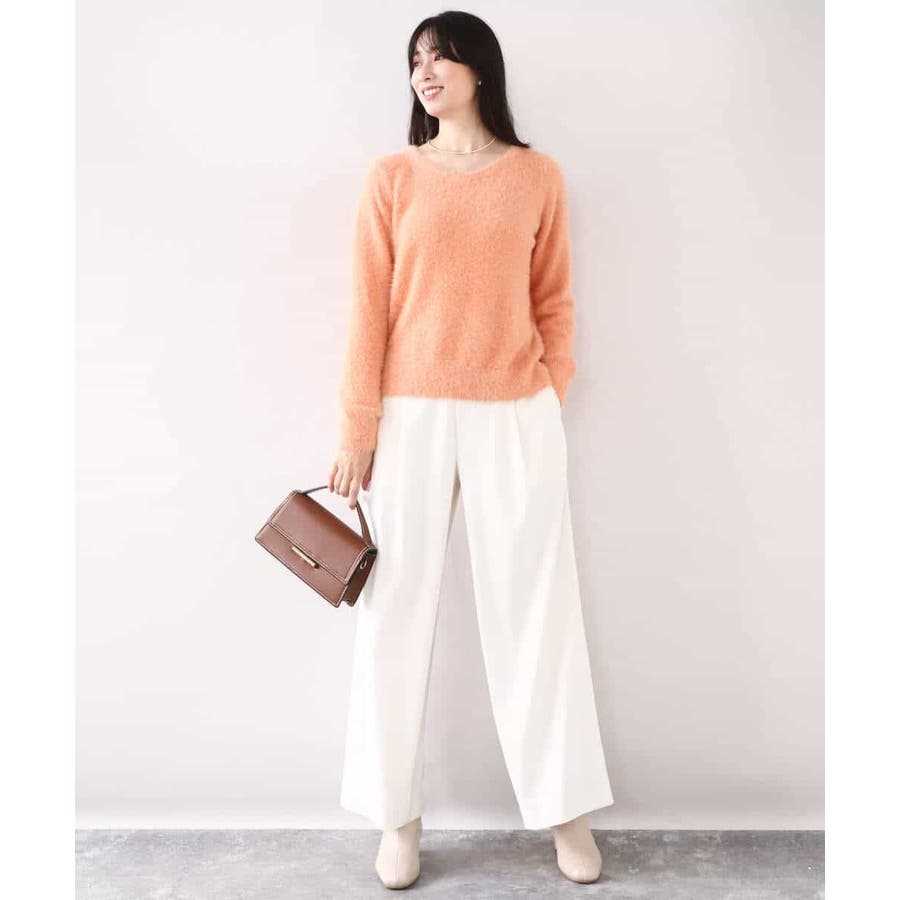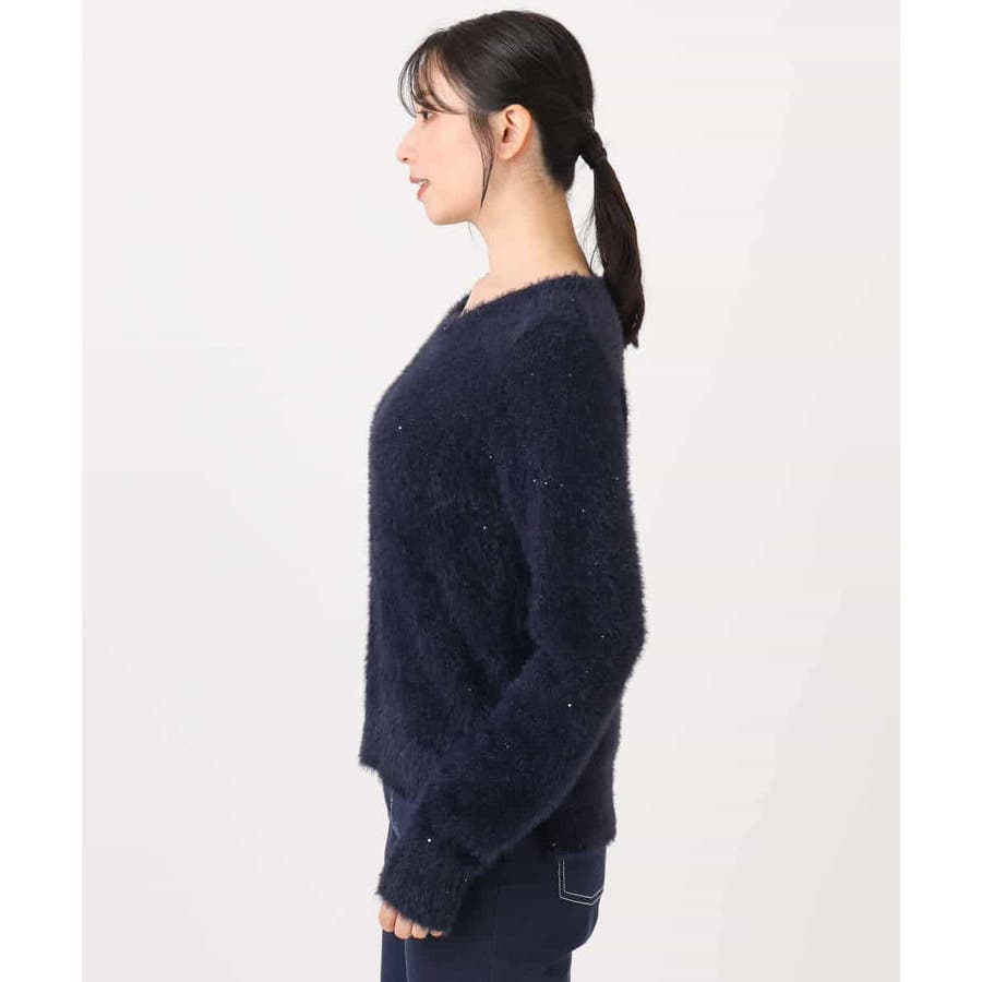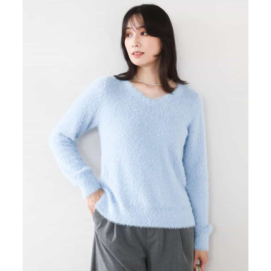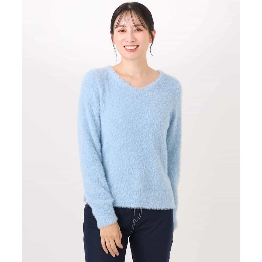 極小のスパンコールがきらめくふわふわシャギーニット。浅めのVネックで首元はすっきり見て、着ぶくれしにくいデザインに。オレンジのみスパンコールの色味がマルチカラーになります。