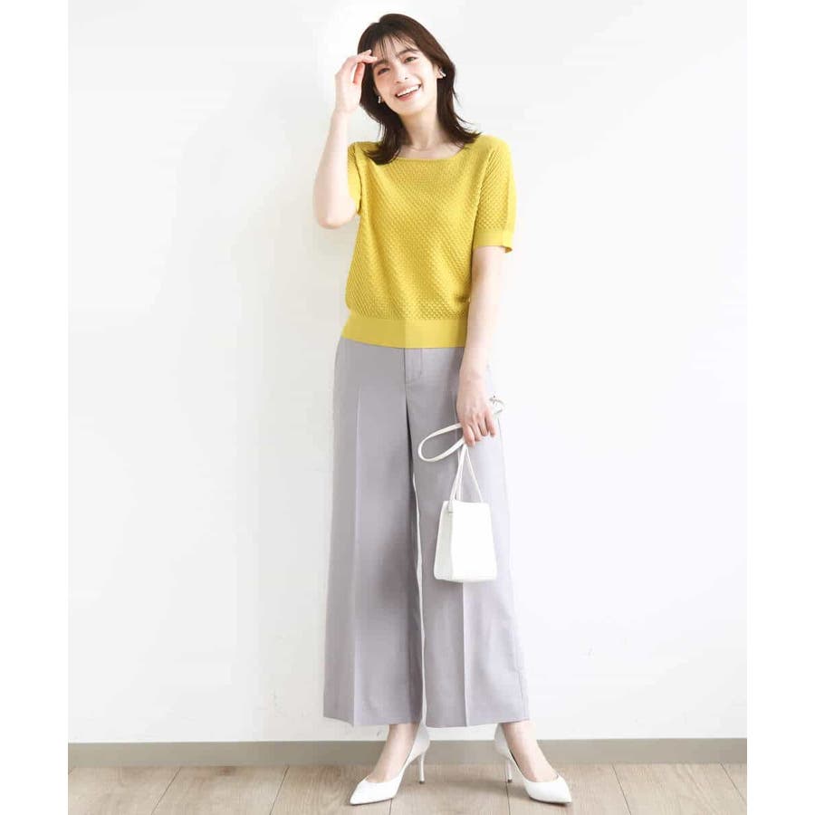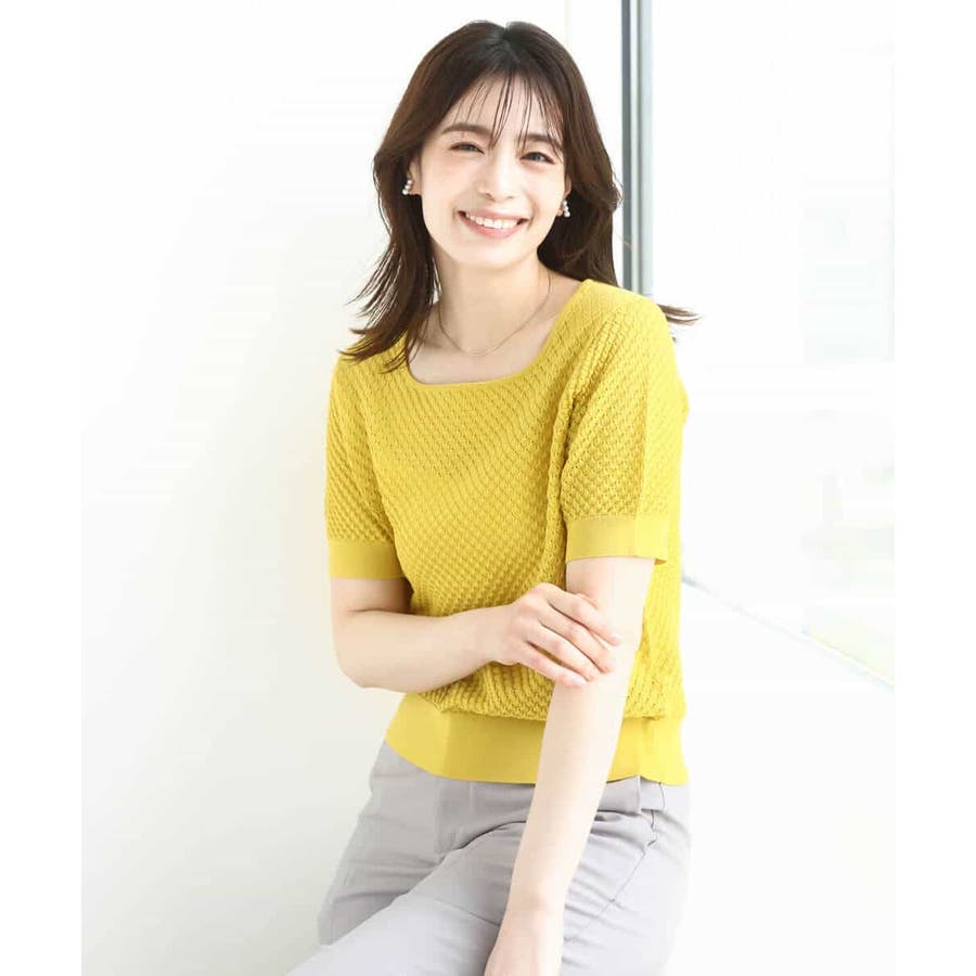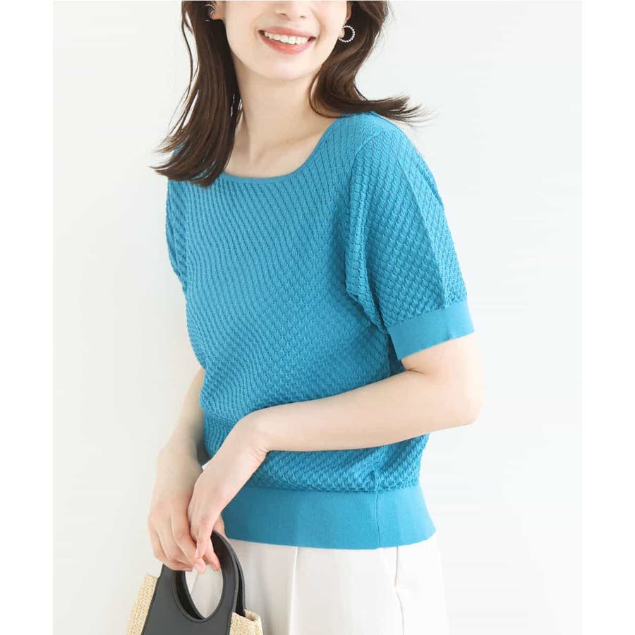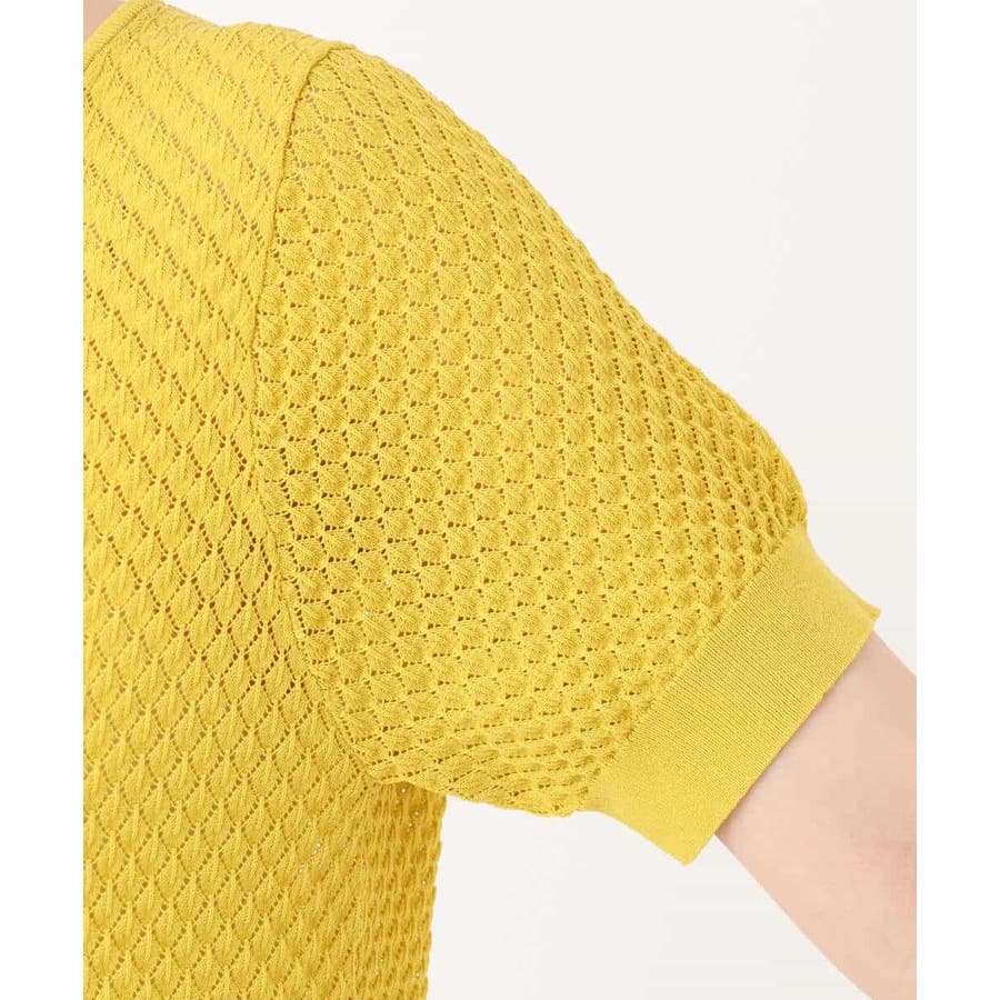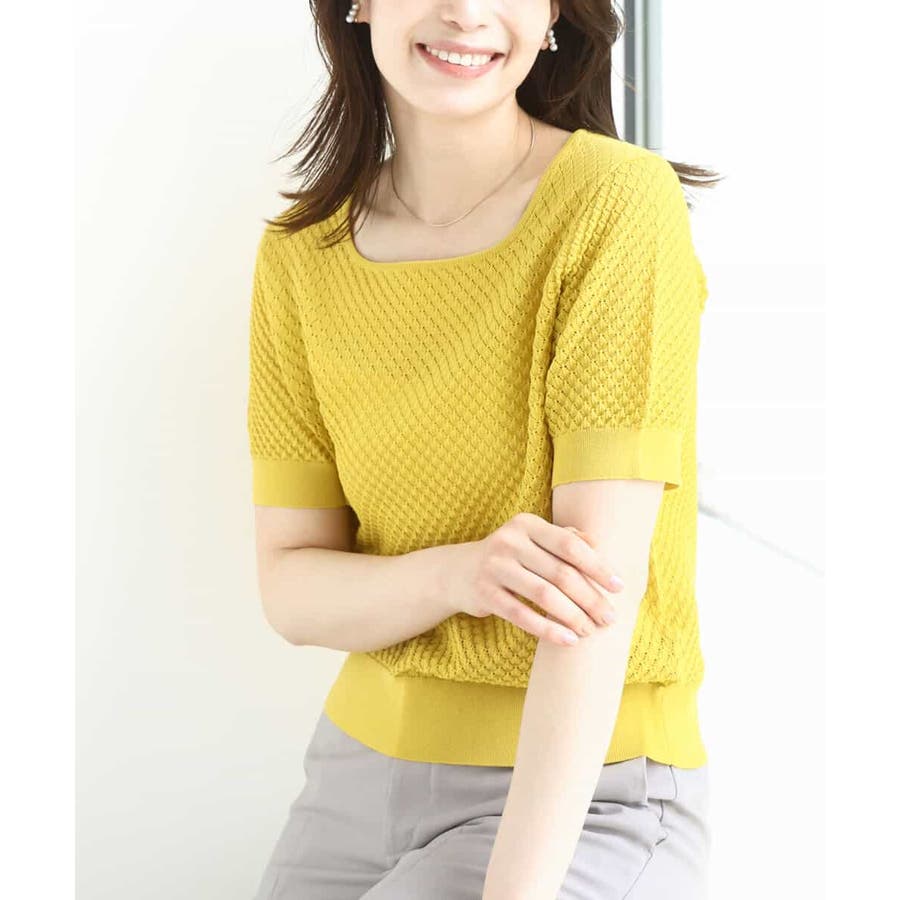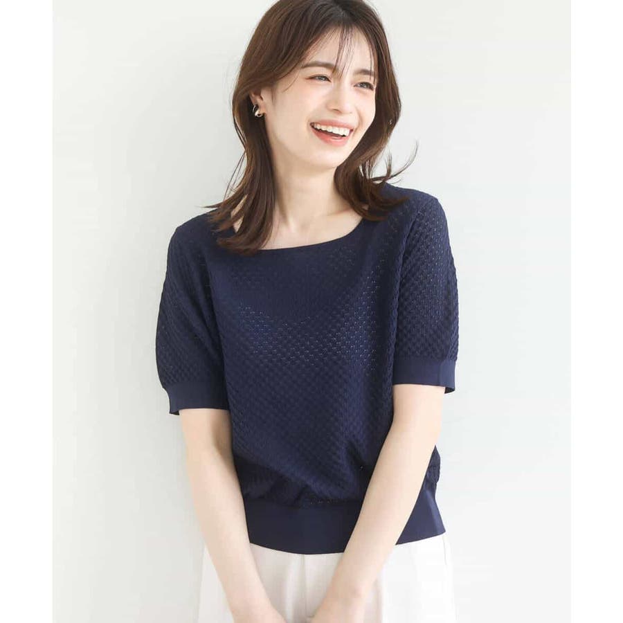 レーシーで細かいリーフ柄編みをした半袖ニットプルオーバー。コンパクトなサイズ感がきちんと感のある印象で着こなせます。アクセサリーも映える、ほんのり丸みのあるスクエアネックラインです。