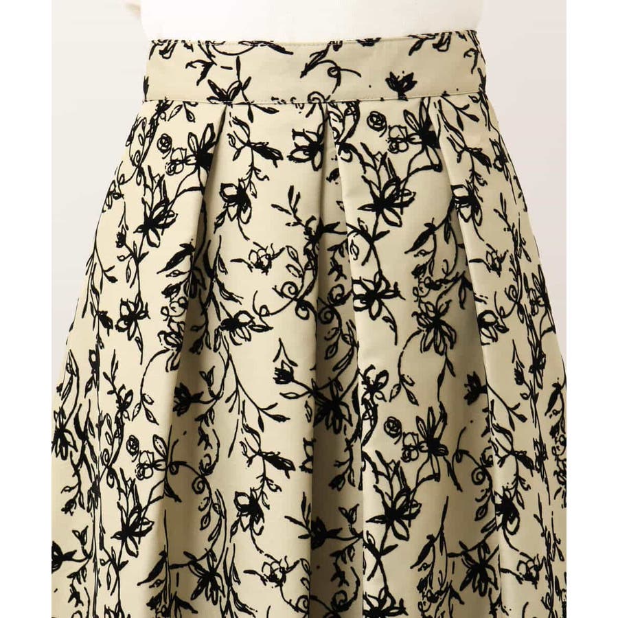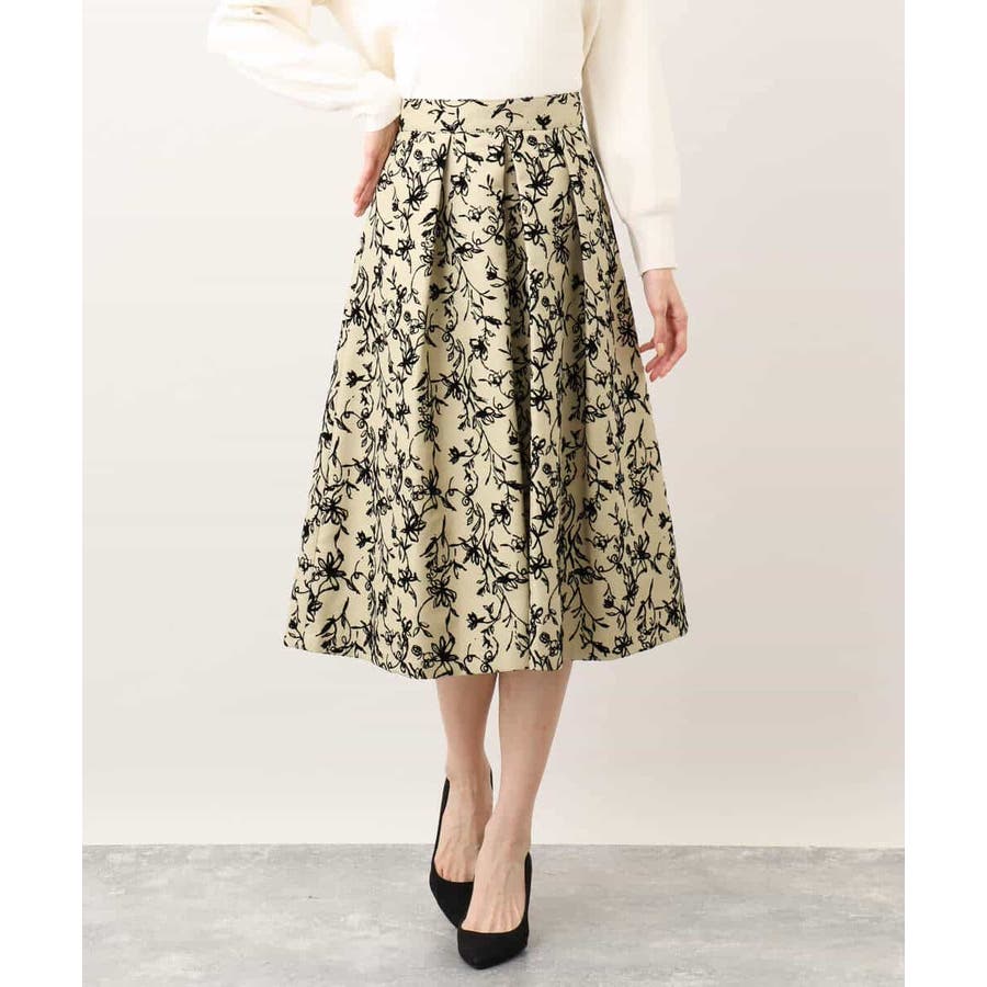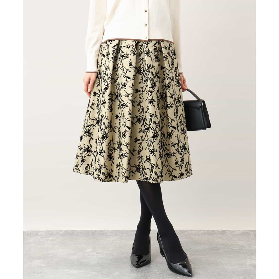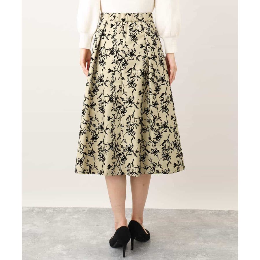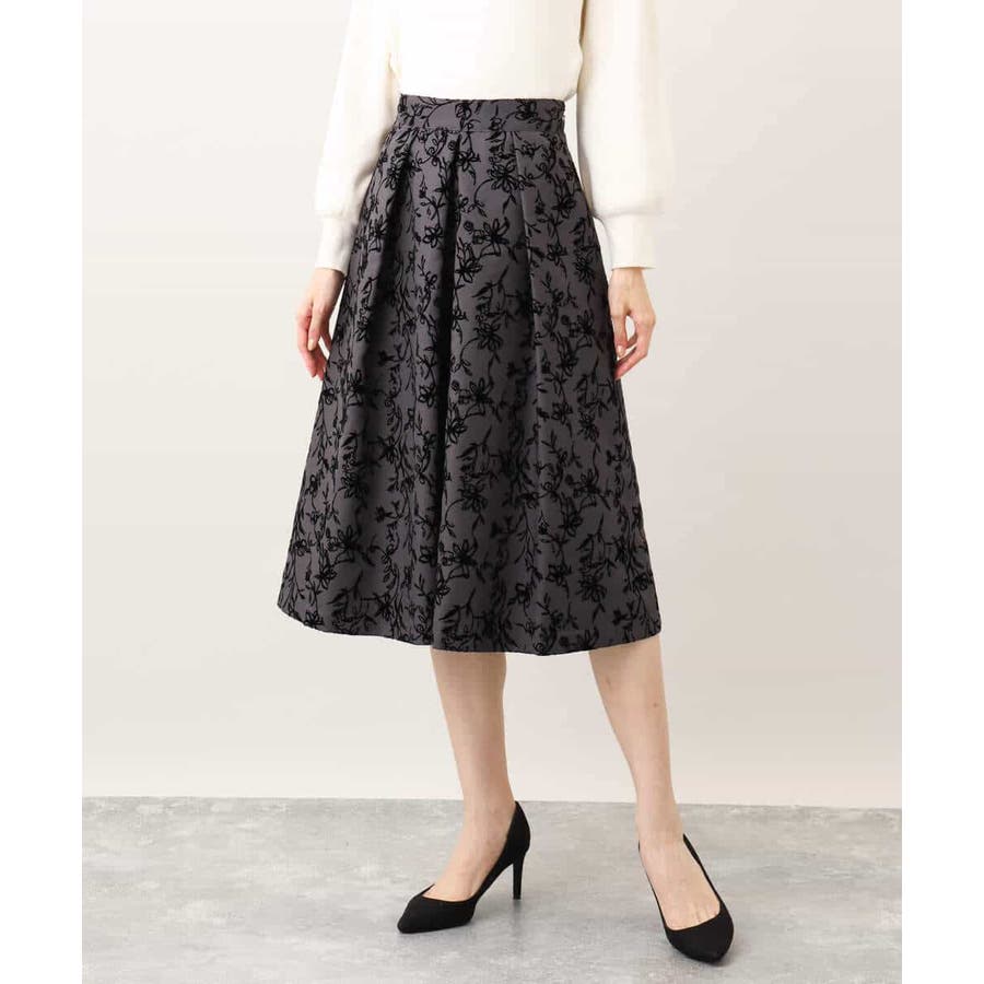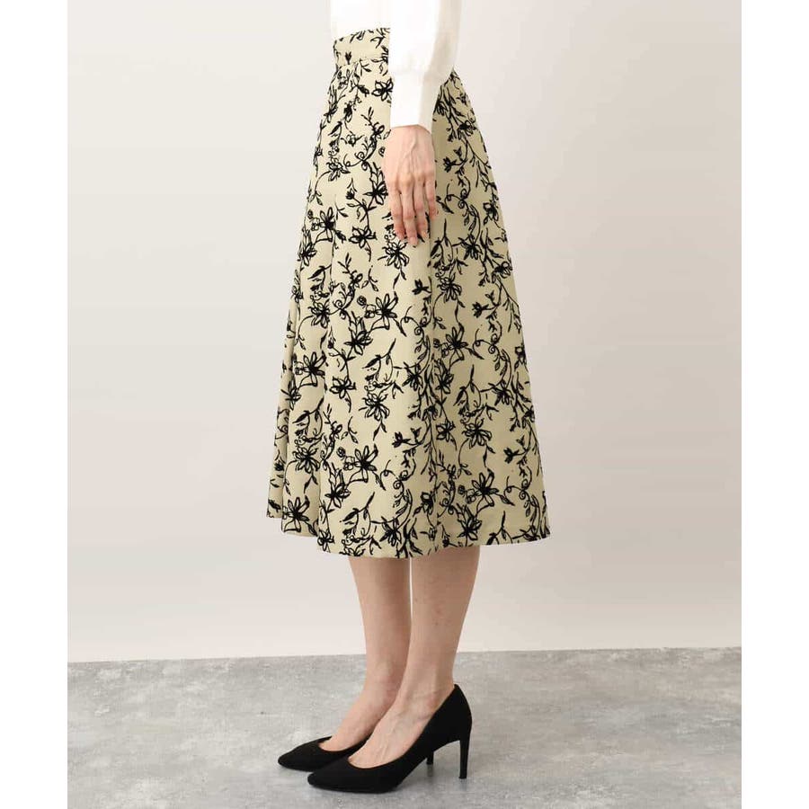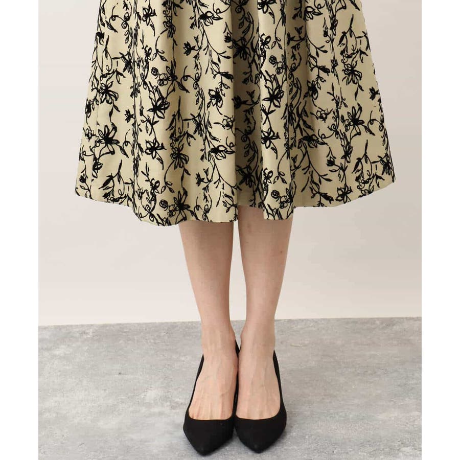 トレンドのフロッキープリントを施したボリューム感がポイントのフレアースカート。繊細な花柄は女性らしい雰囲気に。