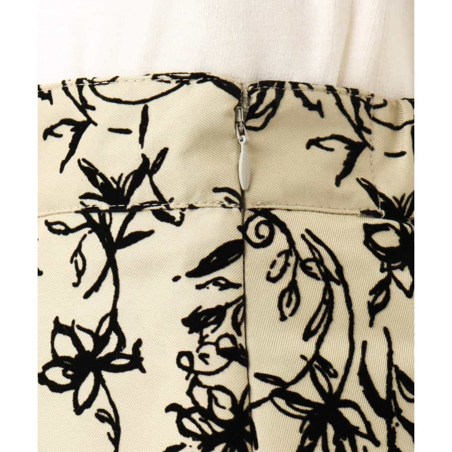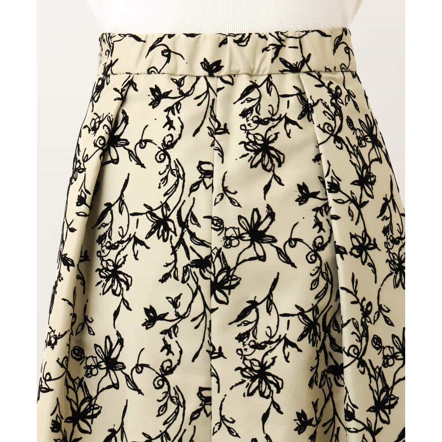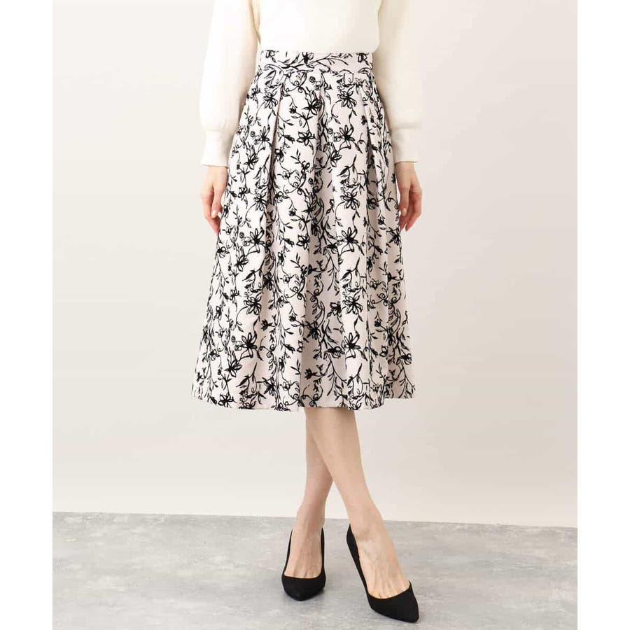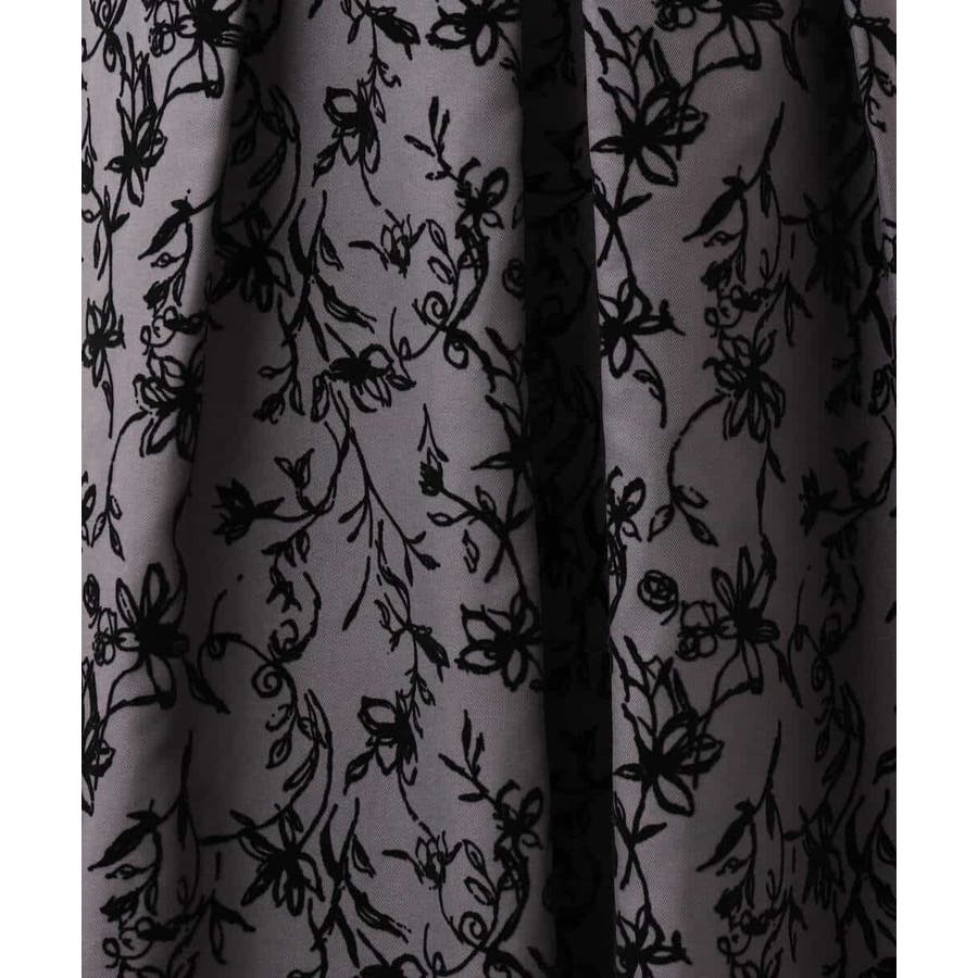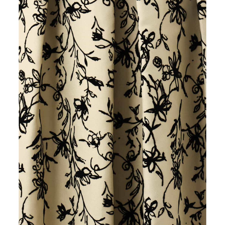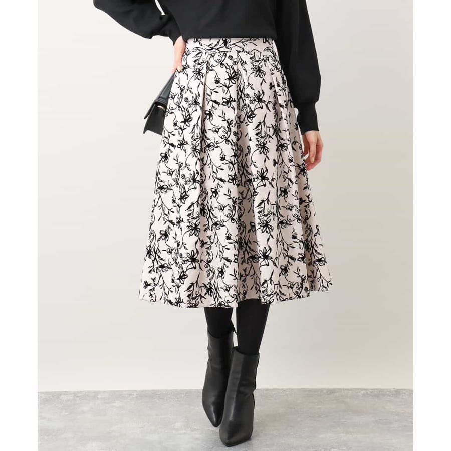 トレンドのフロッキープリントを施したボリューム感がポイントのフレアースカート。繊細な花柄は女性らしい雰囲気に。