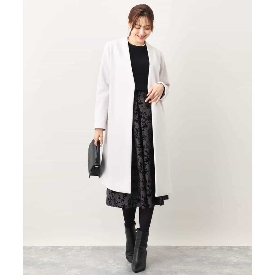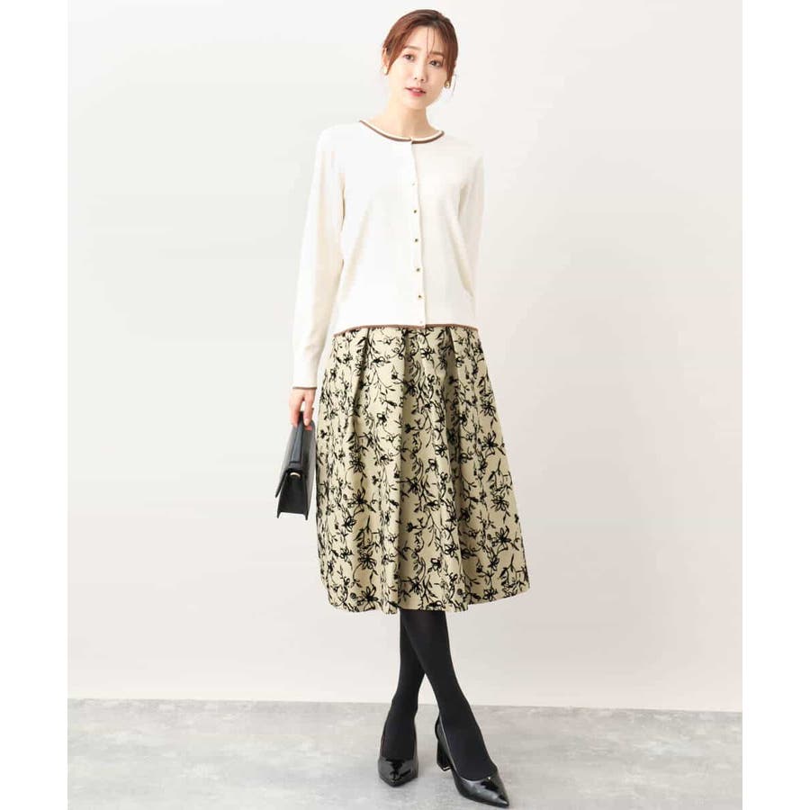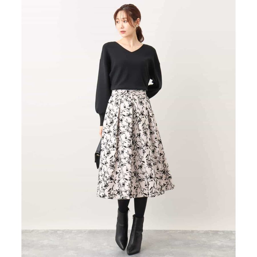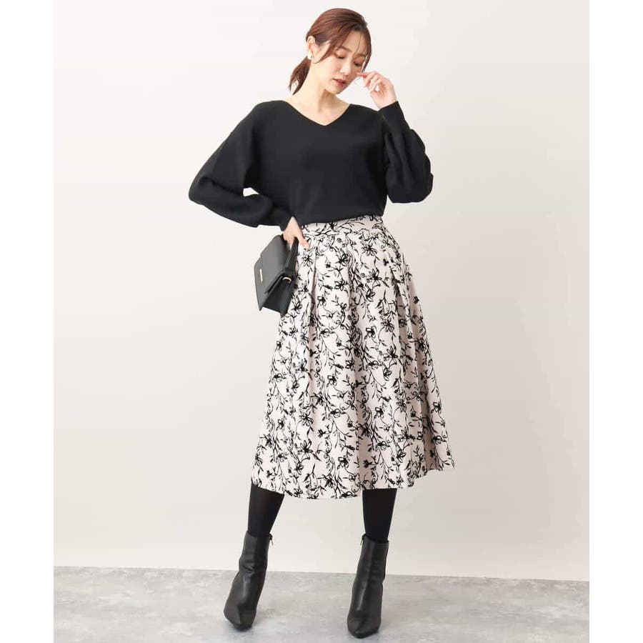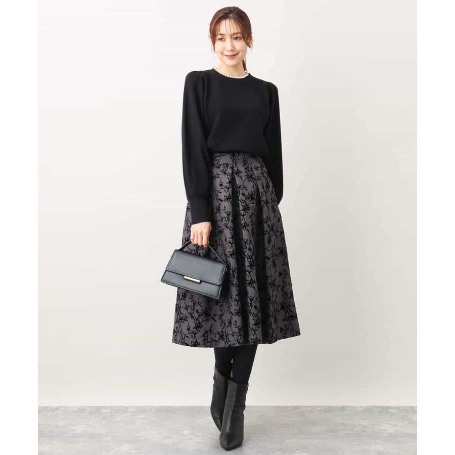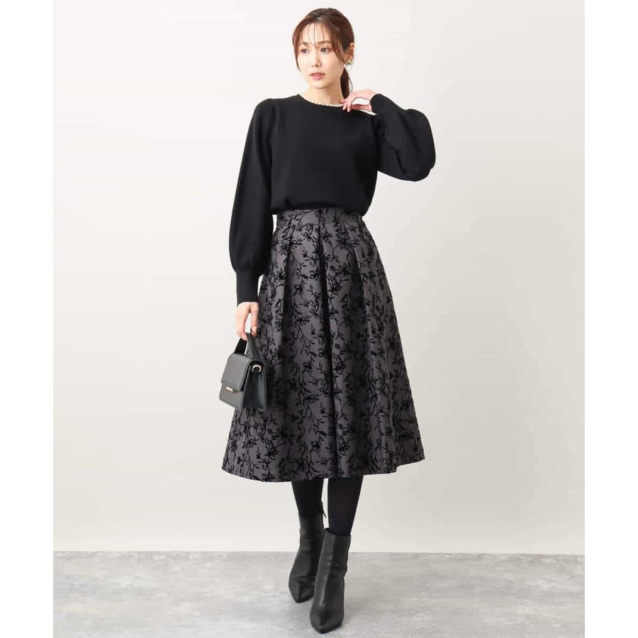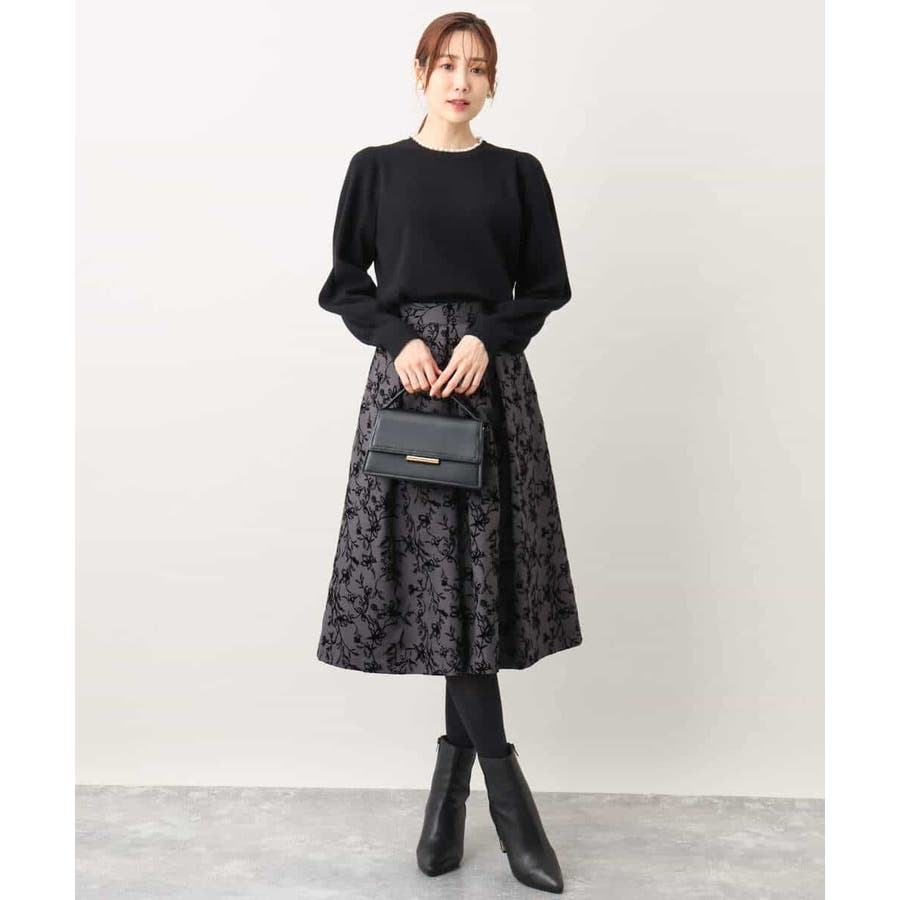 トレンドのフロッキープリントを施したボリューム感がポイントのフレアースカート。繊細な花柄は女性らしい雰囲気に。