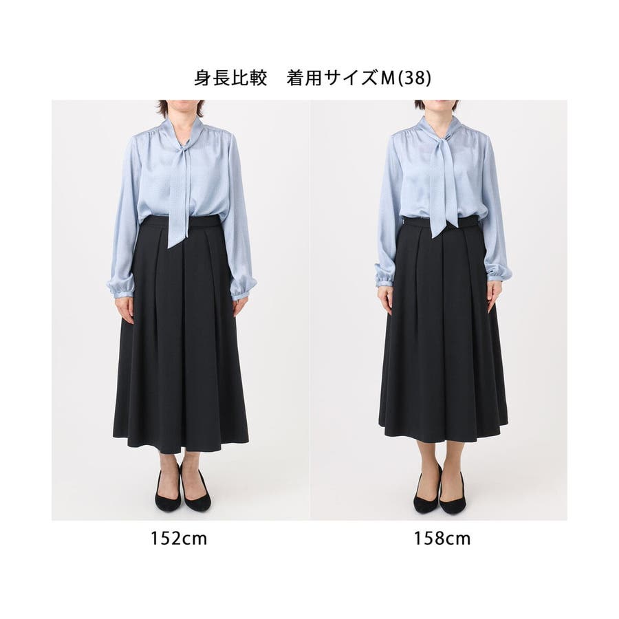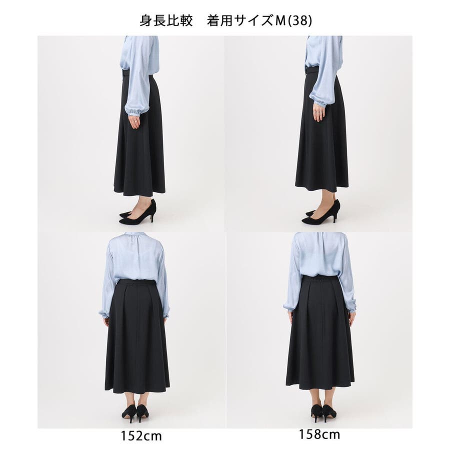 裾まできれいに落ちるタックフレアーのシルエットがきれいなスカート。ウエストはポイントに共地ベルトデザインに。脇にはポケット、後ろウエストは嬉しいゴム入りです。