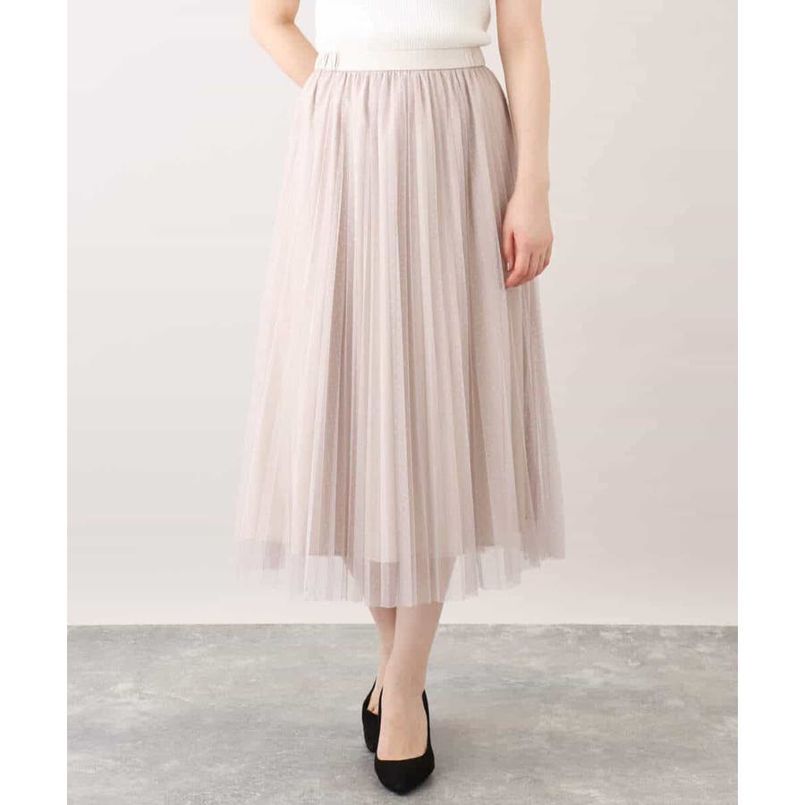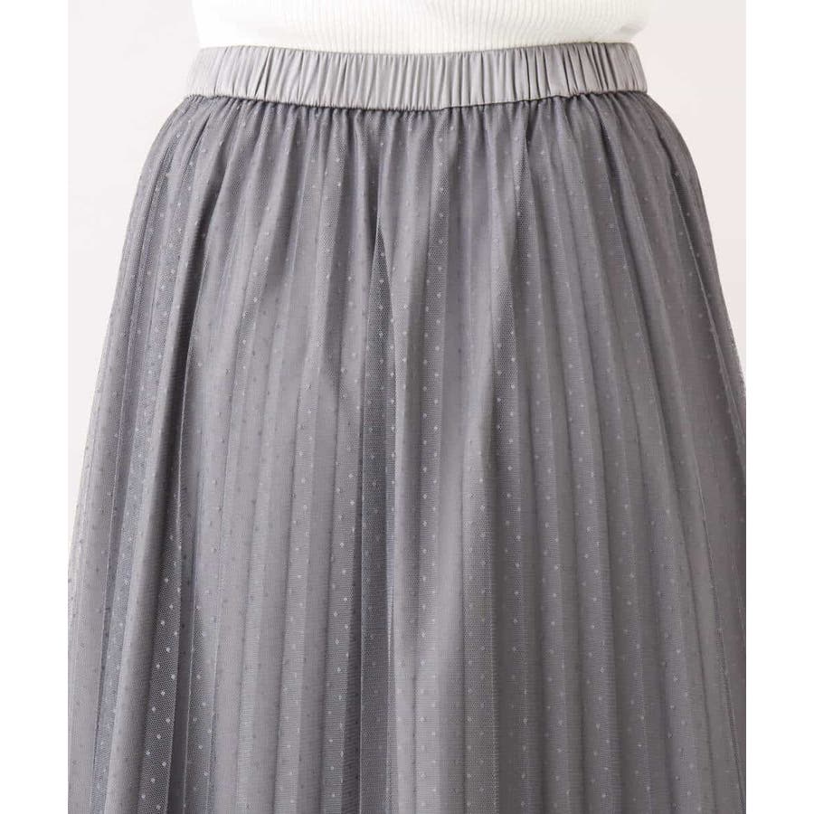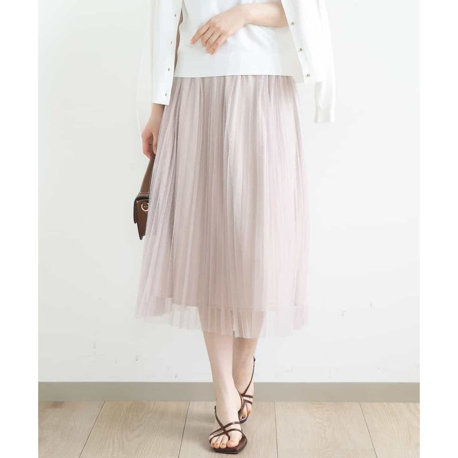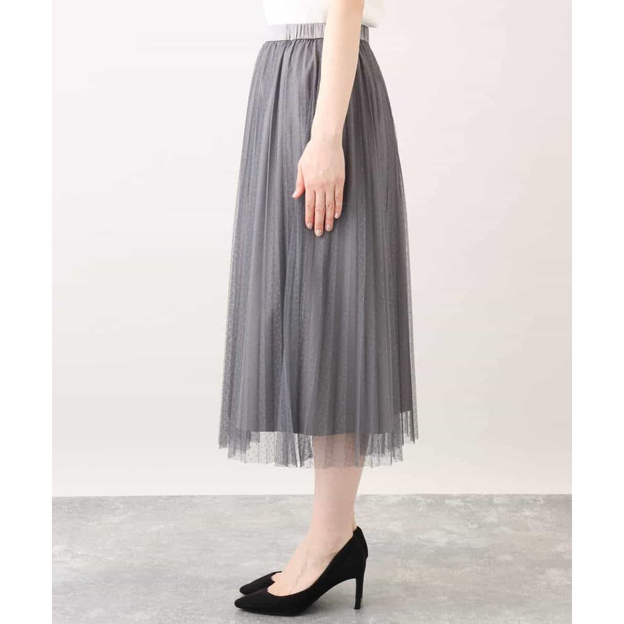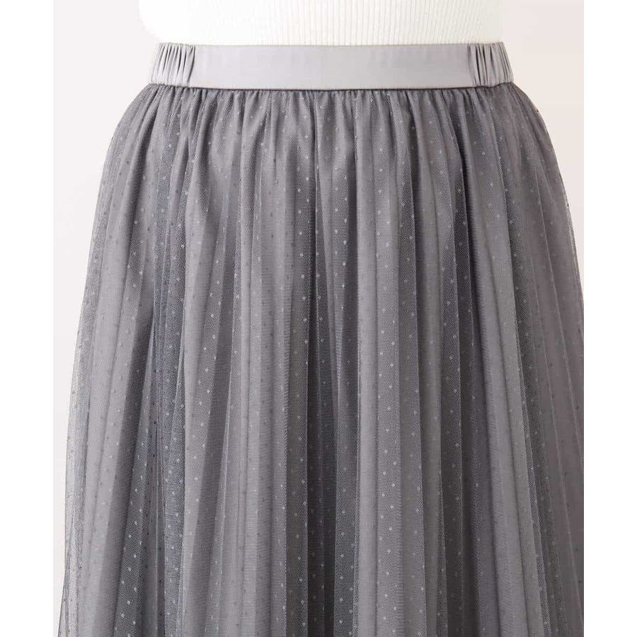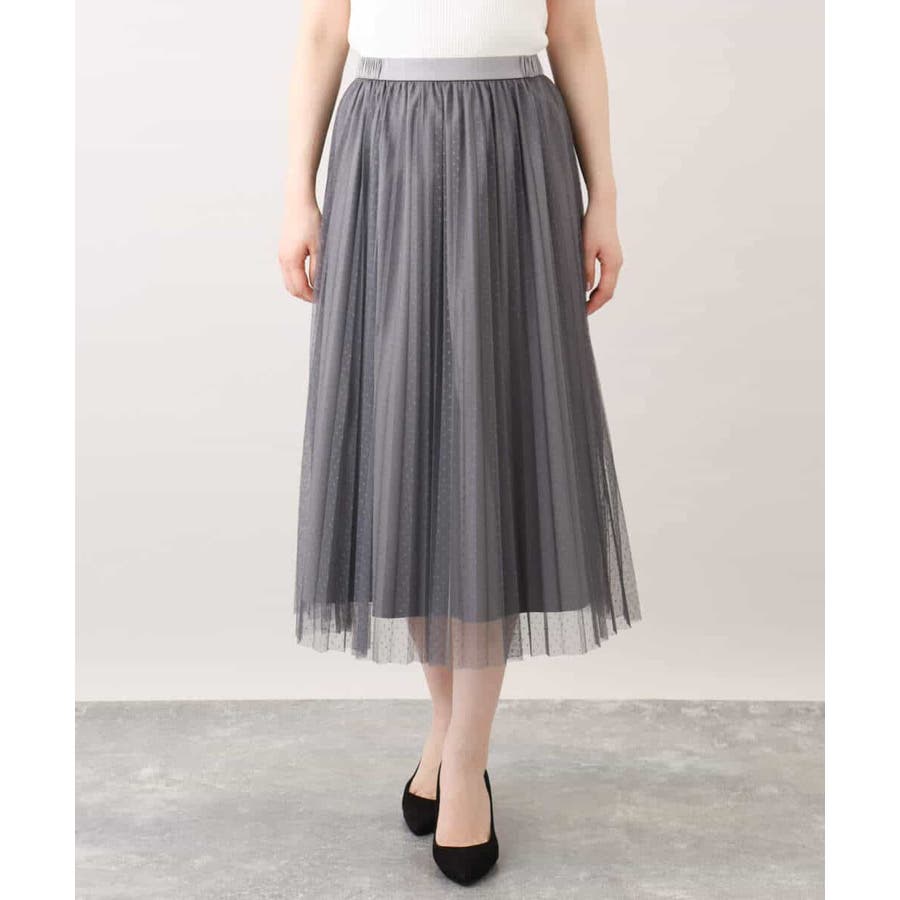 さりげないドット柄が印象的なチュールのプリーツスカート。フロントのウエストベルトはギャザーの寄らない仕様で、トップスをインしてもきれいめに履きこなせるのが嬉しい。