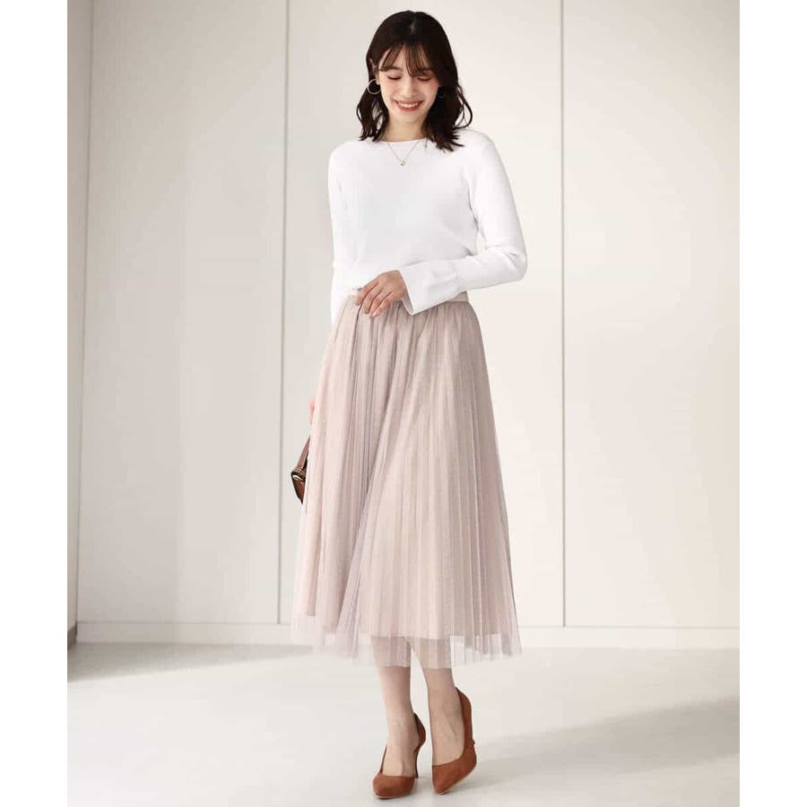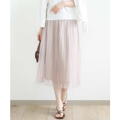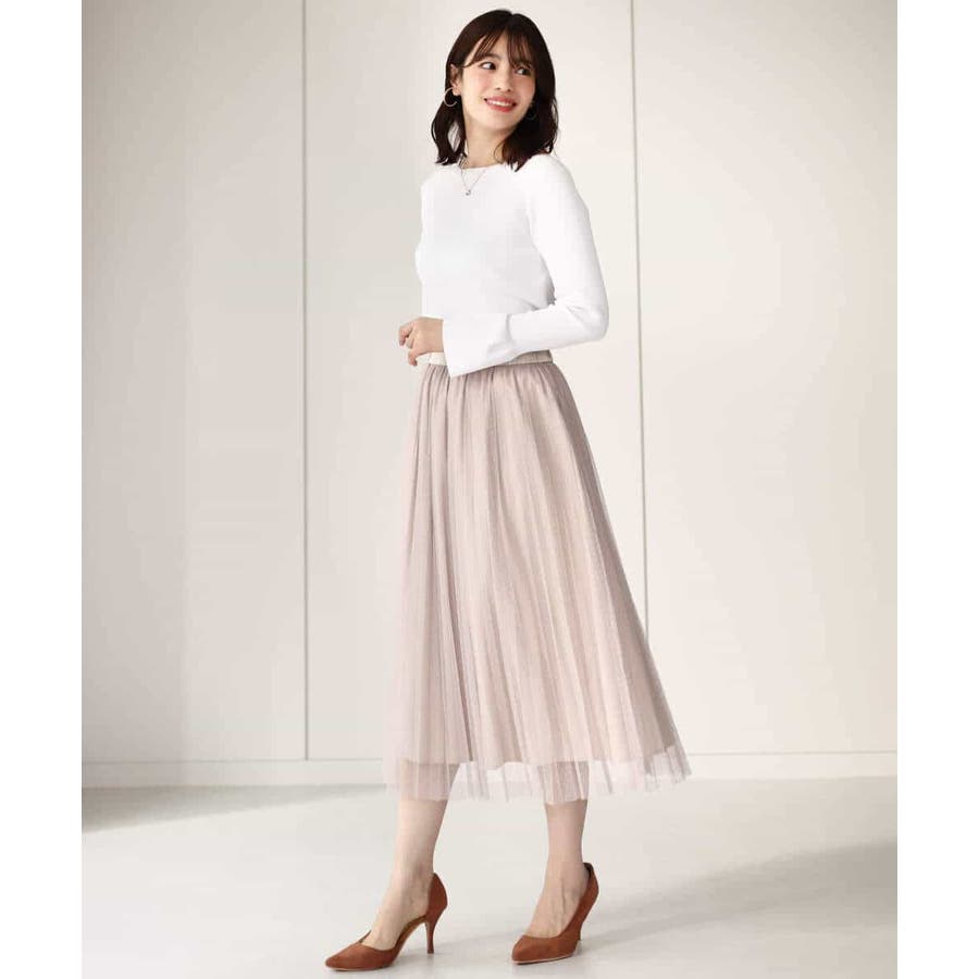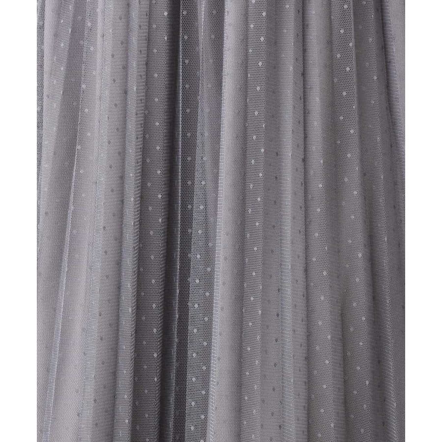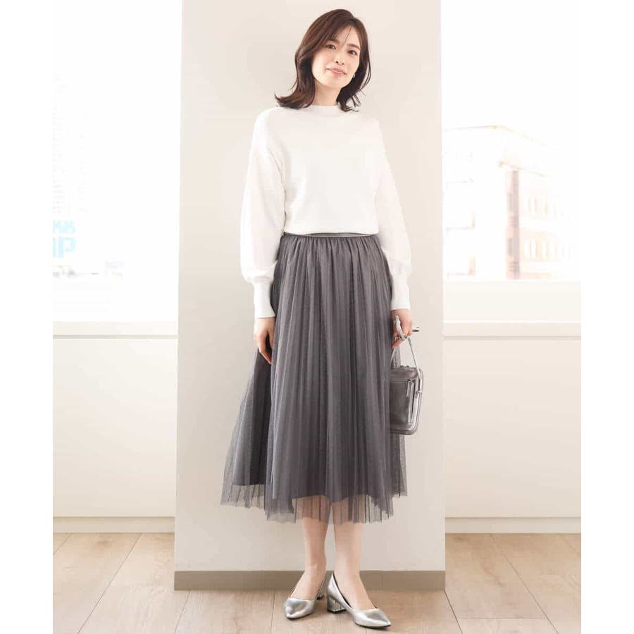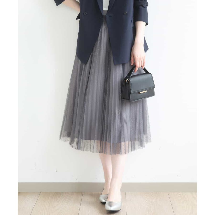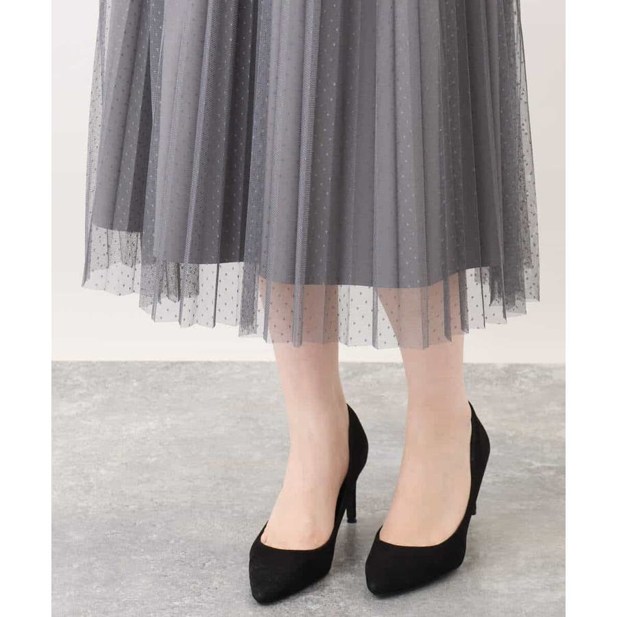 さりげないドット柄が印象的なチュールのプリーツスカート。フロントのウエストベルトはギャザーの寄らない仕様で、トップスをインしてもきれいめに履きこなせるのが嬉しい。