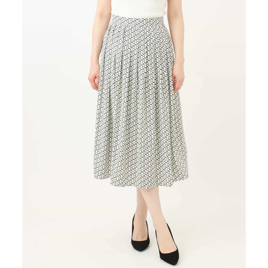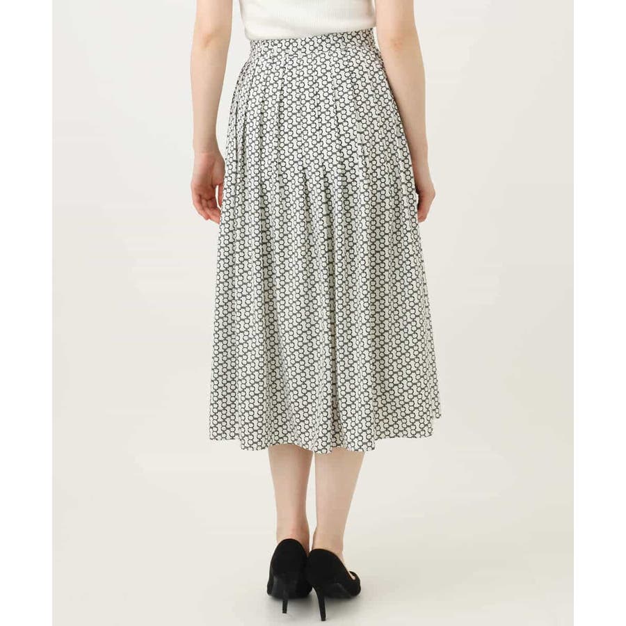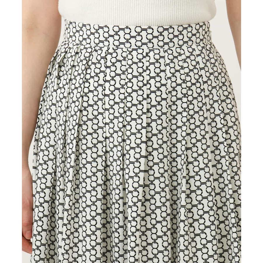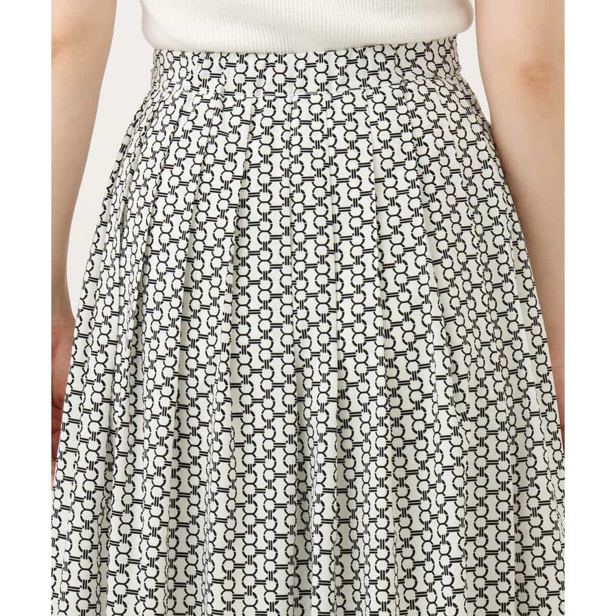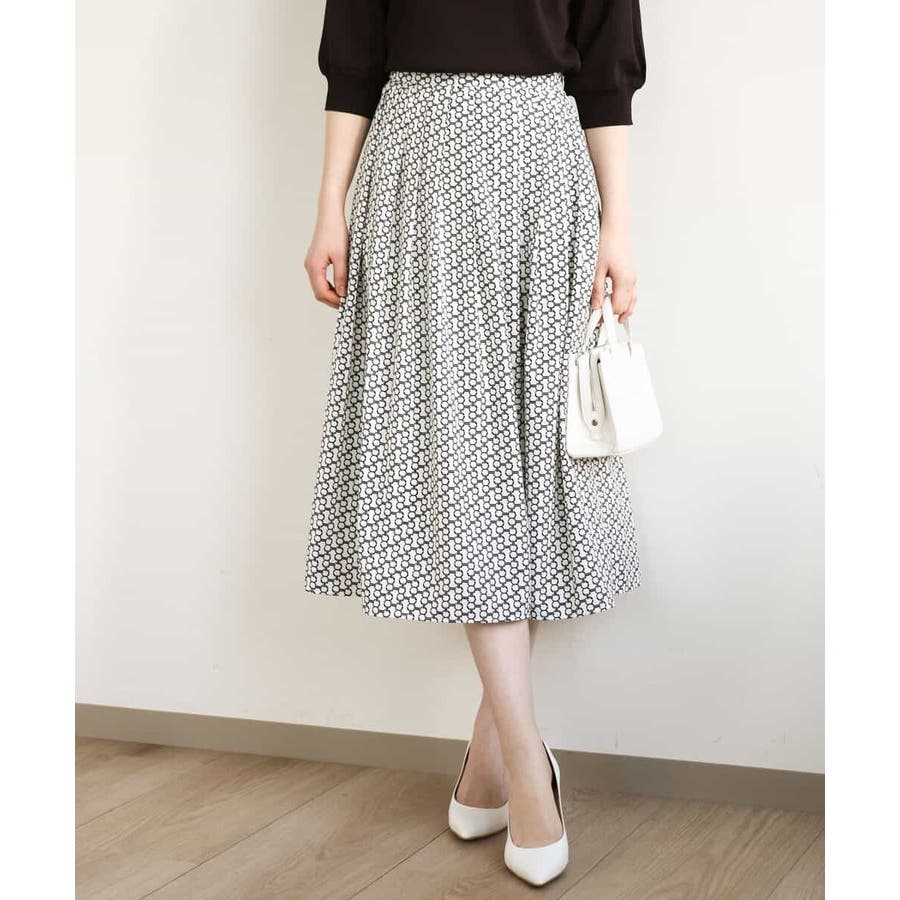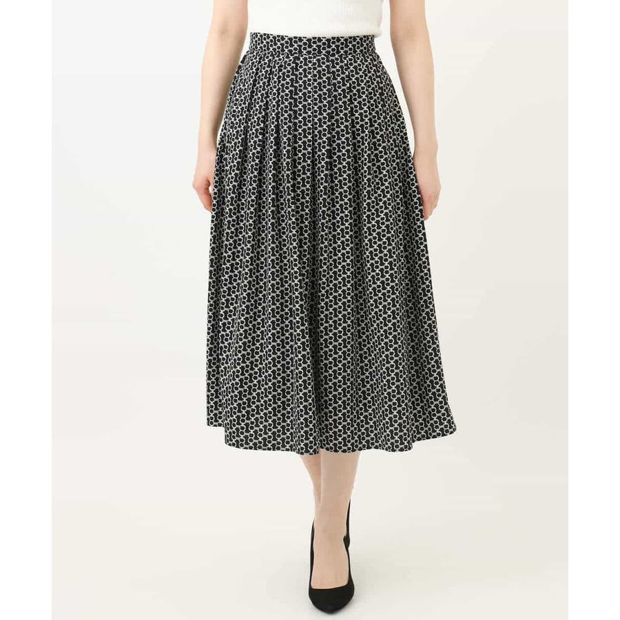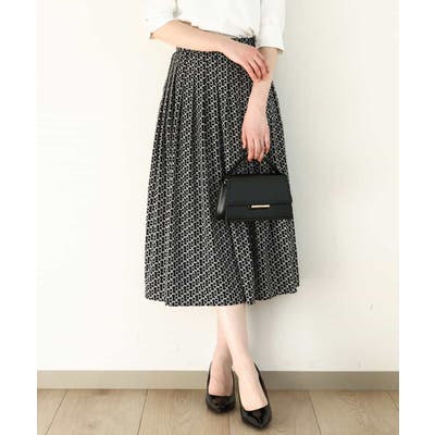ビットを並べたようなプリントが着こなしのポイントになるスカート。タックを取ったウエストが気になるお腹周りをカバーし、裾に向かって広がるフレアーが美しいシルエットに。
