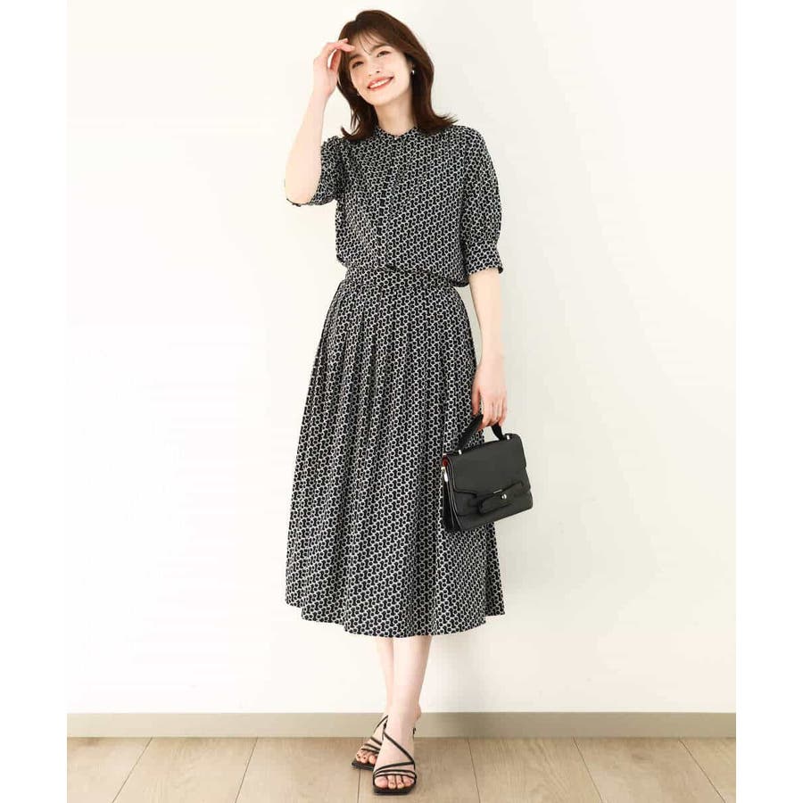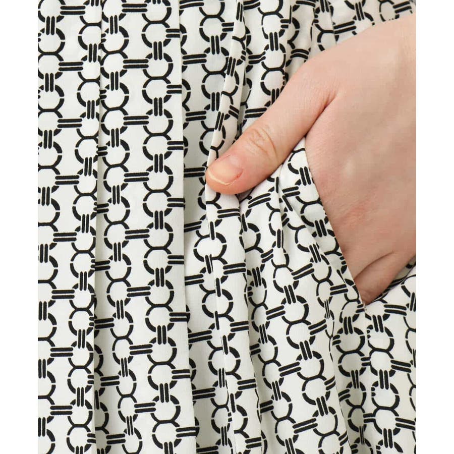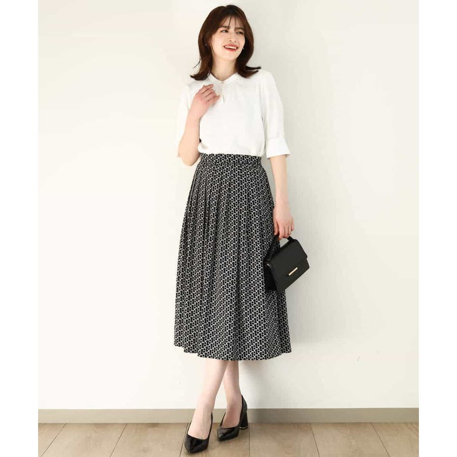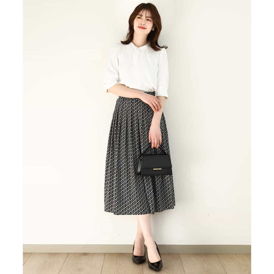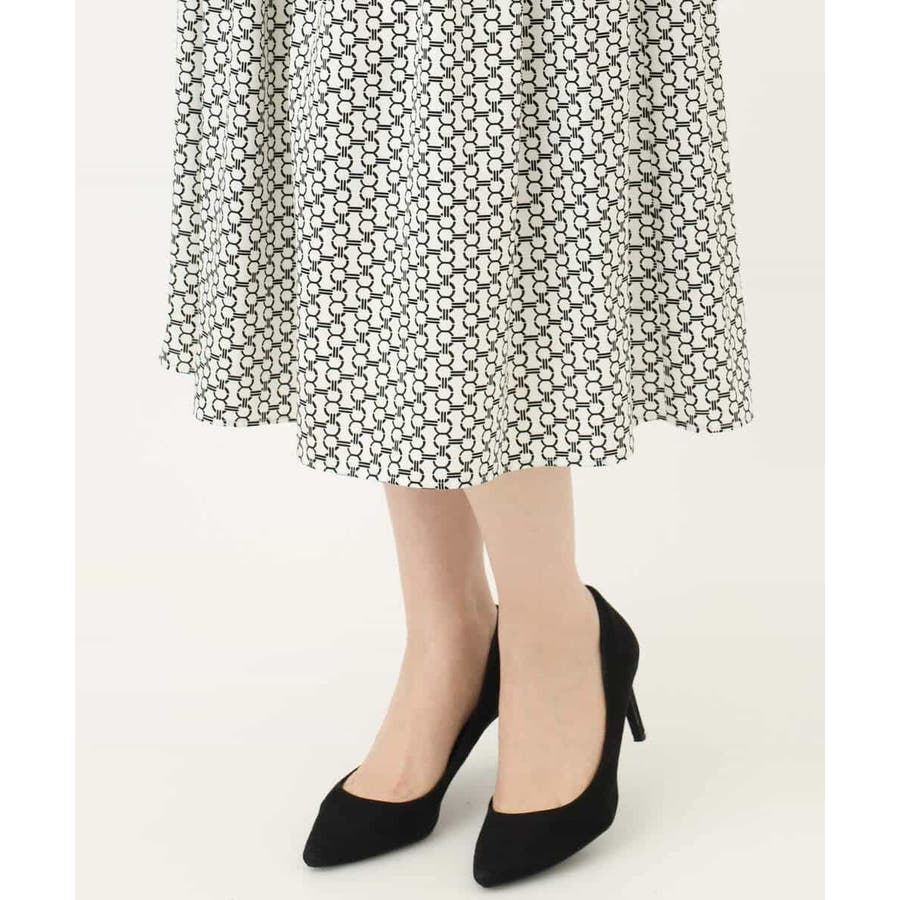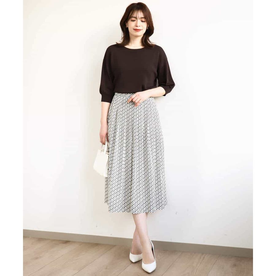 ビットを並べたようなプリントが着こなしのポイントになるスカート。タックを取ったウエストが気になるお腹周りをカバーし、裾に向かって広がるフレアーが美しいシルエットに。