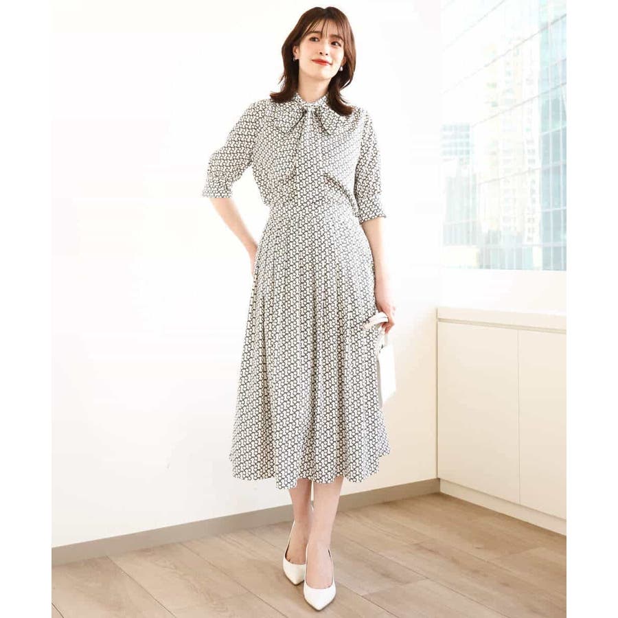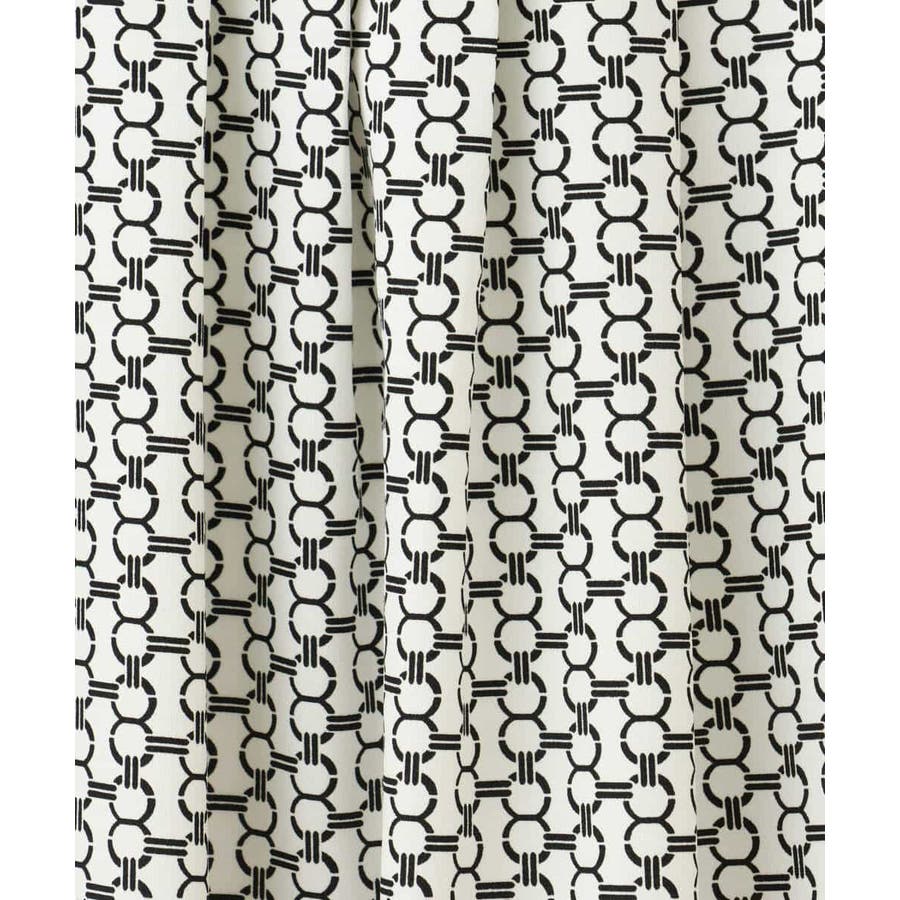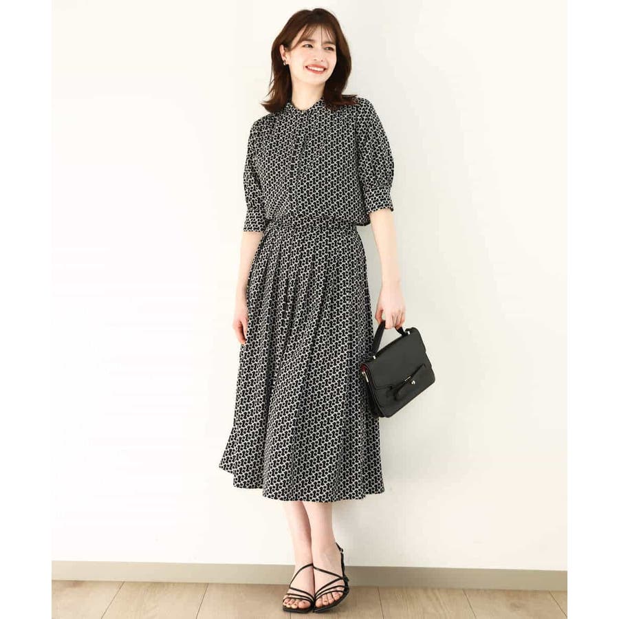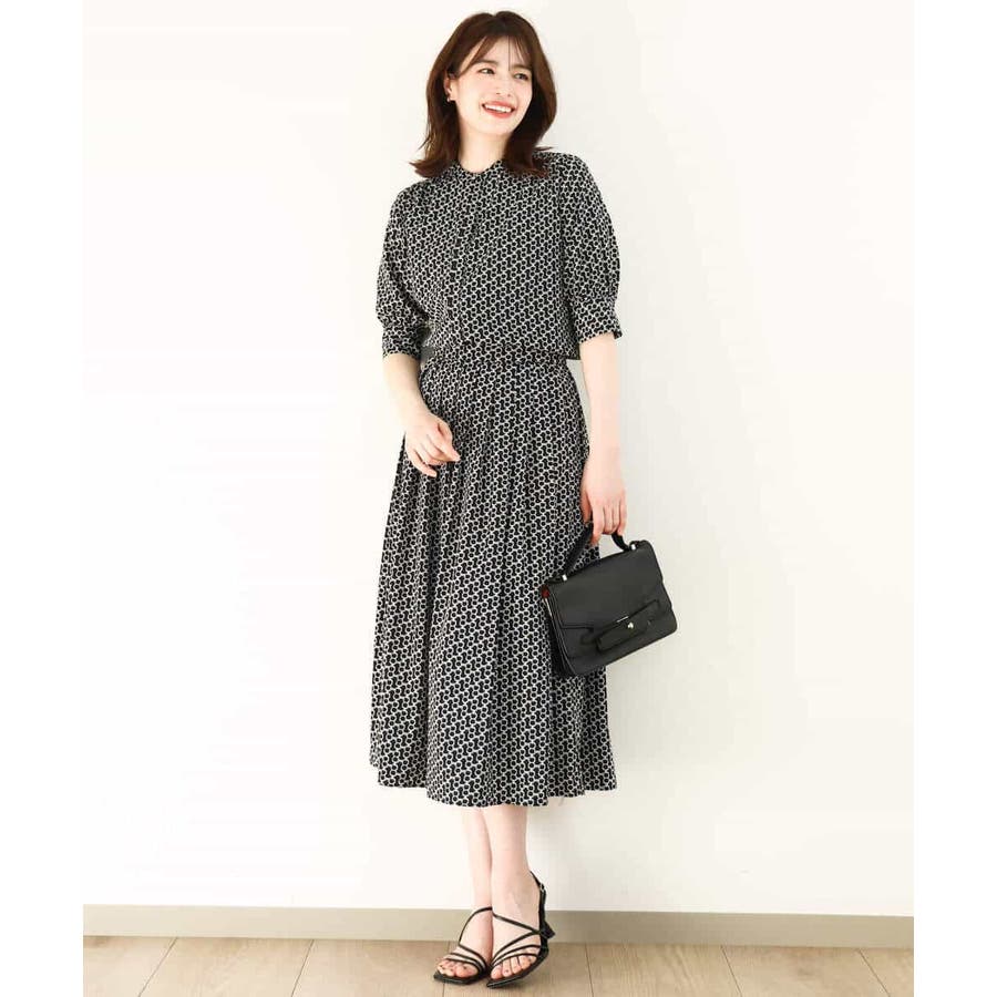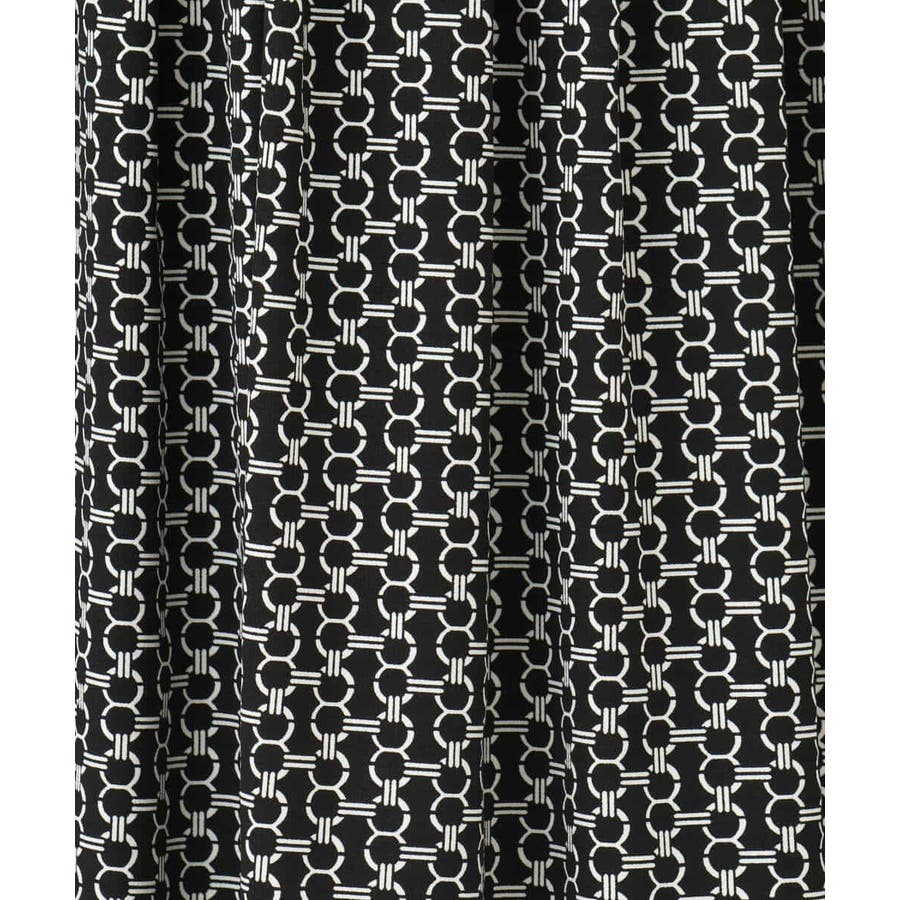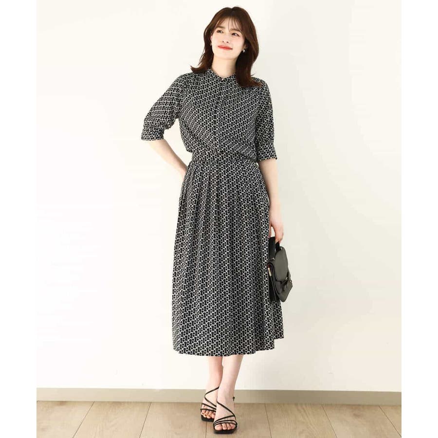 ビットを並べたようなプリントが着こなしのポイントになるスカート。タックを取ったウエストが気になるお腹周りをカバーし、裾に向かって広がるフレアーが美しいシルエットに。