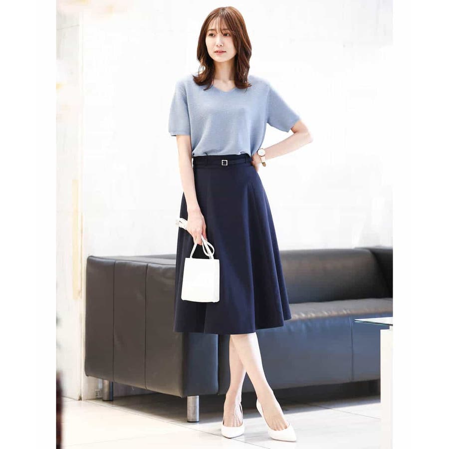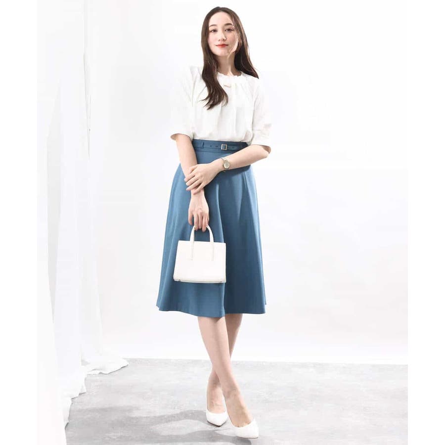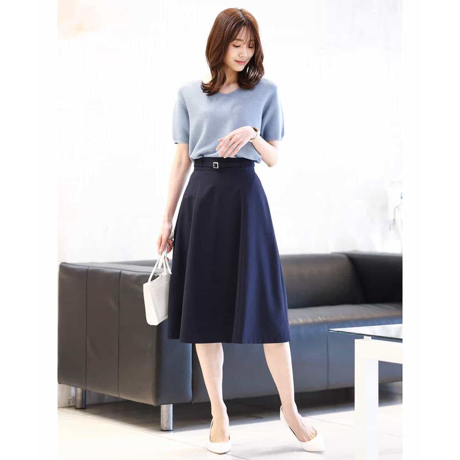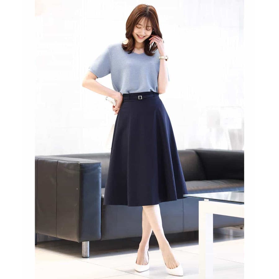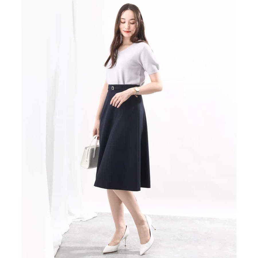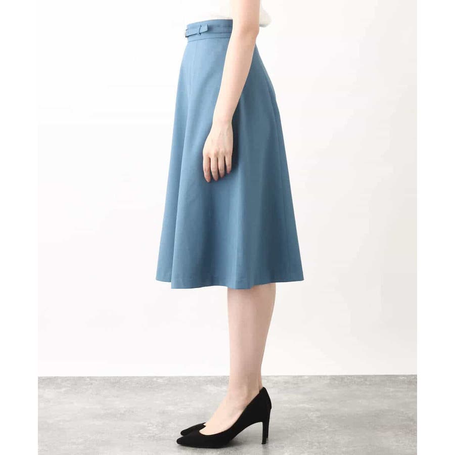 きれいに広がるフレアーが特徴のベーシックスカート。長すぎず短すぎない丈感で、通勤シーンにもぴったりです。共布ベルト付き。