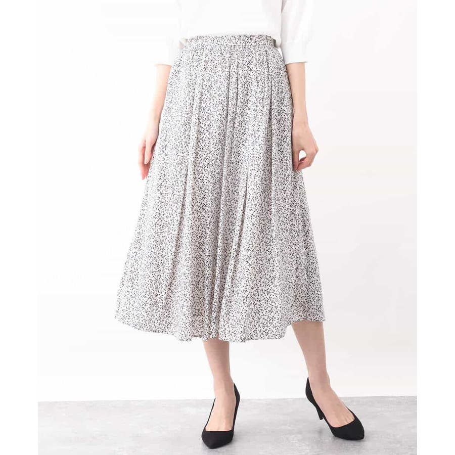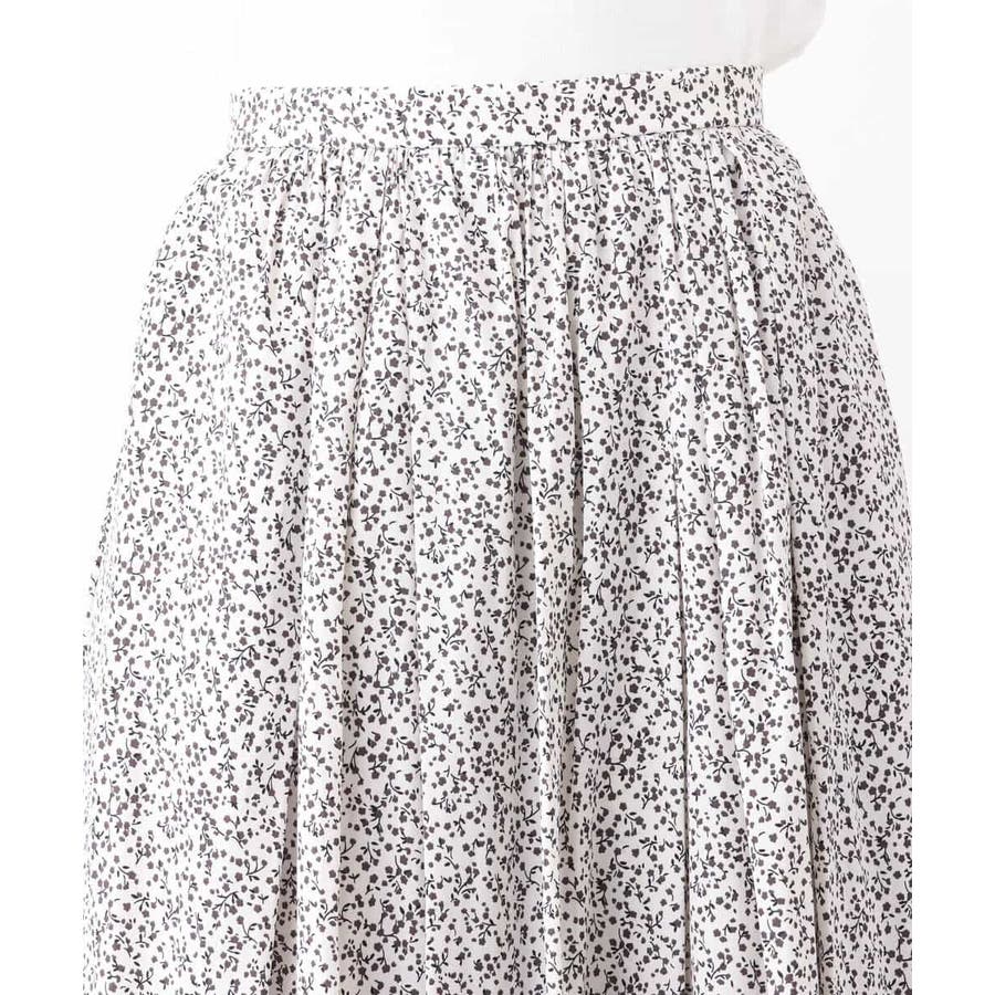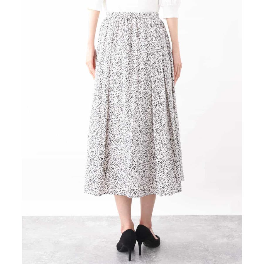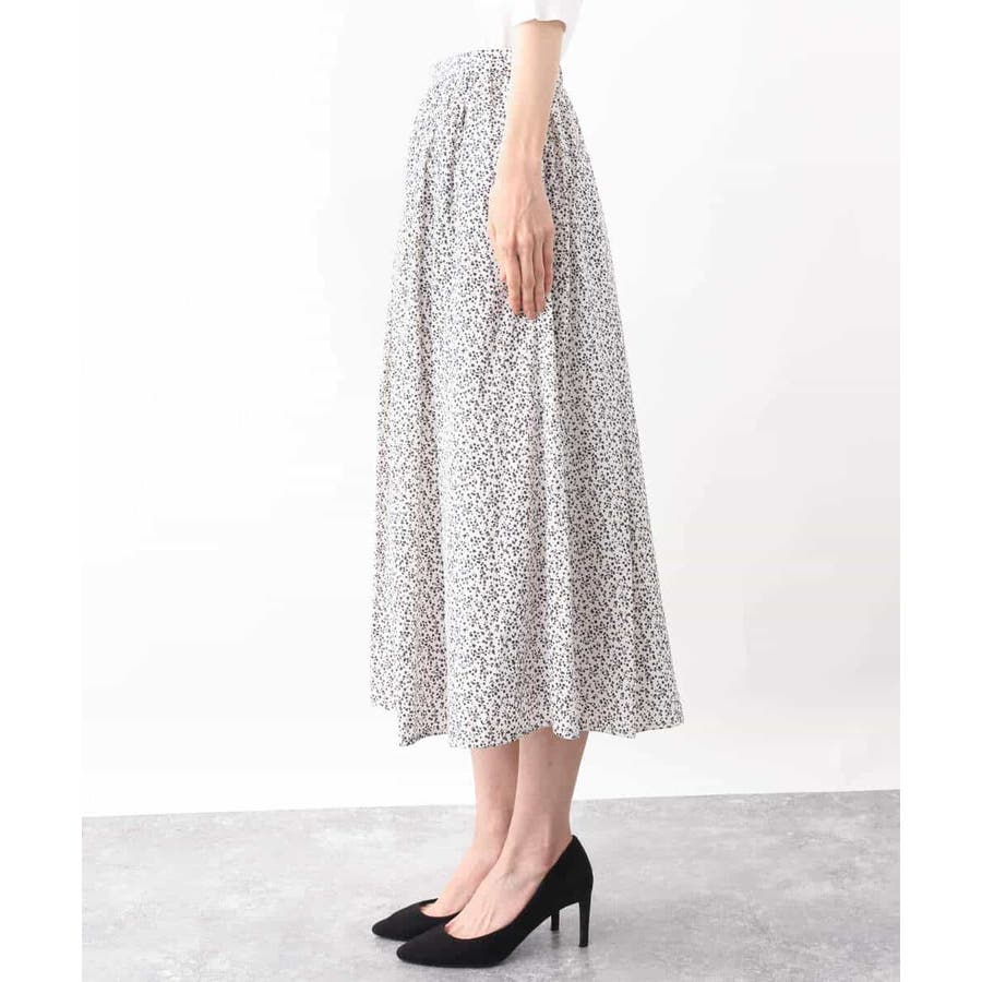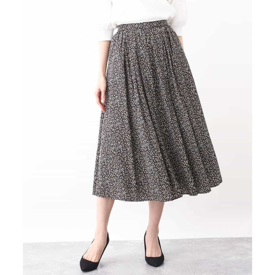 シックでシンプルな単色の小花柄が大人っぽい印象のスカート。タックとギャザーを寄せたたっぷりとした分量感のデザインながら、落ち感のある素材で広がりすぎずにすっきりと着こなせます。後ろウエストはゴム仕様でストレスフリーな着心地。