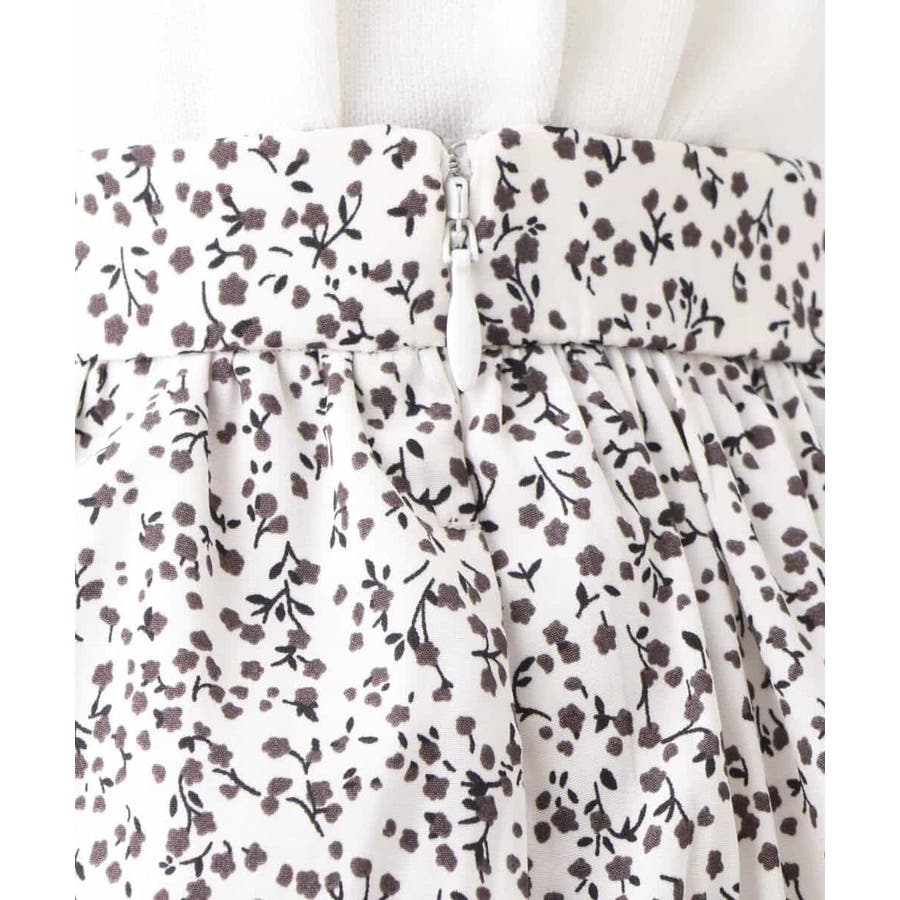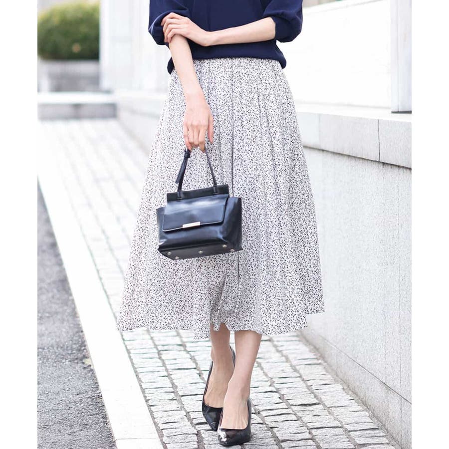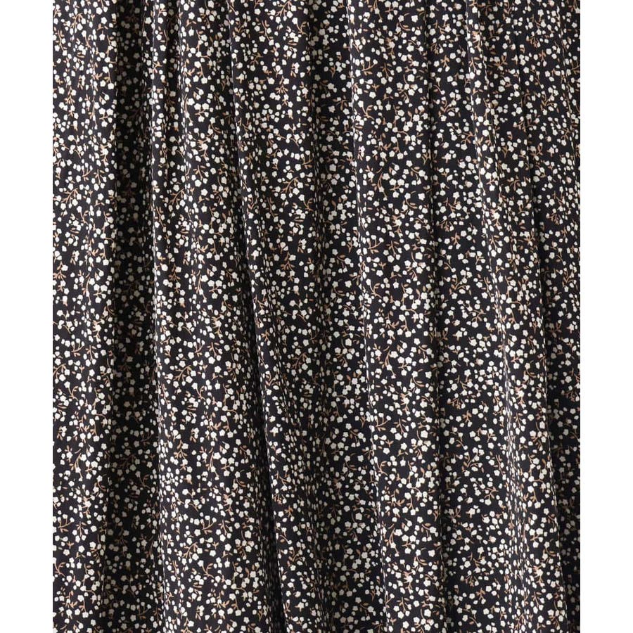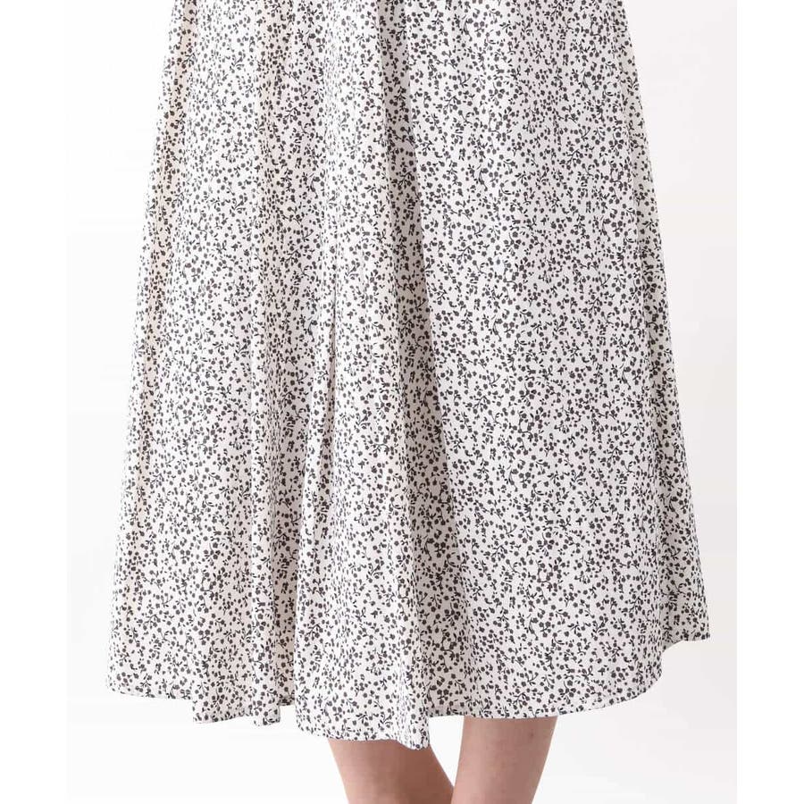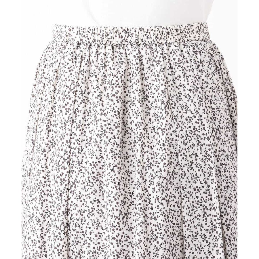 シックでシンプルな単色の小花柄が大人っぽい印象のスカート。タックとギャザーを寄せたたっぷりとした分量感のデザインながら、落ち感のある素材で広がりすぎずにすっきりと着こなせます。後ろウエストはゴム仕様でストレスフリーな着心地。