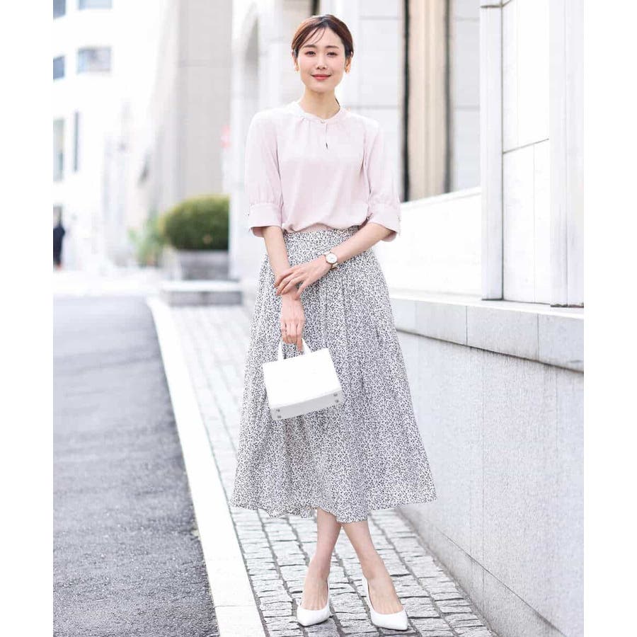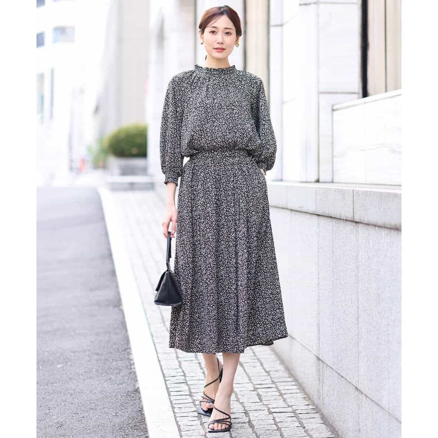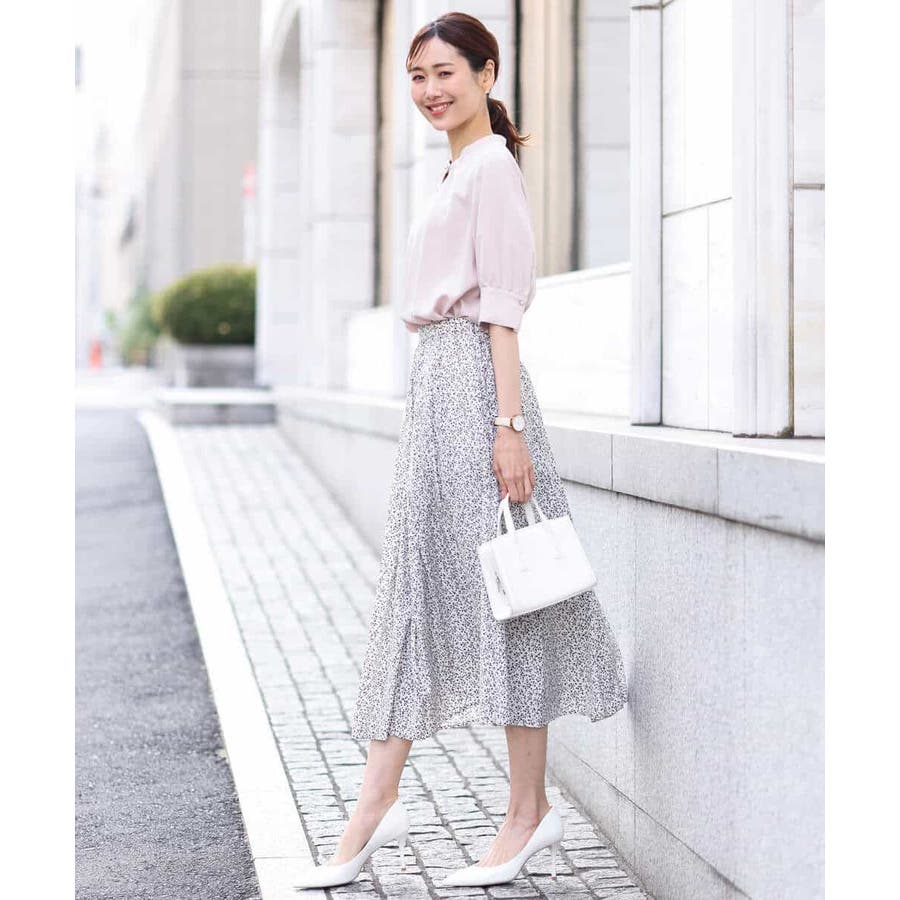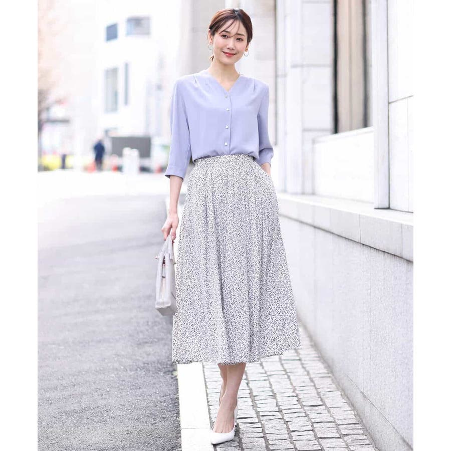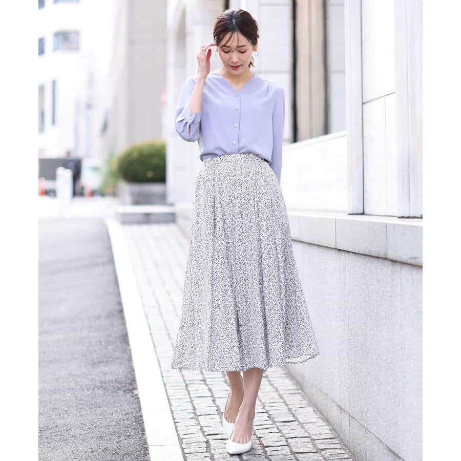 トップスをインして着こなすとスカートのきれいなシルエットが際立ちすっきりとした印象に。きれいめなブラウスやニットとコーディネートしてオフィスの通勤スタイルにもおすすめです。同柄のブラウスもご用意しているので、セットアップでワンピース見えの着こなしも可能。