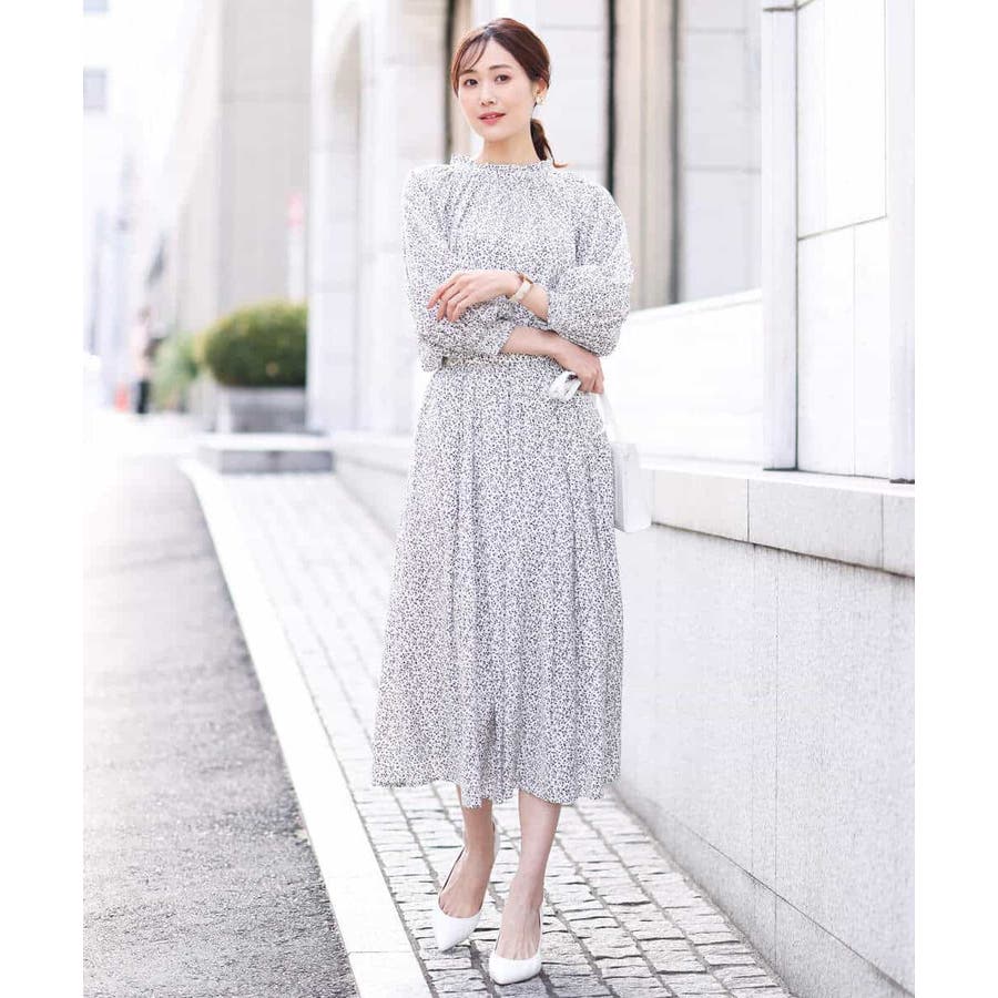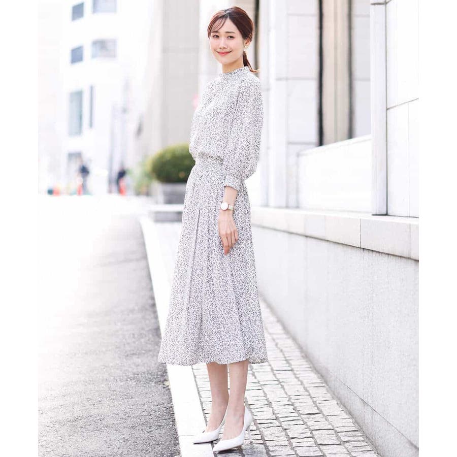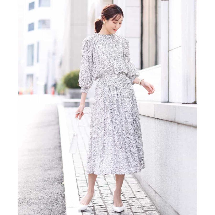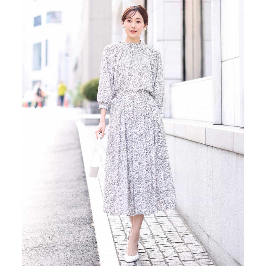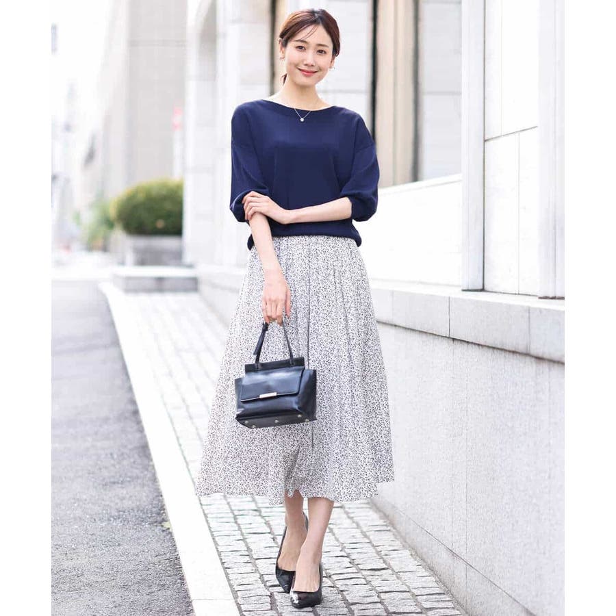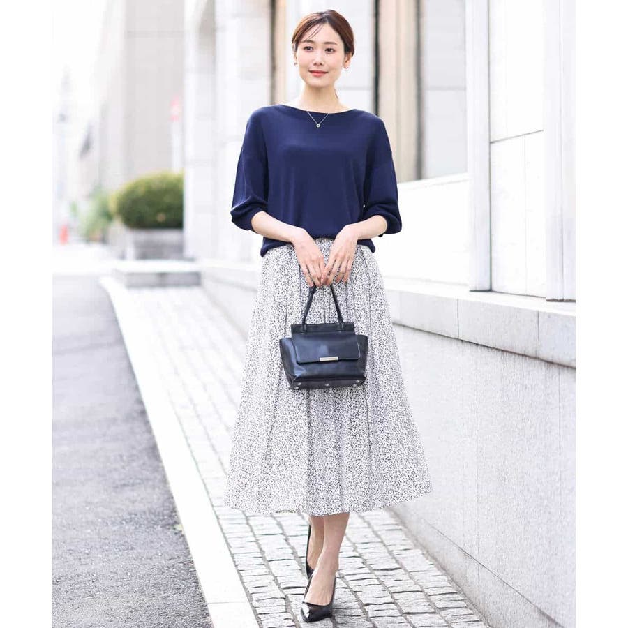 トップスをインして着こなすとスカートのきれいなシルエットが際立ちすっきりとした印象に。きれいめなブラウスやニットとコーディネートしてオフィスの通勤スタイルにもおすすめです。同柄のブラウスもご用意しているので、セットアップでワンピース見えの着こなしも可能。