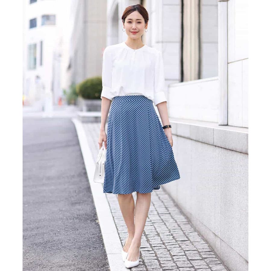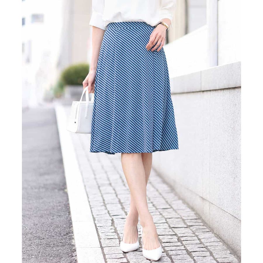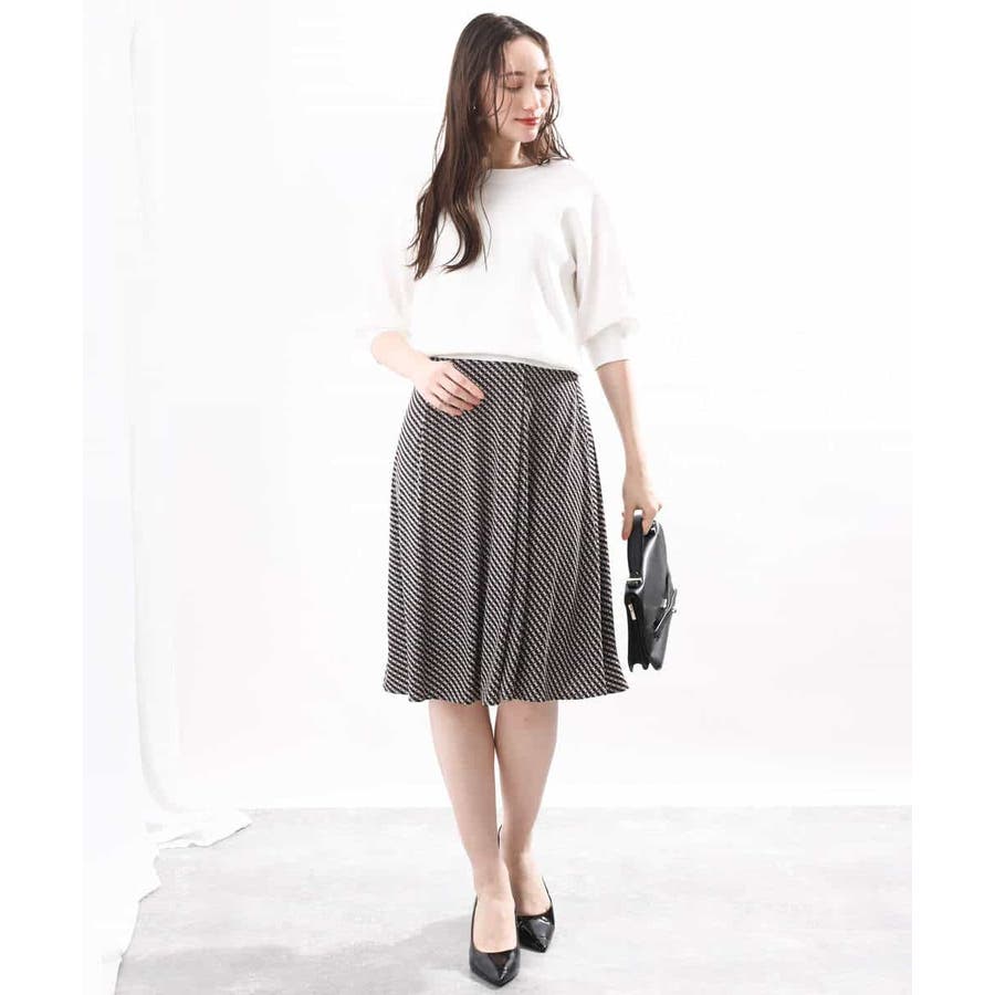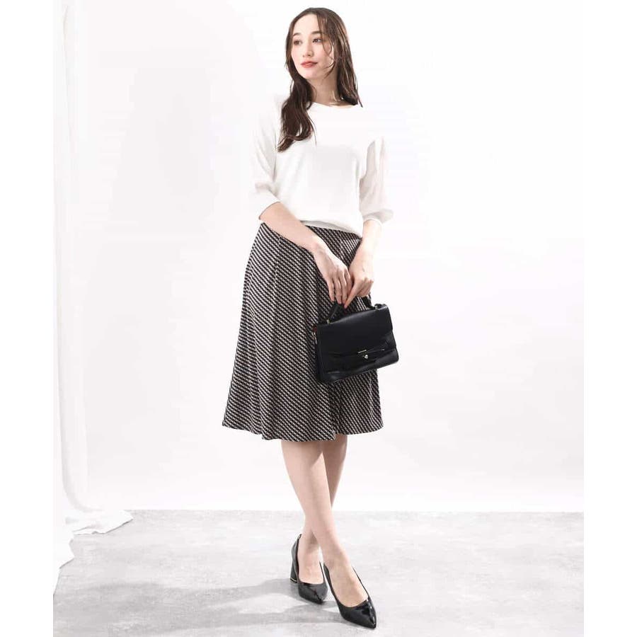 大人な幾何柄はオフィスやおでかけにも、さりげないきちんと感をプラスしてくれます。ニットやブラウスなどをインしてすっきりとした着こなしがおすすめです。同素材でワンピースのご用意もあり。