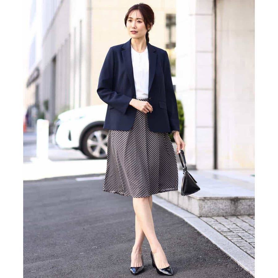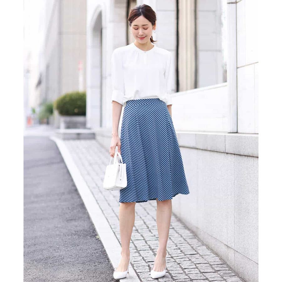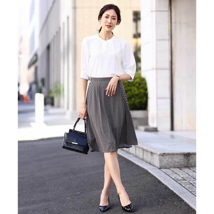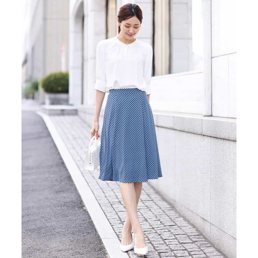 大人な幾何柄はオフィスやおでかけにも、さりげないきちんと感をプラスしてくれます。ニットやブラウスなどをインしてすっきりとした着こなしがおすすめです。同素材でワンピースのご用意もあり。