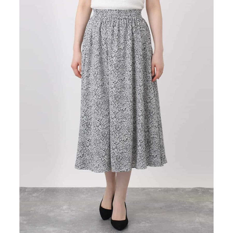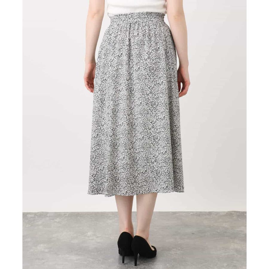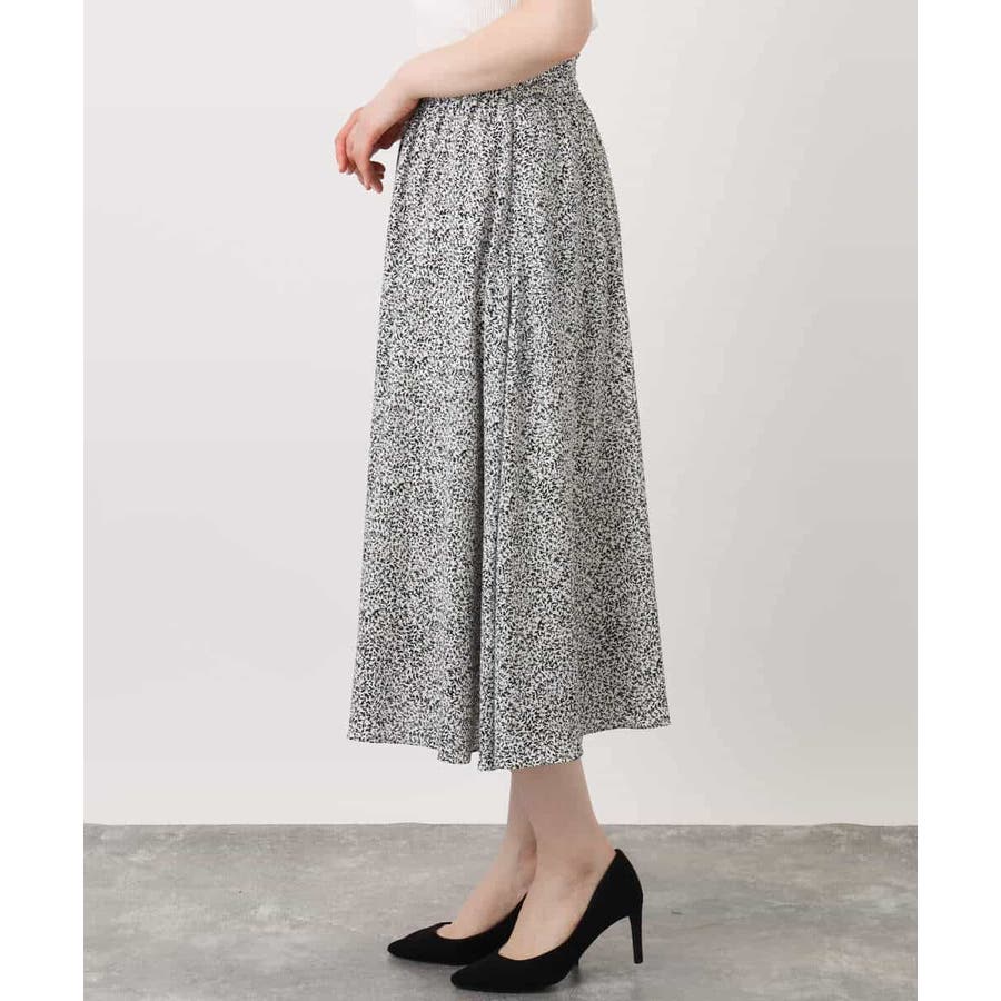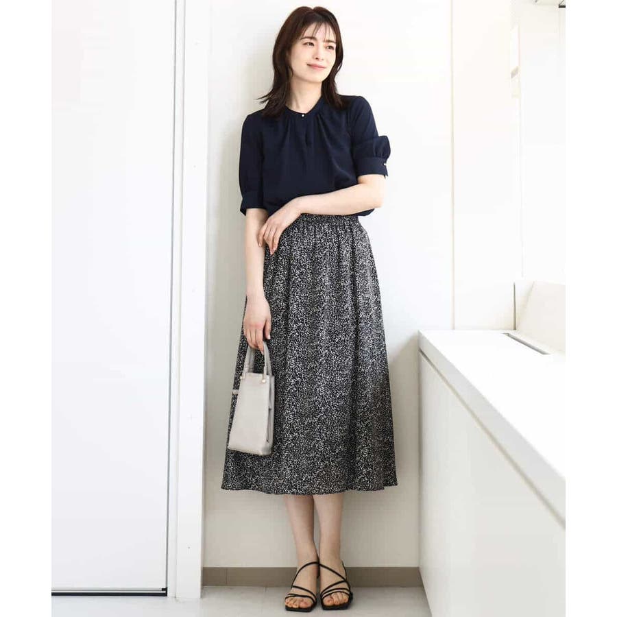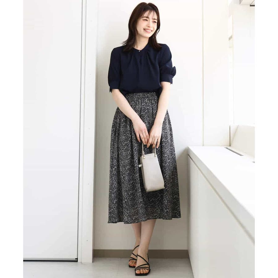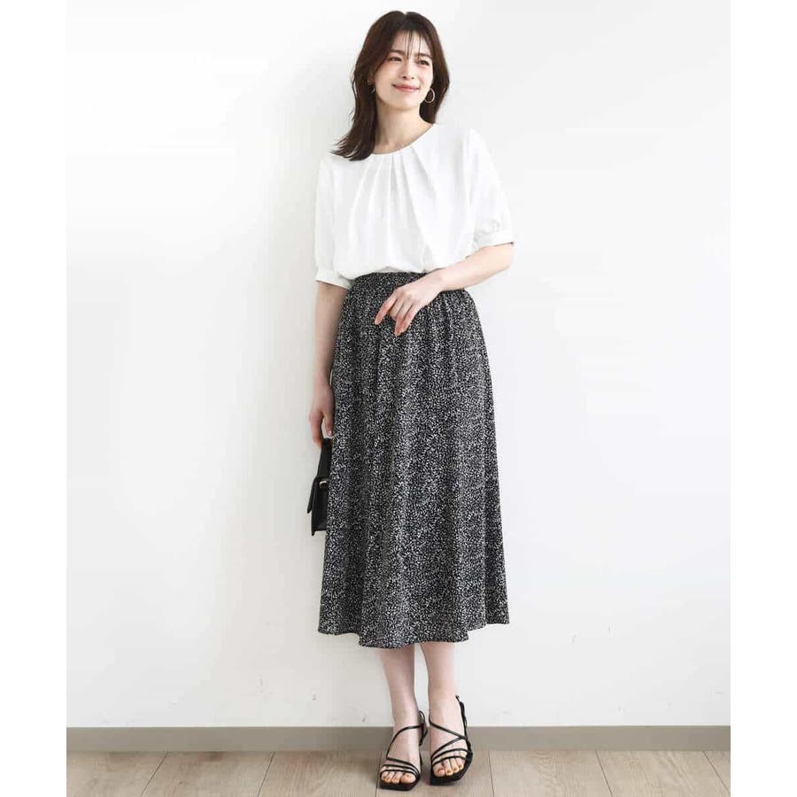 モノトーンの柄は合わせやすさもありながら、コーディネートのアクセントにも◎。同素材のブラウスとセットアップでワンピース見えの着こなしもおすすめです。