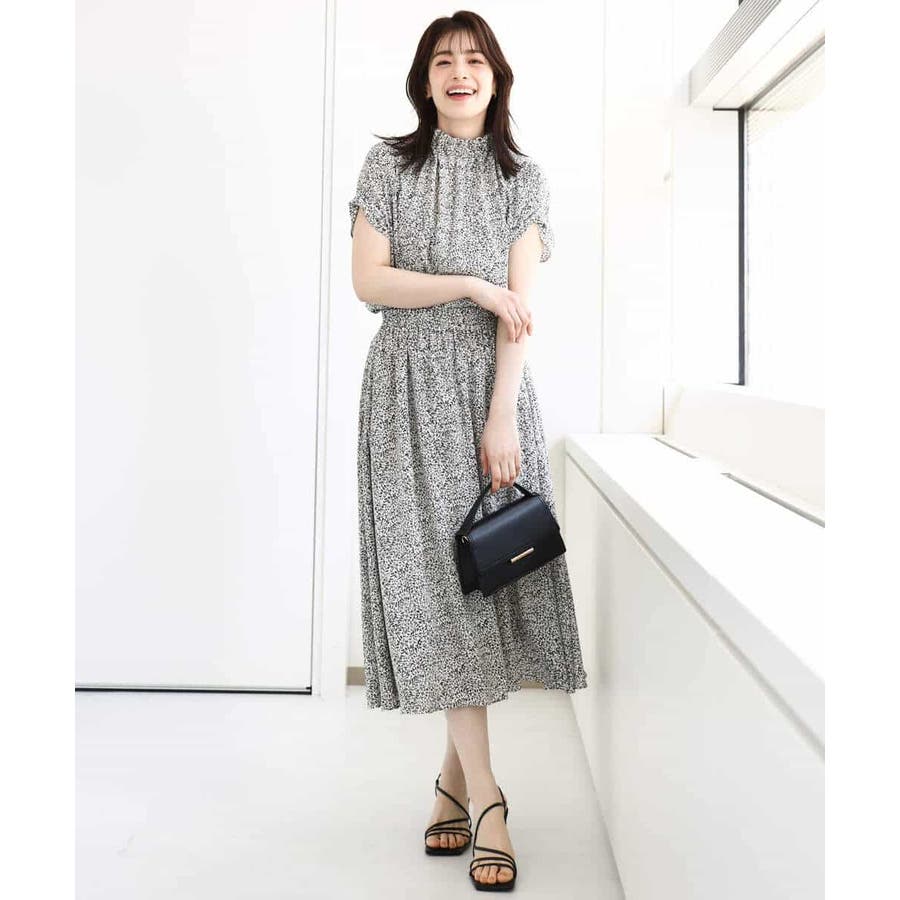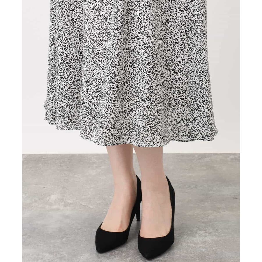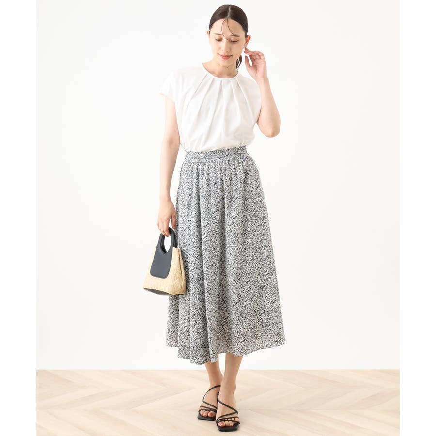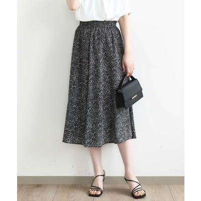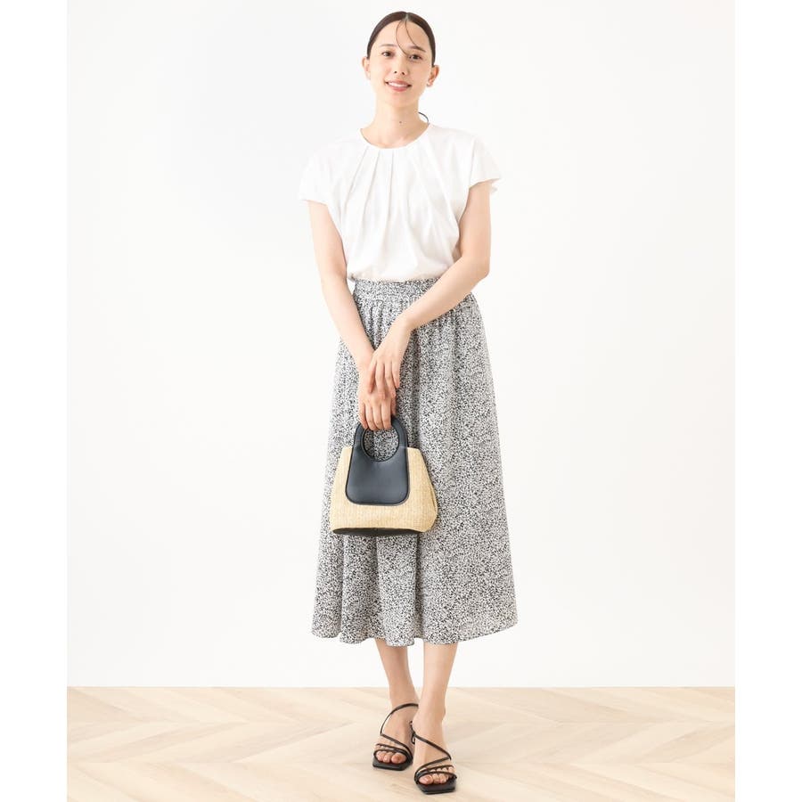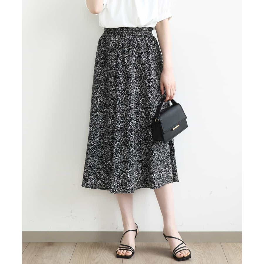 モノトーンの柄は合わせやすさもありながら、コーディネートのアクセントにも◎。同素材のブラウスとセットアップでワンピース見えの着こなしもおすすめです。