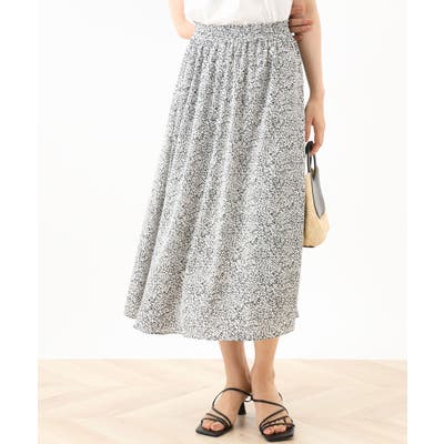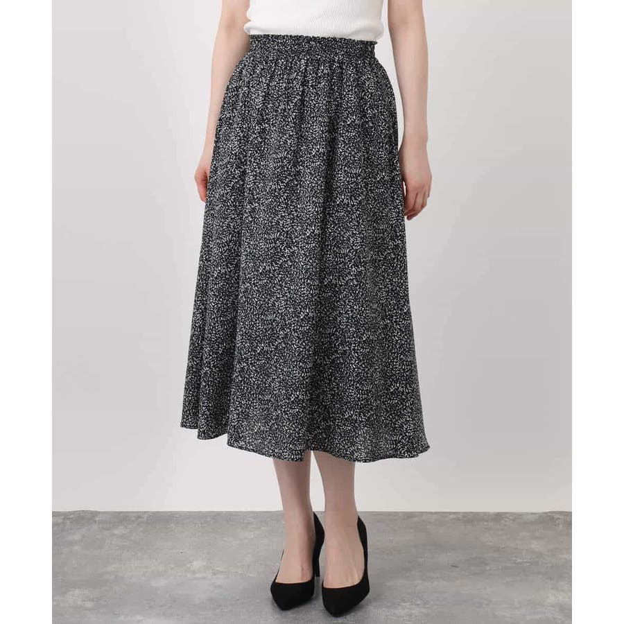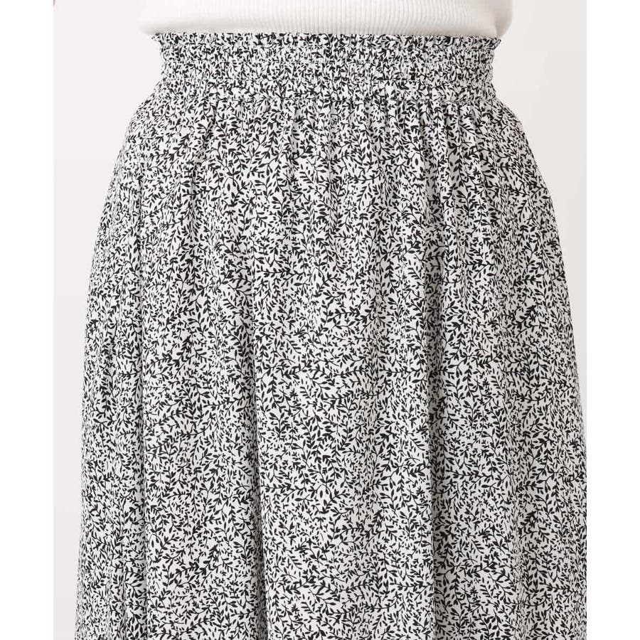 細かなリーフ柄が大人っぽいフレアースカート。たっぷりとギャザーを寄せたフレアーシルエットで、女性らしい上品な雰囲気に。ウエストは総ゴム仕様でストレスフリーな履き心地も嬉しい。