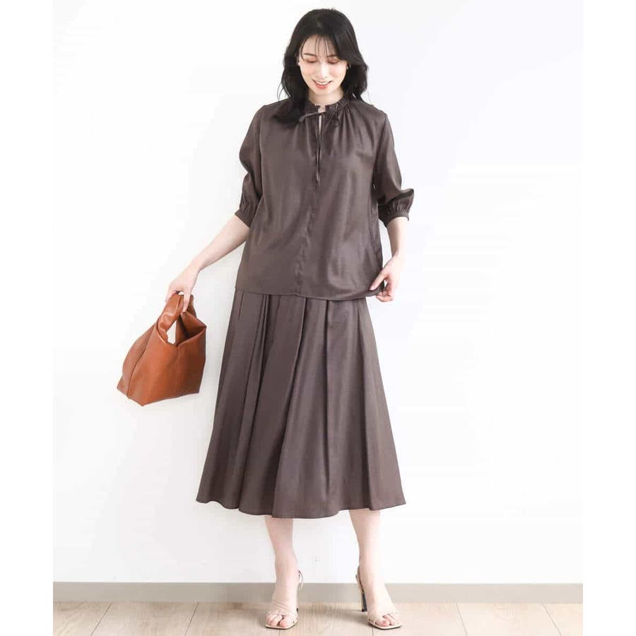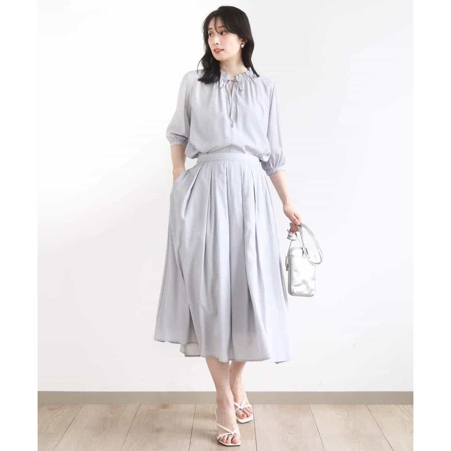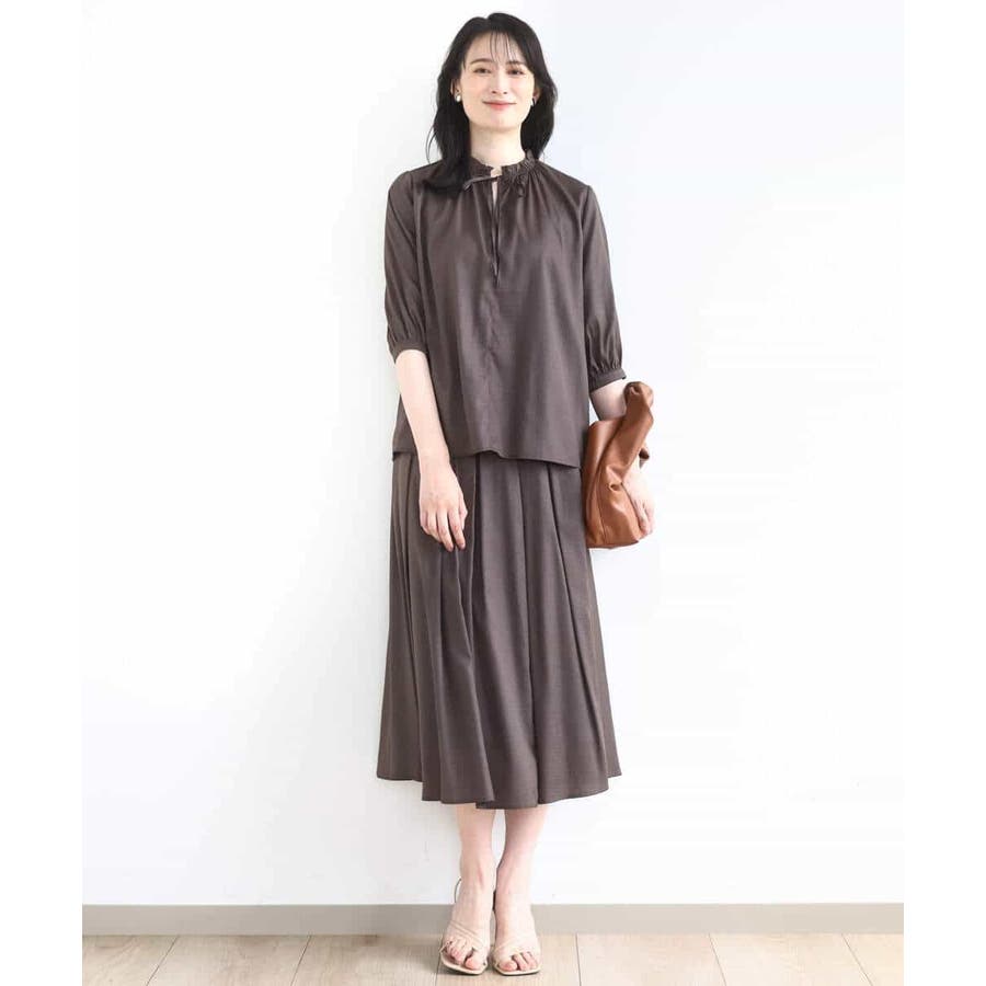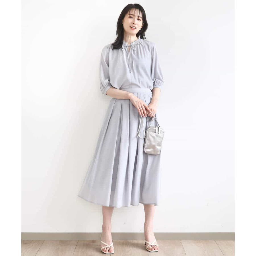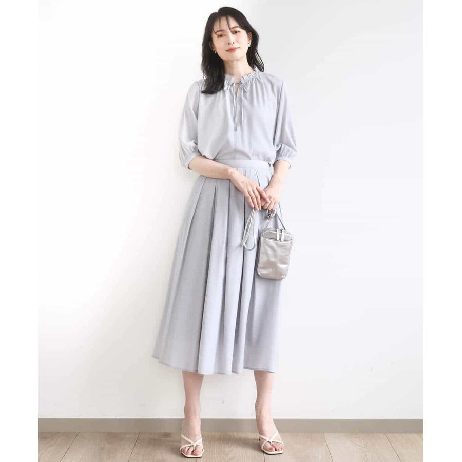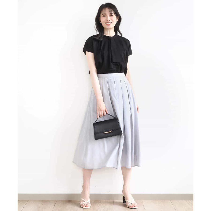 さりげないドット柄はコーディネートの邪魔をせず、さりげないアクセントに。オフィスシーンにも馴染みやすいきれいめな印象で履きこなせます。同素材のブラウスとセットアップでワンピース見えの着こなしもおすすめ。